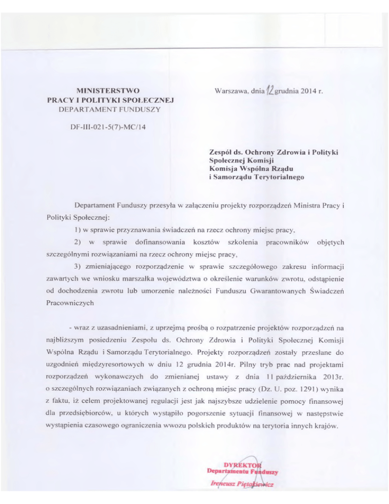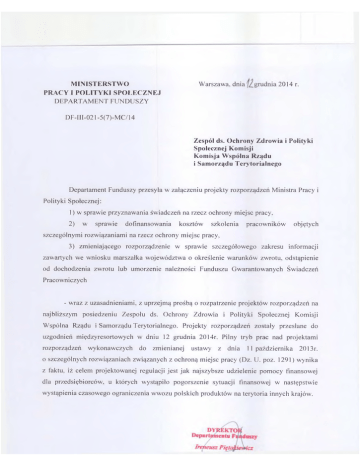 M IN ISTERSTW O PRACY I PO LITY K I SPO Ł E C Z N E J DEPARTAM ENT FUNDUSZY W arszawa, dnia 2 014 r. D F-III-021-5(7)-M C/14 Zespół ds. O chrony Zdrowia i Polity ki Społecznej Komisji Komisja W spólna Rządu i Sam orządu Terytorialnego Departament Funduszy przesyła w załączeniu projekty rozporządzeń M inistra Pracy i Polityki Społecznej: 1) w sprawie przyznawania świadczeń na rzecz ochrony miejsc pracy. 2) w sprawie dofinansow ania kosztów szkolenia pracow ników objętych szczególnymi rozwiązaniam i na rzecz ochrony miejsc pracy, 3) zm ieniającego rozporządzenie w sprawie szczegółow ego zakresu informacji zawartych we wniosku marszałka wojew ództw a o określenie warunków zw rotu, odstąpienie od dochodzenia zwrotu lub um orzenie należności Funduszu G warantow anych Świadczeń Pracowniczych - w raz z uzasadnieniam i, z uprzejm ą prośbą o rozpatrzenie projektów rozporządzeń na najbliższym posiedzeniu Zespołu ds. Ochrony Zdrow ia i Polityki Społecznej Komisji W spólna Rządu i Samorządu Terytorialnego. Projekty rozporządzeń zostały przesłane do uzgodnień m iędzyresortowych w dniu 12 grudnia 2014r. Pilny tryb prac nad projektami rozporządzeń wykonawczych do zmienianej ustawy z dnia 11 października 2013r. o szczególnych rozw iązaniach związanych z ochroną miejsc pracy (Dz. U. poz. 1291) wynika z faktu, iż celem projektowanej regulacji jest jak najszybsze udzielenie pomocy finansowej dla przedsiębiorców, u których wystąpiło pogorszenie sytuacji finansowej w następstwie wystąpienia czasow ego ograniczenia wwozu polskich produktów na terytoria innych krajów.