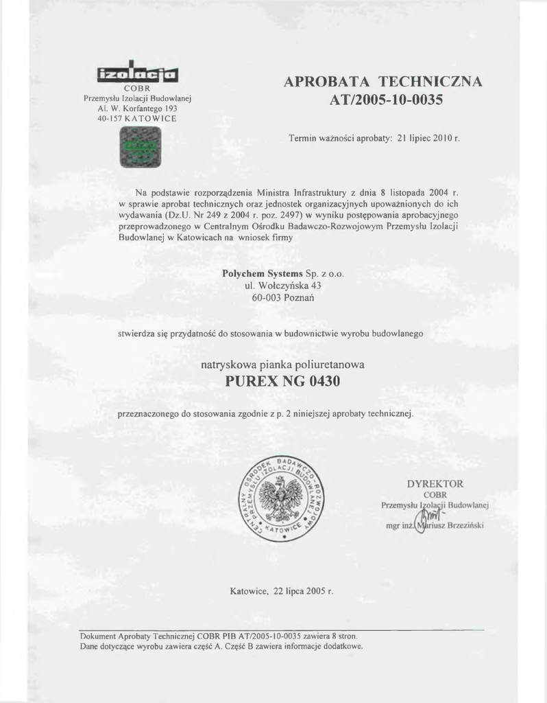 CO BR Przemysłu Izolacji Budowlanej Al. W. Korfantego 193 40-157 K A TO W IC E APROBATA TECHNICZNA AT/2005-10-0035 Termin ważności aprobaty: 21 lipiec 2010 r. Na podstawie rozporządzenia Ministra Infrastruktury z dnia 8 listopada 2004 r. w sprawie aprobat technicznych oraz jednostek organizacyjnych upoważnionych do ich wydawania (Dz.U. Nr 249 z 2004 r. poz. 2497) w wyniku postępowania aprobacyjnego przeprowadzonego w Centralnym Ośrodku Badawczo-Rozwojowym Przemysłu Izolacji Budowlanej w Katowicach na wniosek firmy Polychem Systems Sp. z o.o. ul. W ołczyńska 43 60-003 Poznań stwierdza się przydatność do stosowania w budownictwie wyrobu budowlanego natryskowa pianka poliuretanowa PUREX NG 0430 przeznaczonego do stosowania zgodnie z p. 2 niniejszej aprobaty technicznej. Katowice, 22 lipca 2005 r. Dokument Aprobaty Technicznej COBR PIB AT/2005-10-0035 zawiera 8 stron. Dane dotyczące wyrobu zawiera część A. Część B zawiera informacje dodatkowe. A T /2005-10-0035 str. 2 / 8 A. OPIS 1 Przedmiot aprobaty 1.1 Ogólna charakterystyka techniczna Przedmiotem aprobaty technicznej jest natryskowa pianka poliuretanowa PUREX NG 0430 produkowana przez Polychem Systems Sp. z o.o. / Poznań /. Natryskowa pianka poliuretanowa PUREX NG 0430 wytwarzana jest z dwóch ciekłych kom ponentów - składnika poliolowego i składnika izocjanianowego mieszanych w proporcji objętościowej 1:1. Natrysk pianki na izolowane powierzchnie odbywa się przy zastosowaniu wysokociśnienio wych maszyn natryskowych, gęstość pianki po natryśnięciu wynosi min. 42 kg/m 3. W yrób został oceniony pod względem higienicznym przez Państwowy Zakład Higieny. 1.2 Oznaczenie NATRYSKOW A PIANKA POLIURETANOW A PUREX NG 0430 AT/2005-10-0035 2 Przeznaczenie, zakres i warunki stosowania Natryskowa pianka poliuretanowa PUREX NG 0430 przeznaczona jest do wykonywania izolacji termicznej ścian i sufitów wewnątrz budynków oraz ścian na zewnątrz budynków (w przypadku izolacji na zewnątrz budynku konieczne jest zabezpieczenie ostatniej warstwy przed promienio waniem UV) w obiektach budownictwa przemysłowego, ogólnego i mieszkaniowego. Może być stosowana w obiektach istniejących lub nowo budowanych. Natrysk pianki na izolowane po wierzchnie odbywa się przy zastosowaniu wysokociśnieniowych urządzeń natryskowych. W przypadku stosowania wyrobu w budynkach, których dotyczą wymagania klas odporności pożarowej, element budynku w którym zastosowano wyrób powinien spełniać wymagania w zakresie klas odporności ogniowej oraz stopnia rozprzestrzeniania ognia. Wykonywanie prac z zastosowaniem natryskowej pianki poliuretanowej PUREX NG 0430 po winno odbywać się według projektu technicznego opracowanego zgodnie z przepisami budowla nymi, z uwzględnieniem szczegółowych wytycznych zawartych w instrukcjach producenta. W trakcie prac należy przestrzegać środków ostrożności przewidzianych odrębnymi przepisami. str. 3 / 8 AT/2005-10-0035 3 Wymagania 3.1 Surowce Właściwości surowców stosowanych do wytwarzania natryskowej pianki poliuretanowej PUREX NG 0430 oraz sposób ich sprawdzania powinny być określone w ramach zakłado wej kontroli produkcji. 3.2 Wyrób 3.2.1 Wygląd zewnętrzny Wyrób powinien być pianką o jednorodnej strukturze i drobnych porach, o słomkowożółtej barwie. Poszczególne warstwy pianki powinny przylegać do siebie, powierzchnia ostatniej warstwy powinna być równa, o fakturze skórki pomarańczowej. 3.2.2 Pozostałe wymagania Pozostałe wymagania odnośnie właściwości wyrobu podano w tablicy. Tablica L.p. i Właściwości 2 Wymagania Metody badań 3 4 1. Gęstość pozorna, kg/m3 nie mniej niż 42 PN-EN 1602:1999 2. Chłonność wody po 24 h, % (v/v) nie więcej niż 5 PN-93/C-89084 3. Stabilność wymiarów - zmiana wymiarów po 24 h w warunkach: - 85°C, % - 70°C i 95% wilgotności względnej, % nie więcej niż 3 4. Wytrzymałość na ściskanie, kPa nie mniej niż 180 5. Wytrzymałość na rozciąganie prostopadłe do powierzchni czo łowych*', kPa PN-EN 1604+AC:1999 nie więcej niż 5 PN-EN 826:1998 PN-EN 1607:1999 nie mniej niż 220 str. 4 / 8 AT/2005-10-0035 ciąg dalszy tablicy: 1 6. 7. 8. ** **’ 2 Wytrzymałość na rozciąganie prostopadłe do powierzchni czo łowych*+), kPa W spółczynnik przewodzenia ciepła w temperaturze 10°C, wartość deklarowana***', W/mK Zdolność samogaśnięcia 4 3 PN-EN 1607:1999 nie mniej niż 180 PN-ISO 8301:1998 PN-EN ISO 10456:2004 0,024 samogasnący PN-88/C-89297 rozciąganie rów noległe do kierunku wzrostu pianki pianka na płycie wiórowej, rozciąganie równoległe do kierunku wzrostu pianki ***> po ok. 1 m iesiącu sezonowania w warunkach: tem peratura (23± 2)°C i wilgotność względna (50± 5)% AT/2005-10-0035 str. 5 /8 4 Ocena zgodności Producent mający siedzibę na terytorium Rzeczypospolitej Polskiej powinien dokonać oceny zgodności i wydać, na swoją wyłączną odpowiedzialność, krajową deklarację zgodności z apro batą. Producent wyrobu budowlanego będącego przedmiotem niniejszej aprobaty technicznej doko nuje oceny zgodności według systemu 3 dla wszystkich zastosowań (w tym podlegającym wy maganiom dotyczącym reakcji na ogień). System 3 - deklarowanie zgodności wyrobu przez producenta na podstawie: a) wstępnego badania typu prowadzonego przez akredytowane laboratorium, b) zakładowej kontroli produkcji. Wydanie krajowej deklaracji zgodności pozwala na znakowanie wyrobu znakiem budowlanym i wprowadzenie go do obrotu. Sposoby deklarowania zgodności i znakowania znakiem budowla nym określają odpowiednie przepisy prawne 5 Zakładowa kontrola produkcji Producent powinien wprowadzić, udokumentować i utrzymywać zakładową kontrolę produkcji. Przez zakładową kontrolę produkcji należy rozumieć stałą wewnętrzną kontrolę produkcji pro wadzoną przez producenta, której wszystkie elementy, wymagania i postanowienia przyjęte przez producenta powinny być w sposób systematyczn