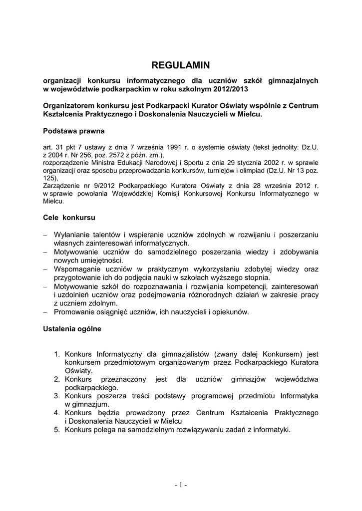 REGULAMIN organizacji konkursu informatycznego dla uczniów szkół gimnazjalnych w województwie podkarpackim w roku szkolnym 2012/2013 Organizatorem konkursu jest Podkarpacki Kurator Oświaty wspólnie z Centrum Kształcenia Praktycznego i Doskonalenia Nauczycieli w Mielcu. Podstawa prawna art. 31 pkt 7 ustawy z dnia 7 września 1991 r. o systemie oświaty (tekst jednolity: Dz.U. z 2004 r. Nr 256, poz. 2572 z późn. zm.), rozporządzenie Ministra Edukacji Narodowej i Sportu z dnia 29 stycznia 2002 r. w sprawie organizacji oraz sposobu przeprowadzania konkursów, turniejów i olimpiad (Dz.U. Nr 13 poz. 125), Zarządzenie nr 9/2012 Podkarpackiego Kuratora Oświaty z dnia 28 września 2012 r. w sprawie powołania Wojewódzkiej Komisji Konkursowej Konkursu Informatycznego w Mielcu. Cele konkursu Wyłanianie talentów i wspieranie uczniów zdolnych w rozwijaniu i poszerzaniu własnych zainteresowań informatycznych. Motywowanie uczniów do samodzielnego poszerzania wiedzy i zdobywania nowych umiejętności. Wspomaganie uczniów w praktycznym wykorzystaniu zdobytej wiedzy oraz przygotowanie ich do podjęcia nauki w szkołach wyższego stopnia. Motywowanie szkół do rozpoznawania i rozwijania kompetencji, zainteresowań i uzdolnień uczniów oraz podejmowania różnorodnych działań w zakresie pracy z uczniem zdolnym. Promowanie osiągnięć uczniów, ich nauczycieli i opiekunów. Ustalenia ogólne 1. Konkurs Informatyczny dla gimnazjalistów (zwany dalej Konkursem) jest konkursem przedmiotowym organizowanym przez Podkarpackiego Kuratora Oświaty. 2. Konkurs przeznaczony jest dla uczniów gimnazjów województwa podkarpackiego. 3. Konkurs poszerza treści podstawy programowej przedmiotu Informatyka w gimnazjum. 4. Konkurs będzie prowadzony przez Centrum Kształcenia Praktycznego i Doskonalenia Nauczycieli w Mielcu 5. Konkurs polega na samodzielnym rozwiązywaniu zadań z informatyki. -1- Organizacja Konkursu 1. Konkurs przeprowadza Wojewódzka Komisja Konkursowa Konkursu Informatycznego WKKKI (zwana dalej Komisją Konkursową) powołana przez Podkarpackiego Kuratora Oświaty. 2. Zakres wiedzy i umiejętności wymaganych w poszczególnych stopniach Konkursu oraz wykaz literatury dla uczestników zawarty jest w załączniku nr 2 do niniejszego Regulaminu. Przebieg Konkursu Konkurs jest trzyetapowy: I etap - szkolny, II etap - rejonowy, III etap - wojewódzki (finał). Harmonogram Konkursu zawarty jest w załączniku nr 1 do niniejszego Regulaminu. I etap – szkolny Za organizację i przeprowadzenie etapu szkolnego odpowiada dyrektor szkoły. Zadaniem dyrektora w zakresie organizacji etapu szkolnego będzie: zgłoszenie szkoły z liczbą uczestników, powołanie szkolnej komisji konkursowej, pobranie zadań i odpowiedzi I etapu ze strony Kuratorium (za pomocą ISOK) 1, zapewnienie prawidłowego przebiegu konkursu, przekazanie wyników, zapewnienie rzetelnego rozpatrzenia odwołań uczniów. Do II stopnia zostaną zakwalifikowani uczestnicy, którzy uzyskali najwyższe wyniki, ale nie więcej niż 150 uczniów. II etap - rejonowy on-line polega na samodzielnym rozwiązywaniu zadań konkursowych na platformie e-learningowej. Eliminacje odbędą się szkolnych pracowniach zakwalifikowanych uczniów i będą trwały 60 minut. Za sprawny przebieg II etapu Konkursu odpowiadają Szkolne Komisje Konkursowe powołane w tym celu przez Dyrektora szkoły. Uczestnicy II etapu wspólnie z nauczycielami- opiekunami, w terminie wskazanym w harmonogramie konkursu założą (lub przetestują) konta na platformie. Dwa tygodnie przed właściwym terminem konkursu zostanie przeprowadzona próba kont. Instrukcje na temat korzystania z kont oraz platformy e-learningowej zostaną umieszczone na stronach Kuratorium Oświaty http://www.ko.rzeszow.pl (w dziale: Konkursy przedmiotowe), na stronie głównej CKPiDN http://www.ckp.edu.pl/ oraz na stronie www Konkursu http://www.ckp.edu.pl/konkurs 1 Organizacja I etapu Konkursu przebiega identycznie jak organizacja innych konkursów przedmiotowych organizowanych przez Kuratorium Oświaty w Rzeszowie i omawia to § 4 Regulaminu organizacji konkursów przedmiotowych dla uczniów szkół podstawowych i gimnazjów w województwie podkarpackim w roku szkolnym 2012/2013 w dziale stopień – etap szkolny. -2- Login i hasło będzie stałym kluczem dostępu do platformy. Nieuprawnione wykorzystanie loginu i hasła przez osoby postronne nie podlega reklamacji. Zespół Zadaniowy powołany przez Komisję Konkursową oceni rozwiązania i przedstawi Komisji Konkursowej wyniki punktowe uczestników w postaci uporządkowanej listy wyników. Liczbę uczestników kwalifikowanych do zawodów III etapu (finału) ustala Komisja Konkursowa. Do III stopnia zostaną zakwalifikowani uczestnicy, którzy uzyskali najwyższe wyniki, ale nie więcej niż 45 uczniów. III etap - wojewódzki (finał) polega na samodzielnym rozwiązywaniu zadań w pracowni komputerowej Zawody odbędą się pracowniach komputerowych Centrum Kształcenia Praktycznego i Doskonalenia Nauczycieli w Mielcu i będą trwały 90 minut. Zespół Zadaniowy sprawdzi rozwiązania zawodników i przedstawi opracowane wyniki Komisji Konkursowej, która na tej podstawie wyłoni laureatów Konkursu. Wszystkie dane finalistów pozostaną zakodowane, aż do momentu sprawdzenia i oceny prac. Tytuł laureata konkursu organizowanego dla uczniów gimnazjów otrzymują uczestnicy etapu wojewódzkiego, którzy uzyskali najwyższe wyniki. Liczba laureatów nie może być większa niż 30. Liczba laureatów może być zwiększona, jeśli uczestnik etapu wojewódzkiego z pozycji 31 i następnych uzyskali taką samą liczbę punktów jak uczeń z pozycji 30. Decyzję o poszerzeniu listy laureatów podejmuje Przewodniczący Komisji Konkursowej. Tytuł finalisty konkursu, otrzymuje uczeń, który w eliminacjach wojewódzkich zdobył co najmniej 65% punktów możliwych do uzyskania i nie uzyskał tytułu laureata. Odwołania Od wyników II etapu ucz