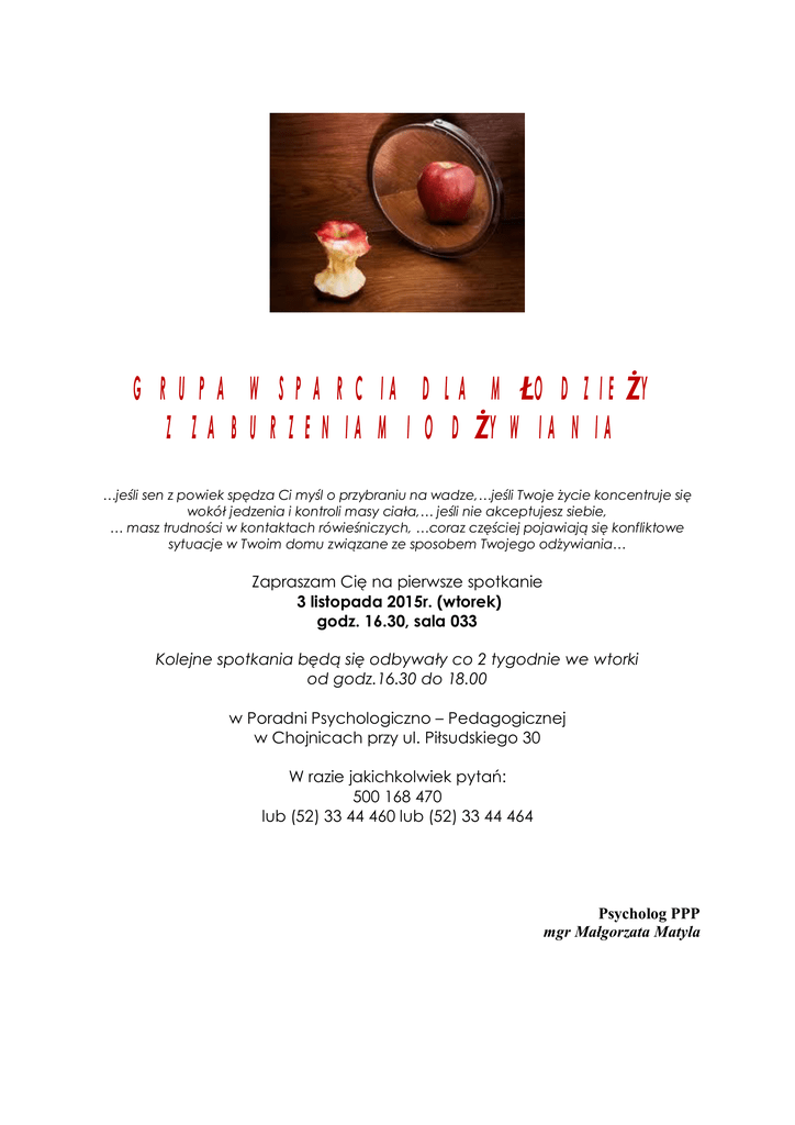 GRUPA WSPARCIA DLA M ODZIE Y Z ZABURZENIAMI OD YWIANIA …je li sen z powiek sp dza Ci my l o przybraniu na wadze,…je li Twoje ycie koncentruje si wokó jedzenia i kontroli masy cia a,… je li nie akceptujesz siebie, … masz trudno ci w kontaktach rówie niczych, …coraz cz ciej pojawiaj si konfliktowe sytuacje w Twoim domu zwi zane ze sposobem Twojego od ywiania… Zapraszam Ci na pierwsze spotkanie 3 listopada 2015r. (wtorek) godz. 16.30, sala 033 Kolejne spotkania b si odbywa y co 2 tygodnie we wtorki od godz.16.30 do 18.00 w Poradni Psychologiczno – Pedagogicznej w Chojnicach przy ul. Pi sudskiego 30 W razie jakichkolwiek pyta : 500 168 470 lub (52) 33 44 460 lub (52) 33 44 464 Psycholog PPP mgr Ma gorzata Matyla