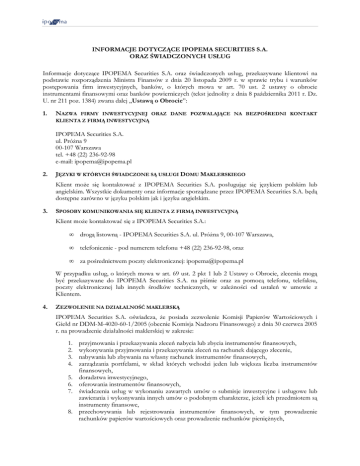 INFORMACJE DOTYCZĄCE IPOPEMA SECURITIES S.A. ORAZ ŚWIADCZONYCH USŁUG Informacje dotyczące IPOPEMA Securities S.A. oraz świadczonych usług, przekazywane klientowi na podstawie rozporządzenia Ministra Finansów z dnia 20 listopada 2009 r. w sprawie trybu i warunków postępowania firm inwestycyjnych, banków, o których mowa w art. 70 ust. 2 ustawy o obrocie instrumentami finansowymi oraz banków powierniczych (tekst jednolity z dnia 8 października 2011 r. Dz. U. nr 211 poz. 1384) zwana dalej „Ustawą o Obrocie”: 1. NAZWA FIRMY INWESTYCYJNEJ ORAZ DANE POZWALAJĄCE NA BEZPOŚREDNI KONTAKT KLIENTA Z FIRMĄ INWESTYCYJNĄ IPOPEMA Securities S.A. ul. Próżna 9 00-107 Warszawa tel. +48 (22) 236-92-98 e-mail: [email protected] 2. JĘZYKI W KTÓRYCH ŚWIADCZONE SĄ USŁUGI DOMU MAKLERSKIEGO Klient może się kontaktować z IPOPEMA Securities S.A. posługując się językiem polskim lub angielskim. Wszystkie dokumenty oraz informacje sporządzane przez IPOPEMA Securities S.A. będą dostępne zarówno w języku polskim jak i języku angielskim. 3. SPOSOBY KOMUNIKOWANIA SIĘ KLIENTA Z FIRMĄ INWESTYCYJNĄ Klient może kontaktować się z IPOPEMA Securities S.A.: • drogą listowną - IPOPEMA Securities S.A. ul. Próżna 9, 00-107 Warszawa, • telefonicznie - pod numerem telefonu +48 (22) 236-92-98, oraz • za pośrednictwem poczty elektronicznej: [email protected] W przypadku usług, o których mowa w art. 69 ust. 2 pkt 1 lub 2 Ustawy o Obrocie, zlecenia mogą być przekazywane do IPOPEMA Securities S.A. na piśmie oraz za pomocą telefonu, telefaksu, poczty elektronicznej lub innych środków technicznych, w zależności od ustaleń w umowie z Klientem. 4. ZEZWOLENIE NA DZIAŁALNOŚĆ MAKLERSKĄ IPOPEMA Securities S.A. oświadcza, że posiada zezwolenie Komisji Papierów Wartościowych i Giełd nr DDM-M-4020-60-1/2005 (obecnie Komisja Nadzoru Finansowego) z dnia 30 czerwca 2005 r. na prowadzenie działalności maklerskiej w zakresie: 1. 2. 3. 4. 5. 6. 7. 8. przyjmowania i przekazywania zleceń nabycia lub zbycia instrumentów finansowych, wykonywania przyjmowania i przekazywania zleceń na rachunek dającego zlecenie, nabywania lub zbywania na własny rachunek instrumentów finansowych, zarządzania portfelami, w skład których wchodzi jeden lub większa liczba instrumentów finansowych, doradztwa inwestycyjnego, oferowania instrumentów finansowych, świadczenia usług w wykonaniu zawartych umów o submisje inwestycyjne i usługowe lub zawierania i wykonywania innych umów o podobnym charakterze, jeżeli ich przedmiotem są instrumenty finansowe, przechowywania lub rejestrowania instrumentów finansowych, w tym prowadzenie rachunków papierów wartościowych oraz prowadzenie rachunków pieniężnych, 9. doradztwa dla przedsiębiorstw w zakresie struktury kapitałowej, strategii przedsiębiorstwa lub innych zagadnień związanych z taką strukturą lub strategią, 10. sporządzanie analiz inwestycyjnych, analiz finansowych oraz innych rekomendacji o charakterze ogólnym dotyczących transakcji w zakresie instrumentów finansowych Dom Maklerski podlega nadzorowi Komisji Nadzoru Finansowego. Komisja Nadzoru Finansowego 00-950 Warszawa, Plac Powstańców Warszawy 1 5. DZIAŁANIE ZA POŚREDNICTWEM AGENTA W przypadku rynku regulowanego prowadzonego przez Giełdę Papierów Wartościowych w Budapeszcie usługi maklerskie świadczone są za pośrednictwem Agentów Firmy Inwestycyjnej. 6. WSKAZANIE SZCZEGÓŁOWYCH ZASAD ŚWIADCZENIA USŁUG Szczegółowe zasady świadczenia usług są zawarte w regulaminie świadczenia usług maklerskich1. 7. WSKAZANIE PODSTAWOWYCH ZASAD ZAŁATWIANIA PRZEZ FIRMĘ INWESTYCYJNĄ SKARG KLIENTÓW SKŁADANYCH W ZWIĄZKU ZE ŚWIADCZONĄ USŁUGĄ MAKLERSKĄ Zasady załatwiania przez firmę inwestycyjną skarg klientów są zawarte w regulaminie świadczenia usług maklerskich. 8. WSKAZANIE PODSTAWOWYCH ZASAD POSTĘPOWANIA FIRMY INWESTYCYJNEJ W PRZYPADKU POWSTANIA KONFLIKTU INTERESÓW Zasady postępowania IPOPEMA Securities S.A. w przypadku powstania konfliktu interesów zostały określone w „Polityce w zakresie zarządzania konfliktem interesów w IPOPEMA Securities S.A. 9. WSKAZANIE ZAKRESU, CZĘSTOTLIWOŚCI I TERMINÓW RAPORTÓW ZE ŚWIADCZENIA USŁUGI MAKLERSKIEJ, PRZEKAZYWANYCH KLIENTOWI PRZEZ FIRMĘ INWESTYCYJNĄ Zakres, częstotliwość i terminy raportów dotyczących świadczenia danych usług, przekazywanych klientowi przez IPOPEMA Securities S.A., zawarte są w regulaminie świadczenia usług maklerskich. 10. WSKAZANIE KOSZTÓW I OPŁAT W ZWIĄZKU Z USŁUGĄ MAKLERSKĄ Z tytułu świadczenia danych usług maklerskich, klient będzie ponosił na rzecz IPOPEMA Securities S.A. wynagrodzenie na zasadach określonych w usług umowie zawieranej z klientem o świadczenie tych usług. Klient może ponosić koszty związane z prowadzeniem przez podmioty trzecie rachunku papierów wartościowych i rachunku pieniężnego służącego do jego obsługi, a także koszty związane z zawieraniem transakcji za pośrednictwem ww. podmiotu. 11. INFORMACJA O INSTRUMENTACH FINANSOWYCH ORAZ O RYZYKACH ZWIĄZANYCH Z INWESTOWANIEM W TE INSTRUMENTY FINANSOWE Akcje Udziałowy papier wartościowy emitowany przez spółkę akcyjną lub spółkę komandytowo-akcyjną , który inkorporuje ogół praw przysługujących akcjonariuszowi względem spółki, w tym m.in.: prawo do udziału w zyskach spółki w formie dywidendy prawo głosu na walnym zgromadzeniu; prawo do 1 Regulamin świadczenia usług maklerskich – pojęcie odnosi się do poszczególnych regulaminów dotyczących świadczenia danej usługi maklerskiej. podziału majątku spółki w razie jej likwidacji. W przypadku publicznych spółek akcyjnych przedmiotem obrotu na rynku zorganizowanym mogą być jedynie akcje niemające formy materialnej, istniejące w postaci zapisu elektronicznego na rachunku papieru wartościowych. Prawa do akcji Papier wartościowy przysługujący inwestorowi, który nabył akcje nowej emisji