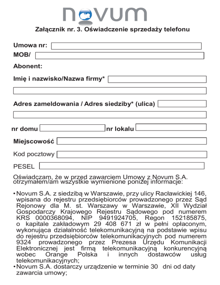 Załącznik nr. 3. Oświadczenie sprzedaży telefonu Umowa nr: MOB/ Abonent: Imię i nazwisko/Nazwa firmy* Adres zameldowania / Adres siedziby* (ulica) nr domu nr lokalu Miejscowość Kod pocztowy PESEL Oświadczam, że w przed zawarciem Umowy z Novum S.A. otrzymałem/am wszystkie wymienione poniżej informacje: • Novum S.A. z siedzibą w Warszawie, przy ulicy Racławickiej 146, wpisana do rejestru przedsiębiorców prowadzonego przez Sąd Rejonowy dla M. st. Warszawy w Warszawie, XII Wydział Gospodarczy Krajowego Rejestru Sądowego pod numerem KRS 0000368094, NIP 9491924705, Regon 152185875, o kapitale zakładowym 29 408 671 zł w pełni opłaconym, wykonująca działalność telekomunikacyjną na podstawie wpisu do rejestru przedsiębiorców telekomunikacyjnych pod numerem 9324 prowadzonego przez Prezesa Urzędu Komunikacji Elektronicznej jest firmą telekomunikacyjną konkurencyjną wobec Orange Polska i innych dostawców usług telekomunikacyjnych; • Novum S.A. dostarczy urządzenie w terminie 30 dni od daty zawarcia umowy; • Novum S.A. stosuje procedurę reklamacyjną w zakresie zgłoszeń związanych z uprawnieniami wynikającymi z rękojmi, zgodnie z którą: 1. Abonent może złożyć reklamację: a) ustnie – osobiście do protokołu w Biurze Obsługi Klienta przy ul. Przemysłowej 1, 07-411 Rzekuń albo telefonicznie pod numerem telefonu 0 801 048 048, b) w formie pisemnej - osobiście w Biurze Obsługi Klienta albo przesyłką pocztową na adres Novum S.A., ul. Przemysłowa 1, 07-411 Rzekuń. 2. Uprawnienia wynikające z rękojmi wygasają z upływem 2 lat od daty wydania urządzenia. Roszczenie o usunięcie wady lub wymianę rzeczy sprzedanej na wolną od wad przedawnia się z upływem roku, licząc od dnia stwierdzenia wady. 3. Jeżeli Konsument zażąda wymiany rzeczy lub usunięcia wady albo złożył oświadczenie o obniżeniu ceny, określając kwotę, o którą cena ma być obniżona, a Novum S.A. nie ustosunkuje się do tego żądania w terminie czternastu dni, uważa się, że żądanie to uznał za uzasadnione. • Novum S.A. zobowiązana jest do dostarczenia urządzenia bez wad; • W ramach usług posprzedażnych Novum S.A. udziela informacji dotyczących urządzenia, przyjmuje reklamacje, udziela informacji odnośnie obsługi urządzenia oraz dokonuje konserwacji i napraw; • Producent urządzenia udziela gwarancji począwszy od daty zakupu przez pierwszego użytkownika końcowego na następujących warunkach: a. 24 miesiące na urządzenie (telefon), b. 6 miesięcy na części i akcesoria ulegające zużyciu, np. baterię, ładowarkę czy zestaw słuchawkowy, c. usterki urządzenia ujawnione w okresie gwarancyjnym będą bezpłatnie usuwane w terminie 14 dni roboczych od daty dostarczenia urządzenia do autoryzowanego serwisu Producenta. d. okres gwarancji ulega przedłużeniu o czas, jaki produkt spędzi w serwisie, e. warunkiem wykonania naprawy jest dostarczenie produktu z prawidłowo wypełnioną kartą gwarancyjną, dowodem zakupu i opisem usterki, f. wykonywanie napraw, w tym ingerencję w oprogramowanie przez osoby nieupoważnione jest podstawą do odmowy naprawy w ramach gwarancji, g. gwarancja nie obejmuje: a) normalnego zużycia, w tym baterii (akumulatorów), b) uszkodzeń mechanicznych, termicznych, chemicznych i wywołanych nimi wadami, c) problemów związanych ze współpracą sprzętu z urządzeniami i akcesoriami innych producentów, d) czynności związanych z konfiguracją i obsługą urządzenia opisanych w instrukcji obsługi, e) uszkodzeń i wad powstałych na skutek: i. niewłaściwego lub niezgodnego z instrukcją obsługi użytkowania, ii. przepięć w sieci energetycznej lub telefonicznej, wyładowań atmosferycznych, nieprawidłowego napięcia zasilającego, iii. zamoczenia cieczą, iv. transportu. h. Szczegółowe warunki gwarancji w tym adres serwisu Producenta znajdują się w Karcie Gwarancyjnej. i. decyzję o ewentualnej wymianie sprzętu lub zwrocie gotówki podejmuje autoryzowany serwis lub sprzedawca po konsultacji z serwisem, j. niewłaściwie lub nieczytelnie wypełniona karta gwarancyjna jest nieważna, k. naruszenie plomb, uszkodzenie numerów seryjnych urządzenia unieważnia zawartą umowę gwarancyjną na zakupiony sprzęt, l. Producent nie ponosi odpowiedzialności za utratę oprogramowania lub danych przechowywanych w urządzeniu podczas naprawy sprzętu. Zaleca się regularne wykonywanie kopii bezpieczeństwa oprogramowania i danych, m. gwarancja nie nadaje kupującemu prawa do domagania się zwrotu utraconych zysków związanych z uszkodzeniem urządzenia oraz strat związanych z utratą danych na dysku twardym oraz innych nośnikach danych. • w przypadku zwrotu urządzenia w ramach odstąpienia od Umowy Konsument zobowiązany jest ponieść jego koszty. Koszt wysyłki urządzenia w przypadku Poczty Polskiej S.A. wynosi 8,30 zł brutto; • Konsument może dochodzić roszczeń w postępowaniu mediacyjnym, prowadzonym przez Prezesa UKE lub przed stałym polubownym sądem konsumenckim przy Prezesie UKE, o których mowa w art. 109 i art. 110 Prawa Telekomunikacyjnego; w celu skorzystania z tych procedur należy zgłosić się ze stosownym wnioskiem do Prezesa UKE; • Otrzymałem/am wszystkie elementy wyposażenia urządzenia oraz sporządzone w języku polskim instrukcje obsługi i konserwacji. Ponadto oświadczam, że przed zawarciem umowy zostałem poinformowany w sposób rzetelny, jasny i zrozumiały o: • prawie do odstąpienia od Umowy zawartej poza lokalem przedsiębiorstwa/na odległość, bez podawania przyczyn i bez ponoszenia kosztów, z wyjątkiem kosztów określonych w art. 33, art. 34 ust. 2 i art. 35 w ustawie z dnia 30 maja 2014 r. o prawach konsumenta (Dz. U. z 2014 r. poz. 827), w terminie 14 (czternastu) dni od dnia wydania urządzenia oraz otrzymałem wzór oświadczenia o odstąpieniu; • skutkach rozwiązania Umowy o świadczenie Usług telekomunikacyjnych, w tym o konieczności zapła