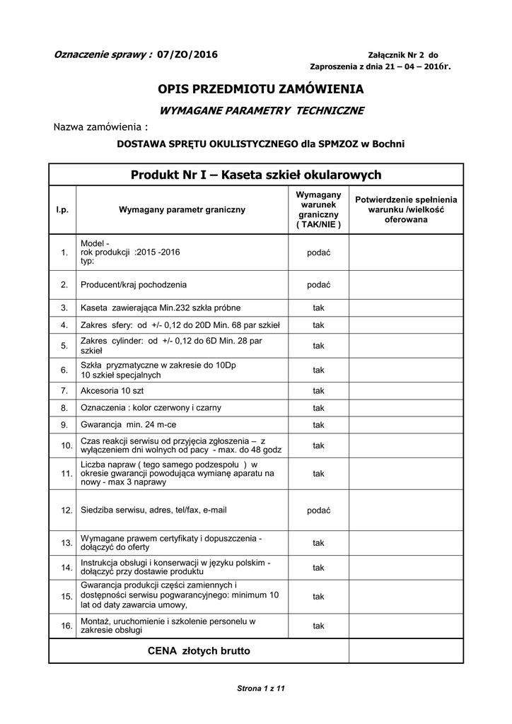 Oznaczenie sprawy : 07/ZO/2016 Załącznik Nr 2 do Zaproszenia z dnia 21 – 04 – 2016r. OPIS PRZEDMIOTU ZAMÓWIENIA WYMAGANE PARAMETRY TECHNICZNE Nazwa zamówienia : DOSTAWA SPRĘTU OKULISTYCZNEGO dla SPMZOZ w Bochni Produkt Nr I – Kaseta szkieł okularowych l.p. Wymagany parametr graniczny Wymagany warunek graniczny ( TAK/NIE ) 1. Model rok produkcji :2015 -2016 typ: podać 2. Producent/kraj pochodzenia podać 3. Kaseta zawierająca Min.232 szkła próbne tak 4. Zakres sfery: od +/- 0,12 do 20D Min. 68 par szkieł tak 5. Zakres cylinder: od +/- 0,12 do 6D Min. 28 par szkieł tak 6. Szkła pryzmatyczne w zakresie do 10Dp 10 szkieł specjalnych tak 7. Akcesoria 10 szt tak 8. Oznaczenia : kolor czerwony i czarny tak 9. Gwarancja min. 24 m-ce tak Czas reakcji serwisu od przyjęcia zgłoszenia – z 10. wyłączeniem dni wolnych od pacy - max. do 48 godz tak Liczba napraw ( tego samego podzespołu ) w 11. okresie gwarancji powodująca wymianę aparatu na nowy - max 3 naprawy tak 12. Siedziba serwisu, adres, tel/fax, e-mail podać Wymagane prawem certyfikaty i dopuszczenia 13. dołączyć do oferty tak Instrukcja obsługi i konserwacji w języku polskim 14. dołączyć przy dostawie produktu tak Gwarancja produkcji części zamiennych i 15. dostępności serwisu pogwarancyjnego: minimum 10 lat od daty zawarcia umowy, tak Montaż, uruchomienie i szkolenie personelu w 16. zakresie obsługi tak CENA złotych brutto Strona 1 z 11 Potwierdzenie spełnienia warunku /wielkość oferowana Produkt Nr II – Oprawki okularowe próbne l.p. Wymagany parametr graniczny Wymagany warunek graniczny ( TAK/NIE ) 1. Model rok produkcji :2015 -2016 typ: podać 2. Producent/kraj pochodzenia podać 3. Regulacja rozstaw źrenic tak 4. Max. ilość szkieł w tarczy oprawy - 4 tak 5. Możliwość regulacji kątów, długości nanośnika i zauszników tak 6. Uniwersalne: dla dorosłych i dla dzieci tak 7. Gwarancja min. 24 m-ce tak 8. Czas reakcji serwisu od przyjęcia zgłoszenia – z wyłączeniem dni wolnych od pacy - max. do 48 godz tak 9. Liczba napraw ( tego samego podzespołu ) w okresie gwarancji powodująca wymianę aparatu na nowy - max 3 naprawy tak 10. Siedziba serwisu, adres, tel/fax, e-mail Potwierdzenie spełnienia warunku /wielkość oferowana podać Wymagane prawem certyfikaty i dopuszczenia 11. dołączyć do oferty tak Instrukcja obsługi i konserwacji w języku polskim 12. dołączyć przy dostawie produktu tak Gwarancja produkcji części zamiennych i 13. dostępności serwisu pogwarancyjnego: minimum 10 lat od daty zawarcia umowy, tak Montaż, uruchomienie i szkolenie personelu w 14. zakresie obsługi tak CENA złotych brutto Produkt Nr III – Lampa szczelinowa l.p. Wymagany parametr graniczny Strona 2 z 11 Wymagany warunek graniczny ( TAK/NIE ) Potwierdzenie spełnienia warunku /wielkość oferowana 1. Model rok produkcji :2015 -2016 typ: podać 2. Producent/kraj pochodzenia podać 3. Źródło światła – dioda LED tak 4. Układ optyczny: typ Zeiss tak 5. Powiększenie obrazu (krotność) - 10x; 16x; 25x tak 6. Wysokość szczeliny - 14mm tak 7. Soczewka 78D tak 8. Soczewka trójzwierciadlana typ Goldmann tak 9. Filtr niebieski tak 10. Filtr bezczerwienny tak 11. Filtr barwy ciepłej tak 12. Możliwość rozbudowy o tonometr aplanacyjny tak Podstawa lampy zintegrowana z podbródkiem, w 13. konstrukcji nośnej nie wykorzystująca blatu stolika tak Możliwość rozbudowy o system cyfrowy z 14. przyciskiem synchronizacji w yosticku tak Załączanie i regulacja natężenia światła w podstawie 15. wózka jezdnego lampy tak 16. Możliwość rozbudowy o tonometr aplanacyjny tak 17. Gwarancja min. 24 m-ce tak Czas reakcji serwisu od przyjęcia zgłoszenia – z 18. wyłączeniem dni wolnych od pacy - max. do 48 godz tak Liczba napraw ( tego samego podzespołu ) w 19. okresie gwarancji powodująca wymianę aparatu na nowy - max 3 naprawy tak 20. Siedziba serwisu, adres, tel/fax, e-mail podać Wymagane prawem certyfikaty i dopuszczenia 21. dołączyć do oferty tak Instrukcja obsługi i konserwacji w języku polskim 22. dołączyć przy dostawie produktu tak Gwarancja produkcji części zamiennych i 23. dostępności serwisu pogwarancyjnego: minimum 10 lat od daty zawarcia umowy, tak Montaż, uruchomienie i szkolenie personelu w 24. zakresie obsługi tak CENA złotych brutto Strona 3 z 11 Produkt Nr IV – Tonometr aplanacyjny l.p. Wymagany parametr graniczny Wymagany warunek graniczny ( TAK/NIE ) 1. Model rok produkcji :2015 -2016 typ: podać 2. Producent/kraj pochodzenia podać 3. Kompatybilny do oferowanej lampy szczelinowej ( produkt Nr III ) odchylanej prawo - lewo tak 4. Zakres pomiarowy - min. 0 – 60 mmg Hg tak 5. Wersja zawieszana tak 6. Gwarancja min. 24 m-ce tak 7. Czas reakcji serwisu od przyjęcia zgłoszenia – z wyłączeniem dni wolnych od pacy - max. do 48 godz tak 8. Liczba napraw ( tego samego podzespołu ) w okresie gwarancji powodująca wymianę aparatu na nowy - max 3 naprawy tak 9. Siedziba serwisu, adres, tel/fax, e-mail Potwierdzenie spełnienia warunku /wielkość oferowana podać Wymagane prawem certyfikaty i dopuszczenia 10. dołączyć do oferty tak Instrukcja obsługi i konserwacji w języku polskim 11. dołączyć przy dostawie produktu tak Gwarancja produkcji części zamiennych i 12. dostępności serwisu pogwarancyjnego: minimum 10 lat od daty zawarcia umowy, tak Montaż, uruchomienie i szkolenie personelu w 13. zakresie obsługi tak CENA złotych brutto Produkt Nr V – Perymetr komputerowy statyczny l.p. Wymagany parametr graniczny Wymagany warunek graniczny ( TAK/NIE ) 1. Model rok produkcji :2015 -2016 typ: podać 2. Producent/kraj pochodzenia podać Strona 4 z 11 Potwierdzenie spełnienia warunku /wielkość oferowana WYMAGANIA OGÓLNE 3. PROGRAM BADAŃ 1) Pełna do 50° tak 2) Centralne do 30° tak 3) Centralne 24° z rozszerzeniem do 30°nosowo tak 4) Centralne 22° pionowo i 30°poziomo tak 5) Peryferyjne 30° – 50° tak 6) Plamkowe do 10° tak 7) 