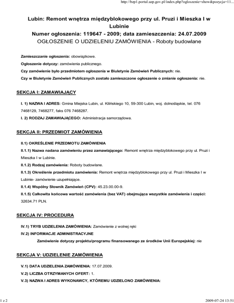 1z2 http://bzp1.portal.uzp.gov.pl/index.php?ogloszenie=show&pozycja=11... Lubin: Remont wnętrza międzyblokowego przy ul. Pruzi i Mieszka I w Lubinie Numer ogłoszenia: 119647 - 2009; data zamieszczenia: 24.07.2009 OGŁOSZENIE O UDZIELENIU ZAMÓWIENIA - Roboty budowlane Zamieszczanie ogłoszenia: obowiązkowe. Ogłoszenie dotyczy: zamówienia publicznego. Czy zamówienie było przedmiotem ogłoszenia w Biuletynie Zamówień Publicznych: nie. Czy w Biuletynie Zamówień Publicznych zostało zamieszczone ogłoszenie o zmianie ogłoszenia: nie. SEKCJA I: ZAMAWIAJĄCY I. 1) NAZWA I ADRES: Gmina Miejska Lubin, ul. Kilińskiego 10, 59-300 Lubin, woj. dolnośląskie, tel. 076 7468129, 7468277, faks 076 7468287. I. 2) RODZAJ ZAMAWIAJĄCEGO: Administracja samorządowa. SEKCJA II: PRZEDMIOT ZAMÓWIENIA II.1) OKREŚLENIE PRZEDMOTU ZAMÓWIENIA II.1.1) Nazwa nadana zamówieniu przez zamawiającego: Remont wnętrza międzyblokowego przy ul. Pruzi i Mieszka I w Lubinie. II.1.2) Rodzaj zamówienia: Roboty budowlane. II.1.3) Określenie przedmiotu zamówienia: Remont wnętrza międzyblokowego przy ul. Pruzi i Mieszka I w Lubinie- zamówienie uzupełniające. II.1.4) Wspólny Słownik Zamówień (CPV): 45.23.00.00-9. II.1.5) Całkowita końcowa wartość zamówienia (bez VAT) obejmująca wszystkie zamówienia i części: 32634.71 PLN. SEKCJA IV: PROCEDURA IV.1) TRYB UDZIELENIA ZAMÓWIENIA: Zamówienie z wolnej ręki IV.2) INFORMACJE ADMINISTRACYJNE Zamówienie dotyczy projektu/programu finansowanego ze środków Unii Europejskiej: nie SEKCJA V: UDZIELENIE ZAMÓWIENIA V.1) DATA UDZIELENIA ZAMÓWIENIA: 17.07.2009. V.2) LICZBA OTRZYMANYCH OFERT: 1. V.3) NAZWA I ADRES WYKONAWCY, KTÓREMU UDZIELONO ZAMÓWIENIA: 2009-07-24 13:51 2z2 http://bzp1.portal.uzp.gov.pl/index.php?ogloszenie=show&pozycja=11... PBU BUDGAR, UL. M. SKŁODOWSKIEJ-CURIE 97, 59-300 Lubin, kraj/woj. dolnośląskie. V.4) INFORMACJA O CENIE WYBRANEJ OFERTY ORAZ O NIE PODLEGAJĄCYCH ODRZUCENIU OFERTACH Z NAJNIŻSZĄ I NAJWYŻSZĄ CENĄ (bez VAT) Cena wybranej oferty: 32634.71 Oferta z najniższą ceną: 32634.71 oferta z najwyższą ceną: 32634.71 Waluta: PLN. 2009-07-24 13:51
