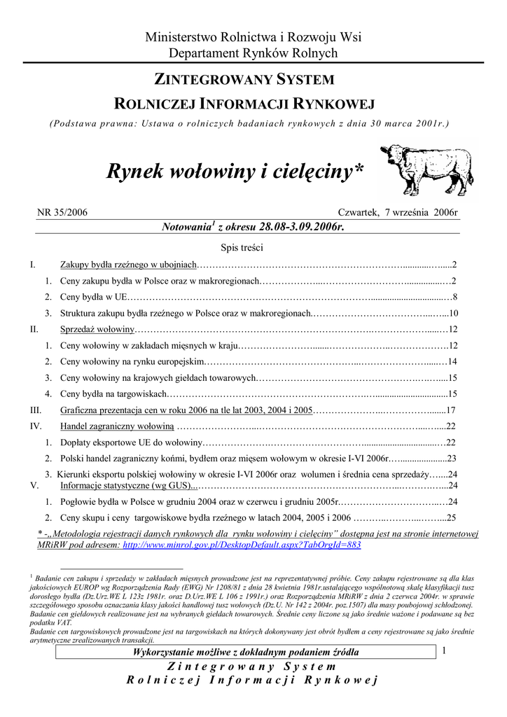 Ministerstwo Rolnictwa i Rozwoju Wsi Departament Rynków Rolnych ZINTEGROWANY SYSTEM ROLNICZEJ INFORMACJI RYNKOWEJ ( Podsta wa pra wna : Usta wa o rolnicz ych bad aniach rynko wych z dnia 30 marca 2001r.) Rynek wołowiny i cielęciny* NR 35/2006 Czwartek, 7 września 2006r 1 Notowania z okresu 28.08-3.09.2006r. Spis treści I. Zakupy bydła rzeźnego w ubojniach…………………………………………………………............….....2 1. Ceny zakupu bydła w Polsce oraz w makroregionach………………...………………………...............…2 2. Ceny bydła w UE……………………………………………………………………...............................…8 3. Struktura zakupu bydła rzeźnego w Polsce oraz w makroregionach.………………………………...…...10 II. Sprzedaż wołowiny………………………………………………………………….……………….....…12 1. Ceny wołowiny w zakładach mięsnych w kraju…………………….......………………..……………….12 2. Ceny wołowiny na rynku europejskim…………………………………………...………………….....…14 3. Ceny wołowiny na krajowych giełdach towarowych…………………………………………….….…....15 4. Ceny bydła na targowiskach……………………………………………………….…...............................15 III. Graficzna prezentacja cen w roku 2006 na tle lat 2003, 2004 i 2005…………………..…………….......17 IV. Handel zagraniczny wołowiną ……………………...……………………………………………....…....22 1. Dopłaty eksportowe UE do wołowiny………………….…………………………...............................…22 2. Polski handel zagraniczny końmi, bydłem oraz mięsem wołowym w okresie I-VI 2006r.…....................23 V. 3. Kierunki eksportu polskiej wołowiny w okresie I-VI 2006r oraz wolumen i średnia cena sprzedaży…....24 Informacje statystyczne (wg GUS)...………………………………………………………...……….…...24 1. Pogłowie bydła w Polsce w grudniu 2004 oraz w czerwcu i grudniu 2005r.…………………………..…24 2. Ceny skupu i ceny targowiskowe bydła rzeźnego w latach 2004, 2005 i 2006 ………..………...……...25 * -„Metodologia rejestracji danych rynkowych dla rynku wołowiny i cielęciny” dostępna jest na stronie internetowej MRiRW pod adresem: http://www.minrol.gov.pl/DesktopDefault.aspx?TabOrgId=883 1 Badanie cen zakupu i sprzedaży w zakładach mięsnych prowadzone jest na reprezentatywnej próbie. Ceny zakupu rejestrowane są dla klas jakościowych EUROP wg Rozporządzenia Rady (EWG) Nr 1208/81 z dnia 28 kwietnia 1981r.ustalającego wspólnotową skalę klasyfikacji tusz dorosłego bydła (Dz.Urz.WE L 123z 1981r. oraz D.Urz.WE L 106 z 1991r.) oraz Rozporządzenia MRiRW z dnia 2 czerwca 2004r. w sprawie szczegółowego sposobu oznaczania klasy jakości handlowej tusz wołowych (Dz.U. Nr 142 z 2004r. poz.1507) dla masy poubojowej schłodzonej. Badanie cen giełdowych realizowane jest na wybranych giełdach towarowych. Średnie ceny liczone są jako średnie ważone i podawane są bez podatku VAT. Badanie cen targowiskowych prowadzone jest na targowiskach na których dokonywany jest obrót bydłem a ceny rejestrowane są jako średnie arytmetyczne zrealizowanych transakcji. Wykorzystanie możliwe z dokładnym podaniem źródła Zintegrowany System Rolniczej Informacji Rynkowej 1 Departament Rynków Rolnych I. 1.1 Zakupy bydła rzeźnego w ubojniach Ceny zakupu bydła rzeźnego w Polsce. Tablica 1. Zbiorcze zestawienie danych dotyczących zakupionego bydła rzeźnego w ubojniach w kraju Średnia tuszy CENA SKUPU wg w.ż.* [zł/kg] Kategoria bydła Bydło ogółem buhajki buhaje wolce krowy jałówki dla mpc** [zł/tonę] dla mps** [zł/tonę] Zmiana ceny [%} 2006-09-03 2006-09-03 2006-09-03 tygodn. masa ciepłej Liczba sztuk [kg] roczna Struktura skupu [%] Zmiana tyg. [%] 2006-09-03 Zmiana Zmiana tyg. 2006-09-03 [w pkt.%] tyg. [%] 4,33 8 312 8 478 0,8 0,9 281,5 -1,0 9,4 100,0 - 5,10 9 276 9 462 1,4 3,7 313,2 -0,1 4,7 43,2 -1,9 4,92 9 470 9 659 2,4 8,0 375,0 -1,6 -12,2 0,5 -0,1 0,0 0,0 37,9 1,2 3,41 7 139 7 282 0,5 259,6 -5,1 -1,8 12,9 4,21 7 936 8 094 2,1 249,7 0,9 15,0 18,4 0,9 1,2 * - jest to cena netto zapłacona dostawcom bydła za dostarczony do rzeźni pełnowartościowy żywiec wołowy na bazie franco zakład czyli wraz z kosztami transportu dostawcy jak i rzeźni jeśli poniosła ona koszty transportu związane z zakupem żywca. Cena ta zawiera również wszelkie dodatkowe płatności (premie, nagrody itp.) niezależnie od okresu w jakim zostały wypłacone. **- w.ż.- waga żywa ( cenę za wagę żywą wyliczono stosując średnie wskaźniki wydajności rzeźnej uzyskane Polsce w roku 2005: bydło ogółem-0,521, buhajki–0,550, buhaje–0,520, wolce-0,540, krowy -0,478, jałówki-0,530), mpc - masa poubojowa ciepła, mps - masa poubojowa schłodzona ***- z uwagi na ustawowy obowiązek nieidentyfikalności danych, ceny nie podano, ****- z uwagi na brak porównywalności danych w obecnym tygodniu, danych nie podano Tablica 2. Cena zakupu i cena skupu bydła rzeźnego ogółem (bez cieląt) w Polsce wg miesięcy w roku 2006. Kategoria ceny/miesiąc I II III IV V VI VII VIII IX Cena zakupu ( cena „na wejściu” do ubojni)* 4,01 4,21 4,36 4,40 4,43 4,51 4,37 4,33 Cena skupu (cena producenta żywca)** 3,93 4,12 4,18 4,19 4,17 4,23 4,10 X XI XII * - średnia cena za bydło rzeźne ogółem zapłacona dostawcy bydła do rzeźni (badana w MRiRW) **- średnia cena za bydło rzeźne ogółem uzyskana ze sprzedaży żywca wołowego przez producentów bydła (badana w GUS) Rys. 1. Średnie krajowe ceny zakupu bydła rzeźnego wg kategorii bydła w przeliczeniu na wagę żywą (w.ż.) z ł/k g w .ż . 5 5 4 4 4 4 4 3 3 3 3 ,2 ,0 ,8 ,6 ,4 ,2 ,0 ,8 ,6 ,4