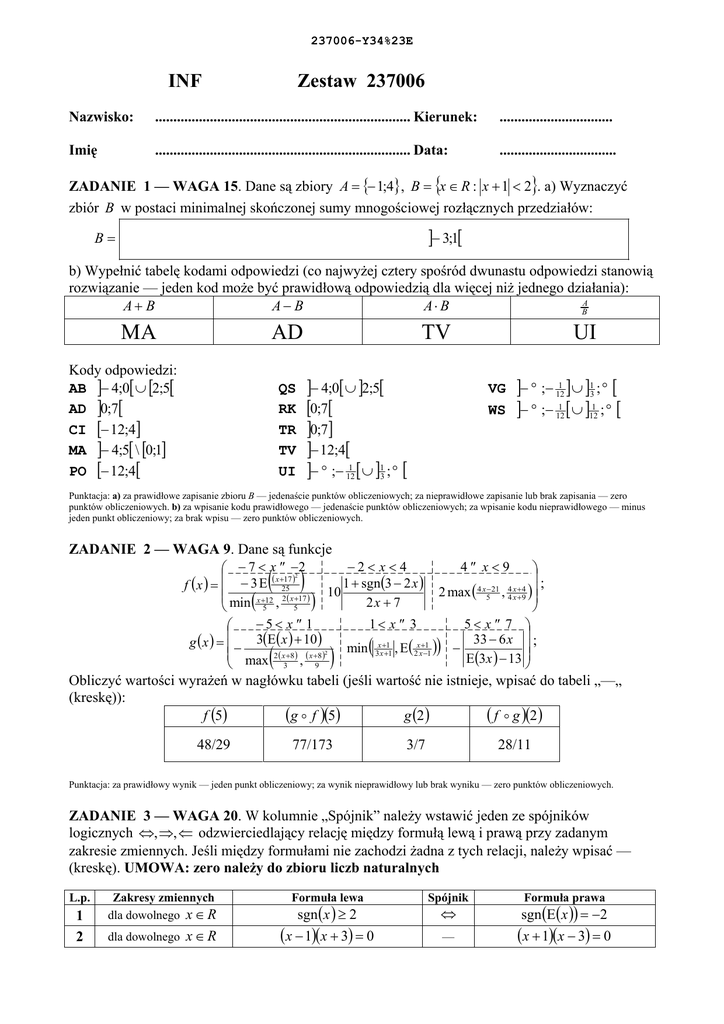 Punktacja: za prawidłowy kod — osiem punktów obliczeniowych; za nieprawidłowy kod — minus jeden punkt obliczeniowy; za brak wpisu — zero