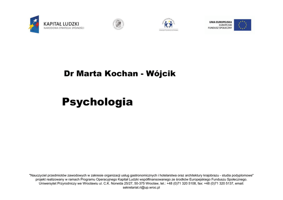 Dr Marta Kochan - Wójcik Psychologia "Nauczyciel przedmiotów zawodowych w zakresie organizacji usług gastronomicznych i hotelarstwa oraz architektury krajobrazu - studia podyplomowe" projekt realizowany w ramach Programu Operacyjnego Kapitał Ludzki współfinansowanego ze środków Europejskiego Funduszu Społecznego. Uniwersytet Przyrodniczy we Wrocławiu ul. C.K. Norwida 25/27, 50-375 Wrocław, tel.: +48 (0)71 320 5108, fax: +48 (0)71 320 5137, email: [email protected] PODSTAWY ROZWOJU EMOCJONALNOSPOŁECZNEGO – ROZWÓJ WIĘZI Z DRUGIM CZŁOWIEKIEM Prezentacja opracowana przez M.Kochan-Wójcik Wykład opracowany przez zespół psychologów CEN UWr. Badania nad naturą miłości – H. Harlow 1958 POSZUKIWANIE WSPARCIA U OBU MATEK W PROCENTOWA ILOŚĆ ILO REAKCJI SYTUACJI STRACHU 100 Matka pluszowa Matka druciana 80 60 40 20 0 7 12 22 42 62 ŚREDNIA WIEKU (DNI) Wykład opracowany przez zespół psychologów CEN UWr. Badania nad naturą miłości – H. Harlow 1958. Wnioski Do prawidłowego rozwoju dziecka, poza zaspokajaniem podstawowych potrzeb fizjologicznych, niezbędny jest dotyk Karmienie jest tak samo ważne jak przytulanie (kojącego dotyku może dostarczać nie tylko matka – rola ojca; rola adopcyjnych rodziców) Wykład opracowany przez zespół psychologów CEN UWr. 1 WARUNKI KSZTAŁTOWANIA SIĘ WIĘZI - wg J. Bowlby’ego wrodzone zachowania dziecka zachęcające dorosłego do bliskości, odpowiadanie przez opiekuna na sygnały płynące od dziecka, pocieszanie przez dotyk (uspokojenie dziecka) Wykład opracowany przez zespół psychologów CEN UWr. PRZYWIĄZANIE Ścisła, intensywna, trwała relacja emocjonalna pomiędzy dzieckiem i opiekunem, pojawiająca się w pierwszym roku życia dziecka, jako uogólnienie tzw. społecznych wyzwalaczy. Wykład opracowany przez zespół psychologów CEN UWr. PRZYWIĄZANIE Zachowania związane z przywiązaniem ustają po osiągnięciu przez dziecko celu, jakim jest bliskość lub kontakt z matką. Intensywność zachowań związanych z przywiązaniem i ich rozpiętość w czasie zależą od stopnia odczuwanego przez dziecko zagrożenia. Wykład opracowany przez zespół psychologów CEN UWr. 2 TYPY WIĘZI według koncepcji M. Ainsworth STYL BEZPIECZNY – zaufanie wobec matki, doświadczenie dostępności i wrażliwości rodzica, STYL UNIKAJĄCY – doświadczenie braku dostępności i wrażliwości matki; rezygnacja o obiekt przywiązania STYL LĘKOWO-AMBIWALENTNY doświadczanie niepewności co do dostępności i wrażliwości matki; silny lęk przed rozstaniem Wykład opracowany przez zespół psychologów CEN UWr. Od czego zależą typy więzi ? Bazą jest jakość relacji matki i dziecka decydująca o zaufaniu lub braku zaufania wobec opiekuna (wrażliwość na potrzeby dzieci) Przekonanie dziecka, że rodzic jest dostępny oraz skłonny do oferowania wsparcia i ochrony Inne czynniki: temperament dziecka, osobowość rodziców, jakość systemu rodzinnego, rodzinne stresory. Wykład opracowany przez zespół psychologów CEN UWr. KONCEPCJA K.BARTHOLOMEW Bezpiecznie przywiązani Niski poziom unikania Lękowoambiwalentni Niski poziom lęku Wysoki poziom lęku Lękowounikający Zdystansowani do innych Wysoki poziom unikania Wykład opracowany przez zespół psychologów CEN UWr. 3 KONSEKWENCJE KSZTAŁTOWANIA UFNEJ WIĘZI Prawidłowy rozwój fizyczny Prawidłowy rozwój emocjonalny Prawidłowy rozwój społeczny Prawidłowy rozwój poznawczy Wykład opracowany przez zespół psychologów CEN UWr. KONSEKWENCJE BRAKU WIĘZI Zaburzenia rozwoju fizycznego Zaburzenia rozwoju emocjonalnego Zaburzenia rozwoju społecznego Zaburzenia rozwoju poznawczego i zdolności komunikacji Wykład opracowany przez zespół psychologów CEN UWr. KONSEKWENCJE BRAKU WIĘZI brak adekwatnych i prawidłowych relacji z innymi ludźmi, wrogość wobec innych, agresja i autoagresja, ambiwalencja uczuciowa-poszukiwanie kontaktów z innymi, ale i unikanie bliskiej więzi, chwiejność emocjonalna, popadanie w skrajne stany emocjonalne, zamknięcie w sobie, apatia, maskowatość twarzy, moczenie, masturbacja jako sposób samouspokojenia, choroba sieroca. Wykład opracowany przez zespół psychologów CEN UWr. 4 POTRZEBY DZIECKA PODSUMOWANIE prawo do istnienia prawo do posiadania potrzeb prawo do miłości prawo do pewności siebie prawo do odrębności i niezależności Wykład opracowany przez zespół psychologów CEN UWr. 5