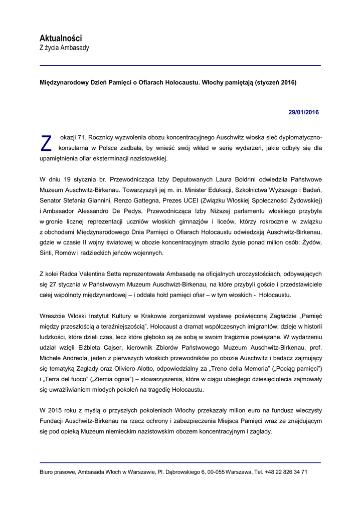 Aktualności Z życia Ambasady Międzynarodowy Dzień Pamięci o Ofiarach Holocaustu. Włochy pamiętają (styczeń 2016) 29/01/2016 Z okazji 71. Rocznicy wyzwolenia obozu koncentracyjnego Auschwitz włoska sieć dyplomatycznokonsularna w Polsce zadbała, by wnieść swój wkład w serię wydarzeń, jakie odbyły się dla upamiętnienia ofiar eksterminacji nazistowskiej. W dniu 19 stycznia br. Przewodnicząca Izby Deputowanych Laura Boldrini odwiedziła Państwowe Muzeum Auschwitz-Birkenau. Towarzyszyli jej m. in. Minister Edukacji, Szkolnictwa Wyższego i Badań, Senator Stefania Giannini, Renzo Gattegna, Prezes UCEI (Związku Włoskiej Społeczności Żydowskiej) i Ambasador Alessandro De Pedys. Przewodnicząca Izby Niższej parlamentu włoskiego przybyła w gronie licznej reprezentacji uczniów włoskich gimnazjów i liceów, którzy rokrocznie w związku z obchodami Międzynarodowego Dnia Pamięci o Ofiarach Holocaustu odwiedzają Auschwitz-Birkenau, gdzie w czasie II wojny światowej w obozie koncentracyjnym straciło życie ponad milion osób: Żydów, Sinti, Romów i radzieckich jeńców wojennych. Z kolei Radca Valentina Setta reprezentowała Ambasadę na oficjalnych uroczystościach, odbywających się 27 stycznia w Państwowym Muzeum Auschwizt-Birkenau, na które przybyli goście i przedstawiciele całej wspólnoty międzynardowej – i oddała hołd pamięci ofiar – w tym włoskich - Holocaustu. Wreszcie Włoski Instytut Kultury w Krakowie zorganizował wystawę poświęconą Zagładzie „Pamięć między przeszłością a teraźniejszością”. Holocaust a dramat współczesnych imigrantów: dzieje w historii ludzkości, które dzieli czas, lecz które głęboko są ze sobą w swoim tragizmie powiązane. W wydarzeniu udział wzięli Elżbieta Cajser, kierownik Zbiorów Państwowego Muzeum Auschwitz-Birkenau, prof. Michele Andreola, jeden z pierwszych włoskich przewodników po obozie Auschwitz i badacz zajmujący się tematyką Zagłady oraz Oliviero Alotto, odpowiedzialny za „Treno della Memoria” („Pociąg pamięci”) i „Terra del fuoco” („Ziemia ognia”) – stowarzyszenia, które w ciągu ubiegłego dziesięciolecia zajmowały się uwrażliwianiem młodych pokoleń na tragedię Holocaustu. W 2015 roku z myślą o przyszłych pokoleniach Włochy przekazały milion euro na fundusz wieczysty Fundacji Auschwitz-Birkenau na rzecz ochrony i zabezpieczenia Miejsca Pamięci wraz ze znajdującym się pod opieką Muzeum niemieckim nazistowskim obozem koncentracyjnym i zagłady. Biuro prasowe, Ambasada Włoch w Warszawie, Pl. Dąbrowskiego 6, 00-055 Warszawa, Tel. +48 22 826 34 71 Biuro prasowe, Ambasada Włoch w Warszawie, Pl. Dąbrowskiego 6, 00-055 Warszawa, Tel. +48 22 826 34 71