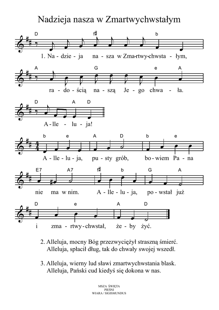 Nadzieja nasza w Zmartwychwstałym & ## # D ‰ f j j j j œ œ œ œj œ j œ j œ Jœ œ J 1. Na - dzie - ja # # A‰ & b œ œ na - sza w Zma-rtwy-chwsta - łym, œ J œ J œ J G ra - do - ścią A # # D‰ j œ œ œ œ & j œ na - szą œ J e A œ œ Je - go chwa - ła. D œ A - lle - lu - ja! e ## 4 b & 4 œ œ œ œ A - lle - lu - ja, & ## E7 œ nie & ## D œ i #œ œ œ ˙ œ # e œ œ œ bo - wiem Pa - na G A - lle - lu - ja, po - wstał juŜ ˙ œ b œ œ œ œ f e D pu - sty grób, A7 ma w nim. œ A œ zma - rtwy - chwstał, b A œ œ A œ D œ ˙ Ŝe - by Ŝyć. 2. Alleluja, mocny Bóg przezwycięŜył straszną śmierć. Alleluja, spłacił dług, tak do chwały swojej wszedł. 3. Alleluja, wierny lud sławi zmartwychwstania blask. Alleluja, Pański cud kiedyś się dokona w nas. MSZA ŚWIĘTA PIEŚNI WIARA / SIGISMUNDUS ˙
