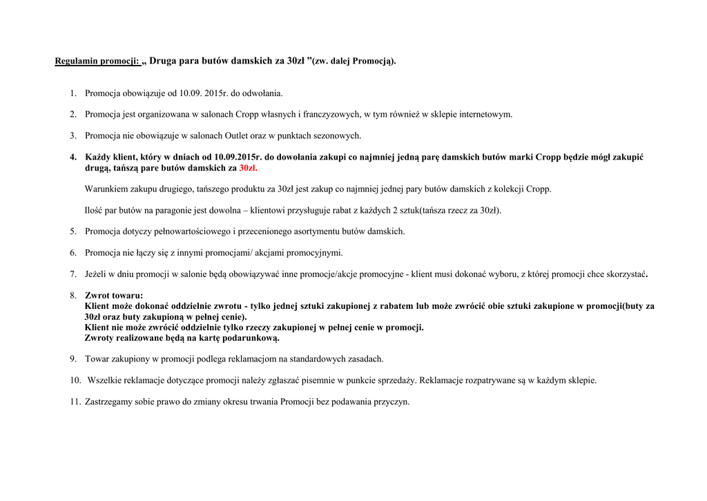 Regulamin promocji: „ Druga para butów damskich za 30zł ”(zw. dalej Promocją). 1. Promocja obowiązuje od 10.09. 2015r. do odwołania. 2. Promocja jest organizowana w salonach Cropp własnych i franczyzowych, w tym również w sklepie internetowym. 3. Promocja nie obowiązuje w salonach Outlet oraz w punktach sezonowych. 4. Każdy klient, który w dniach od 10.09.2015r. do dowołania zakupi co najmniej jedną parę damskich butów marki Cropp będzie mógł zakupić drugą, tańszą pare butów damskich za 30zł. Warunkiem zakupu drugiego, tańszego produktu za 30zł jest zakup co najmniej jednej pary butów damskich z kolekcji Cropp. Ilość par butów na paragonie jest dowolna – klientowi przysługuje rabat z każdych 2 sztuk(tańsza rzecz za 30zł). 5. Promocja dotyczy pełnowartościowego i przecenionego asortymentu butów damskich. 6. Promocja nie łączy się z innymi promocjami/ akcjami promocyjnymi. 7. Jeżeli w dniu promocji w salonie będą obowiązywać inne promocje/akcje promocyjne - klient musi dokonać wyboru, z której promocji chce skorzystać. 8. Zwrot towaru: Klient może dokonać oddzielnie zwrotu - tylko jednej sztuki zakupionej z rabatem lub może zwrócić obie sztuki zakupione w promocji(buty za 30zł oraz buty zakupioną w pełnej cenie). Klient nie może zwrócić oddzielnie tylko rzeczy zakupionej w pełnej cenie w promocji. Zwroty realizowane będą na kartę podarunkową. 9. Towar zakupiony w promocji podlega reklamacjom na standardowych zasadach. 10. Wszelkie reklamacje dotyczące promocji należy zgłaszać pisemnie w punkcie sprzedaży. Reklamacje rozpatrywane są w każdym sklepie. 11. Zastrzegamy sobie prawo do zmiany okresu trwania Promocji bez podawania przyczyn.