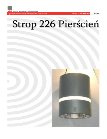 Oprawy wewnętrzne/Indoor luminaires Oprawa zwieszakowa/Suspended luminaire Strop 226 Pierścień Aries Strop 226 Pierścień 1 Oprawy wewnętrzne/Indoor luminaires Oprawa zwieszakowa/Suspended luminaire Strop 226 Pierścień Aries Charakterystyka: Oprawa zwieszakowa przeznaczona do oświetlania wnętrz, w szczególności użyteczności publicznej. Description: Suspended luminaire, dedicated to indoor lighting in particular the general public. Dostępne modele: - Na dwie lub jedną świetlówkę kompaktową różnej mocy, z dławikiem konwencjonalnym KVG – wersja podstawowa - Możliwość zwieszenia oprawy na linkach stalowych o dowolnej długości Available models: - On one or two fluorescent lamps different power, with conventional choke – basic version - Possibility to hang luminaire on steel line with custom length Technologia wykonania: - IP20, KL.I (Opcjonalnie IP44) - Kolor pierścienia dowolny - Kolor obudowy srebrny, biały, czarny lub na zamówienie dowolny z palety RAL Technical details: - IP20, KL.I - Custom ring color - Silver, white, black body color paint or available in other RAL palette for request Źródła światła: - Świetlówka kompaktowa TC-D 13W, trzonek G24-d1 - Świetlówka kompaktowa TC-D 18W, trzonek G24-d2 - Świetlówka kompaktowa TC-D 26W, trzonek G24-d3 Light sources: - Fluorescent lamp TC-D 13W, G24-d1 - Fluorescent lamp TC-D 18W, G24-d2 - Fluorescent lamp TC-D 26W, G24-d3 Wymiary oprawy/scheme 2 Oprawy wewnętrzne/Indoor luminaires Oprawa zwieszakowa/Suspended luminaire Nr kat. Nazwa/Name Kolor/Color L1.7 STROP 226 PIERSCIEN Satyna, biały, czarny, srebrny Strop 226 Pierścień Źródło światła / Light source TC-D 2x26W Aries Uchwyt/Handle G24d-2 Krzywe rozsyłu 3 Oprawy wewnętrzne/Indoor luminaires Oprawa zwieszakowa/Suspended luminaire Strop 226 Pierścień Aries Zakład Projektowania Projektowania i Produkcji Sprzętu Oświetleniowego „ARIES” ul. Marianowska 6 6262-080 Tarnowo Podgórne tel.(061) 848848-9393-91 tel./fax (061) 848848-9393-92 http://www.aries.pl e-mail: [email protected] 4