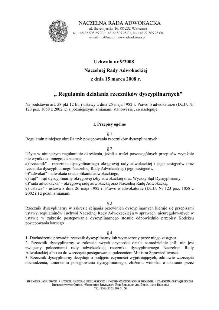 NACZELNA RADA ADWOKACKA ul. Świętojerska 16, 00-202 Warszawa tel. +48 22 505 25 00, + 48 22 505 25 01, fax +48 22 505 25 08 e-mail: [email protected] www.adwokatura.pl Uchwała nr 9/2008 Naczelnej Rady Adwokackiej z dnia 15 marca 2008 r. „ Regulamin działania rzeczników dyscyplinarnych” Na podstawie art. 58 pkt 12 lit. i ustawy z dnia 25 maja 1982 r. Prawo o adwokaturze (Dz.U. Nr 123 poz. 1058 z 2002 r.) z późniejszymi zmianami stanowi się , co następuje: I. Przepisy ogólne §1 Regulamin niniejszy określa tryb postępowania rzeczników dyscyplinarnych. §2 UŜyte w niniejszym regulaminie określenia, jeŜeli z treści poszczególnych przepisów wyraźnie nie wynika co innego, oznaczają: a)"rzecznik" - rzecznika dyscyplinarnego okręgowej rady adwokackiej i jego zastępców oraz rzecznika dyscyplinarnego Naczelnej Rady Adwokackiej i jego zastępców, b)"adwokat" - adwokata oraz aplikanta adwokackiego, c)"sąd" - sąd dyscyplinarny okręgowej izby adwokackiej oraz WyŜszy Sąd Dyscyplinarny, d)"rada adwokacka" - okręgową radę adwokacką oraz Naczelną Radę Adwokacką, e)"ustawa" - ustawa z dnia 26 maja 1982 r. Prawo o adwokaturze (Dz.U. Nr 123 poz. 1058 z 2002 r.) z późn. zmianami §3 Rzecznik dyscyplinarny w zakresie ścigania przewinień dyscyplinarnych kieruje się przepisami ustawy, regulaminów i uchwał Naczelnej Rady Adwokackiej a w sprawach nieuregulowanych w ustawie w zakresie postępowania dyscyplinarnego stosuje odpowiednio przepisy Kodeksu postępowania karnego §4 1. Dochodzenie prowadzi rzecznik dyscyplinarny lub wyznaczony przez niego zastępca. 2. Rzecznik dyscyplinarny w zakresie swych czynności działa samodzielnie jeśli nie jest związany poleceniami rady adwokackiej, rzecznika dyscyplinarnego Naczelnej Rady Adwokackiej albo co do wszczęcia postępowania poleceniem Ministra Sprawiedliwości. 3. Rzecznik dyscyplinarny decyduje o podjęciu czynności wyjaśniających, odmowie wszczęcia dochodzenia, umorzeniu postępowania dyscyplinarnego, złoŜeniu wniosku o ukaranie przez NACZELNA RADA ADWOKACKA ul. Świętojerska 16, 00-202 Warszawa tel. +48 22 505 25 00, + 48 22 505 25 01, fax +48 22 505 25 08 e-mail: [email protected] www.adwokatura.pl dziekana, złoŜeniu wniosku o wszczęcie postępowania dyscyplinarnego, złoŜeniu wniosku o tymczasowe zawieszenie w czynnościach zawodowych, wniesieniu odwołania. §5 W razie przemijającej przeszkody w wykonywaniu obowiązków przez rzecznika, rada na ten czas powierza pełnienie obowiązków rzecznika dyscyplinarnego jednemu ze swoich członków. §6 1.Rzecznik dokonuje podziału spraw do prowadzenia i innych czynności pomiędzy swoich zastępców. 2.Zastępca rzecznika prowadzi przekazane mu przez rzecznika sprawy, a w przypadku przeszkód w ich prowadzeniu, zawiadamia o tym niezwłocznie rzecznika dyscyplinarnego. §7 1.Rzecznik informuję radę adwokacką która go wybrała o prowadzonych sprawach i ich wynikach a w szczególności o odmowie, wszczęciu, zawieszeniu lub umorzeniu dochodzenia bądź o złoŜeniu wniosku o wszczęcie postępowania dyscyplinarnego oraz środków odwoławczych. i jest odpowiedzialny przed radą adwokacką, za prawidłowy i sprawny tok czynności dyscyplinarnych. 2.Prezes i Rzecznik Dyscyplinarny Naczelnej Rady Adwokackiej w kaŜdej sprawie a dziekan rady adwokackiej w odniesieniu do adwokatów członków danej izby, mają prawo wglądu do akt postępowania dyscyplinarnego. 3 JeŜeli wiadomość o przewinieniu dyscyplinarnym adwokata pochodzi od prezesa sądu lub prokuratora nie będących w sprawie pokrzywdzonymi, rzecznik dyscyplinarny zawiadamia właściwego prezesa sądu lub prokuratora o odmowie, wszczęciu, zawieszeniu lub umorzeniu dochodzenia bądź złoŜeniu wniosku o wszczęcie postępowania dyscyplinarnego. §8 1.Rzecznik NRA przynajmniej raz w czasie trwania kadencji przeprowadza naradę z rzecznikami wszystkich izb w celu omówienia orzecznictwa dyscyplinarnego, rozwaŜenia spornych zagadnień powstałych w praktyce dochodzeniowej, w postępowaniu przed sądem dyscyplinarnym, oraz ujednolicenia i usprawnienia postępowania. 2.Rzecznik dyscyplinarny NRA moŜe zarządzić wizytację izby adwokackiej w zakresie czynności rzecznika dyscyplinarnego uczestnicząc w niej osobiście, lub przez wyznaczonego w tym celu jednego ze swych zastępców. 3.Rzecznik dyscyplinarny ORA przynajmniej raz w roku przeprowadza naradę ze swymi zastępcami w celu omówienia zagadnień określonych w § 9. 4.Rzecznik dyscyplinarny NRA moŜe udzielić wiąŜących wskazówek rzecznikowi Okręgowej Rady Adwokackiej a takŜe przejąć sprawę do bezpośredniego prowadzenia lub przekazać ją innemu rzecznikowi. II. Dochodzenie §9 NACZELNA RADA ADWOKACKA ul. Świętojerska 16, 00-202 Warszawa tel. +48 22 505 25 00, + 48 22 505 25 01, fax +48 22 505 25 08 e-mail: [email protected] www.adwokatura.pl Dochodzenie dyscyplinarne polega na wszechstronnym zbadaniu okoliczności sprawy oraz na zebraniu i zabezpieczeniu dowodów, a jego celem jest ustalenie czy doszło do popełnienia przez adwokata przewinienia dyscyplinarnego oraz czy istnieje dostateczna podstawa do złoŜenia wniosku o wszczęcie postępowania dyscyplinarnego (aktu oskarŜenia). § 10 1.Rzecznik dyscyplinarny wszczyna dochodzenie na skutek: a)zawiadomienia o popełnieniu przewinienia, b)uchwały Rady Adwokackiej, c)polecenia Ministra Sprawiedliwości, d)polecenia Rzecznika Dyscyplinarnego NRA., 2.Rzecznik moŜe takŜe wszcząć dochodzenie z urzędu. § 11 1.Po powzięciu wiadomości wskazujących na popełnienie przewinienia rzecznik moŜe dokonać czynności sprawdzających a następnie, najpóźniej w ciągu 30 dni od powzięcia wiadomości wydać postanowienie o wszczęciu i prowadzeniu dochodzenia dyscyplinarnego, lub odmowie wszczęcia dochodzenia albo skierowaniu wniosku o ukaranie do dziekana Okręgowej Rady Adwokackiej. 2. Rzecznik wydaje postanowienie o umorzeniu dochodzenia, jeŜeli zebrany materiał nie daje podst