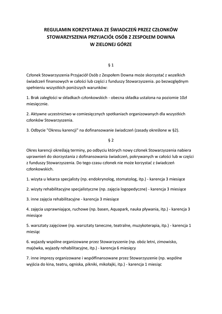 REGULAMIN KORZYSTANIA ZE ŚWIADCZEŃ PRZEZ CZŁONKÓW STOWARZYSZENIA PRZYJACIÓŁ OSÓB Z ZESPOŁEM DOWNA W ZIELONEJ GÓRZE §1 Członek Stowarzyszenia Przyjaciół Osób z Zespołem Downa może skorzystać z wszelkich świadczeń finansowych w całości lub części z funduszy Stowarzyszenia. po bezwzględnym spełnieniu wszystkich poniższych warunków: 1. Brak zaległości w składkach członkowskich - obecna składka ustalona na poziomie 10zł miesięcznie. 2. Aktywne uczestnictwo w comiesięcznych spotkaniach organizowanych dla wszystkich członków Stowarzyszenia. 3. Odbycie "Okresu karencji" na dofinansowanie świadczeń (zasady określone w §2). §2 Okres karencji określają terminy, po odbyciu których nowy członek Stowarzyszenia nabiera uprawnień do skorzystania z dofinansowania świadczeń, pokrywanych w całości lub w części z funduszy Stowarzyszenia. Do tego czasu członek nie może korzystać z świadczeń członkowskich. 1. wizyta u lekarza specjalisty (np. endokrynolog, stomatolog, itp.) - karencja 3 miesiące 2. wizyty rehabilitacyjne specjalistyczne (np. zajęcia logopedyczne) - karencja 3 miesiące 3. inne zajęcia rehabilitacyjne - karencja 3 miesiące 4. zajęcia usprawniające, ruchowe (np. basen, Aquapark, nauka pływania, itp.) - karencja 3 miesiące 5. warsztaty zajęciowe (np. warsztaty taneczne, teatralne, muzykoterapia, itp.) - karencja 1 miesiąc 6. wyjazdy wspólne organizowane przez Stowarzyszenie (np. obóz letni, zimowisko, majówka, wyjazdy rehabilitacyjne, itp.) - karencja 6 miesięcy 7. inne imprezy organizowane i współfinansowane przez Stowarzyszenie (np. wspólne wyjścia do kina, teatru, ogniska, pikniki, mikołajki, itp.) - karencja 1 miesiąc §3 Pierwszeństwo w korzystaniu ze świadczeń w przypadku ograniczonej liczby miejsc mają niepełnosprawni członkowie Stowarzyszenia, następnie członkowie w kolejności wg stażu członkowskiego lub kolejności zgłoszeń (po odbyciu okresu karencji określonego w §2). §4 Utrata dofinansowania może nastąpić w przypadku stwierdzenia zaległości w opłacaniu składek członkowskich lub niskiej obecności i aktywności na zebraniach członkowskich. Decyzję taką podejmuje Zarząd Stowarzyszenia w trybie uchwały. W przypadku utraty prawa do korzystania ze świadczeń członek Stowarzyszenia obowiązany jest na nowo odbyć okres karencji. §5 W wyjątkowych, indywidualnych i uzasadnionych przypadkach zasady i okres karencji mogą zostać zmienione na podstawie pisemnej prośby zainteresowanego skierowanej do Zarządu. Decyzję podejmuje Zarząd Stowarzyszenia w trybie uchwały.