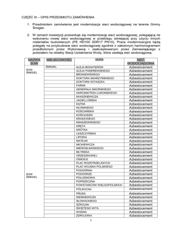 CZĘŚĆ III – OPIS PRZEDMIOTU ZAMÓWIENIA 1. Przedmiotem zamówienia jest modernizacja sieci wodociągowej na terenie Gminy Śmigiel. 2. W ramach inwestycji przewiduje się modernizację sieci wodociągowej, polegającą na wykonaniu nowej sieci wodociągowej w przebiegu istniejącej przy użyciu innych materiałów budowlanych (PE HD100 SDR17 PN10). Prace modernizacyjne będą polegały na przybudowie sieci wodociągowej zgodnie z założonym harmonogramem przedłożonym przez Wykonawcę i zaakceptowanym przez Zamawiającego z podziałem na obiekty Stacji Uzdatniania Wody, które zasilają sieć wodociągową: NAZWA SUW MIEJSCOWOŚC ŚMIGIEL SUW ŚMIGIEL SUW ŚMIGIEL ULICA ALEJA BOHATERÓW ALEJA PADEREWSKIEGO BRONIEWSKIEGO DOKTORA SKARZYŃSKIEGO DOKTORA WITASZKA FARNA GENERAŁA SIKORSKIEGO HARCMISTRZA ŁUKOMSKIEGO IWASZKIEWICZA JAGIELLOŃSKA KĄTNA KILIŃSKIEGO KOŚCIAŃSKA KOŚCIUSZKI KRASICKIEGO KRASZEWSKIEGO KRĘTA KRÓTKA LESZCZYŃSKA LIPOWA MATEJKI MICKIEWICZA MIEROSŁAWSKIEGO MŁYŃSKA ORZESZKOWEJ OSIEDLE PLAC ROZSTRZELANYCH PLAC WOJSKA POLSKIEGO PODGÓRNA PODGÓRZE POŁUDNIOWA POPRZECZNA POWSTAŃCÓW WIELKOPOLSKICH PÓŁNOCNA PRUSA SIENKIEWICZA SŁOWACKIEGO SZKOLNA ŚWIĘTEGO WITA WODNA ZDROJOWA 1 SIEĆ WODOCIĄGOWA Azbestocement Azbestocement Azbestocement Azbestocement Azbestocement Azbestocement Azbestocement Azbestocement Azbestocement Azbestocement Azbestocement Azbestocement Azbestocement Azbestocement Azbestocement Azbestocement Azbestocement Azbestocement Azbestocement Azbestocement Azbestocement Azbestocement Azbestocement Azbestocement Azbestocement Azbestocement Azbestocement Azbestocement Azbestocement Azbestocement Azbestocement Azbestocement Azbestocement Azbestocement Azbestocement Azbestocement Azbestocement Azbestocement Azbestocement Azbestocement Azbestocement KOSZANOWO NIETĄŻKOWO SUW ŚMIGIEL NOWA WIEŚ PRZYSIEKA POLSKA SUW PRZYSIEKA POLSKA CZACZ PARSKO MACHCIN MOROWNICA SUW BRONIKOW O SUW SPŁAWIE BRUSZCZEWSKA DWORSKA GLINKOWA POLNA POPRZECZNA PÓŁWIEJSKA WIERZBOWA ARCISZEWSKICH BOCZNA DUDYCZA KRÓTKA LESZCZYŃSKA LEŚNA ŚMIGIELSKA BRUSZCZEWSKA GŁÓWNA PIASKOWA PRZEMYSŁOWA 27 STYCZNIA OGRODOWA PARKOWA WIELICHOWSKA BOCZNA KAŹMIERCZAKA LEŚNA NOWA ŚMIGIELSKA SPŁAWIE KARMIN Azbestocement Azbestocement Azbestocement Azbestocement Azbestocement Azbestocement Azbestocement Azbestocement Azbestocement Azbestocement Azbestocement Azbestocement Azbestocement Azbestocement Azbestocement Azbestocement Azbestocement Azbestocement Azbestocement Azbestocement Azbestocement Azbestocement Azbestocement Azbestocement Azbestocement Azbestocement Azbestocement Azbestocement Azbestocement Azbestocement Azbestocement 3. Szczegółowy opis przedmiotu zamówienia: W zakres zadania pt. „Modernizacja sieci wodociągowej na terenie Gminy Śmigiel” wchodzi wymiana sieci wodociągowej. Na każdym węźle wodociągowym należy zamontować zasuwy kołnierzowe klinowe. Modernizacji również podlegają wszystkie hydranty. W miejscach wskazanych przez Zamawiającego, gdzie kiedyś były zlokalizowane hydranty, Wykonawca dokona montażu nowych hydrantów dostarczonych przez Inwestora. Ilość dodatkowych hydrantów wchodzących w zakres prac modernizacyjnych nie przekroczy 50szt. Na trasie zmodernizowanej sieci wodociągowej należy ułożyć taśmę znacznikową z zatopionym paskiem stalowym. W zakres modernizacji wchodzi wymiana sieci wodociągowej wraz z zaworami i wodomierzami, przy czym Zamawiający przekaże Wykonawcy potrzebną do realizacji przedmiotu zamówienia ilość wodomierzy. W miejscach gdzie sieć w kierunku odbiorcy przekracza długość 12m należy wykonać studnie wodomierzowe w odległości 2m od granicy przedmiotowej działki. Odcinek sieci od studni do istniejącego wodomierza również podlega wymianie. Wykonawca przedłoży zamawiającemu wnioski materiałowe do akceptacji, składające się z DTR, aktualnych atestów PZH, deklaracje zgodności. Dopiero po akceptacji przez Zamawiającego Wykonawca może zamontować powyższy materiał. W zakres Wykonawcy wchodzi wykonanie wizji lokalnej i zwymiarowanie istniejącej sieci wodociągowej na podstawie, której wykonany zostanie kosztorys ofertowy. Wizja lokalna będzie polegała na zapoznaniu się z terenem objętym modernizacją wraz z omówieniem wszystkich szczegółów przedmiotu zamówienia. 2 Przeprowadzona wizja lokalna zostanie zakończona podpisaniem obustronnie protokołu, który będzie stanowił integralną część oferty złożonej przez Wykonawcę. Modernizację należy wykonać przy stałym dostępie przez odbiorców do wody pitnej, spełniającej wymagania właściwego Rozporządzenia. Maksymalny czas trwania przełączeń nie może trwać dłużej niż 8 godz. Sieci wodociągowe z rur i kształtek z PE zgrzewane będą metodą doczołową zgrzewarką w pełni zautomatyzowaną, z możliwością wydrukowania raportu z listy zgrzewów na którym będzie widniał symbol aktualnej kalibracji lub za pomocą zgrzewarki elektrooporowej. Na szkicach geodezyjnych należy zamieścić symbol wykonanego zgrzewu. Natomiast do montażu sieci w kierunku odbiorcy można zastosować złącza zaciskowe z tworzywa sztucznego do wody pitnej lub za pomocą zgrzewania. Wykonawca podczas wykonywania prac modernizacyjnych sieci wodociągowej zachowa istniejące średnice nominalne DN, przy czym minimalna średnica sieci w kierunku odbiorcy nie może być mniejsza niż PE 32mm. W zakres wykonywanych robót wchodzi całkowita wymiana gruntu na pospółkę lub dopuszcza się zasypywanie wykopu warstwami gruntem spełniającego wymagania podłoża gruntowego G1, dokonując właściwego zagęszczenia gruntu wg wskaźnika Is=1,0. Zniszczone w trakcie robót nawierzchnie bitumiczne należy odtworzyć w następujący sposób: 1) podbudowę należy odtworzyć na całej szerokości i długości prowadzonych robót 2) nawierzchnie bitumiczne (warstwa ścieralna) z betonu asfaltowego o grubości 5cm należy wykonać na cał