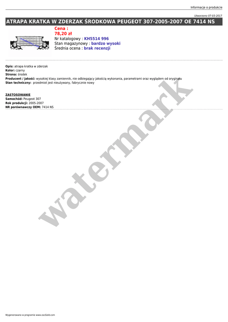 Informacje o produkcie Utworzono 07-03-2017 ATRAPA KRATKA W ZDERZAK ŚRODKOWA PEUGEOT 307-2005-2007 OE 7414 NS Cena : 78,20 zł Nr katalogowy : KH5514 996 Stan magazynowy : bardzo wysoki Średnia ocena : brak recenzji w at ZASTOSOWANIE Samochód: Peugeot 307 Rok produkcji: 2005-2007 NR porównawczy OEM: 7414 NS er m ar k Opis: atrapa kratka w zderzak Kolor: czarny Strona: środek Producent / jakość: wysokiej klasy zamiennik, nie odbiegający jakością wykonania, parametrami oraz wyglądem od oryginału Stan techniczny: przedmiot jest nieużywany, fabrycznie nowy Wygenerowano w programie www.oscGold.com