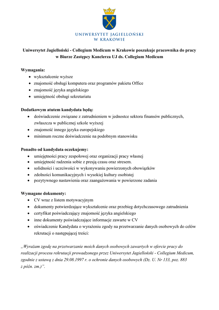 Uniwersytet Jagielloński - Collegium Medicum w Krakowie poszukuje pracownika do pracy w Biurze Zastępcy Kanclerza UJ ds. Collegium Medicum Wymagania: wykształcenie wyższe znajomość obsługi komputera oraz programów pakietu Office znajomość języka angielskiego umiejętność obsługi sekretariatu Dodatkowym atutem kandydata będą: doświadczenie związane z zatrudnieniem w jednostce sektora finansów publicznych, zwłaszcza w publicznej szkole wyższej znajomość innego języka europejskiego minimum roczne doświadczenie na podobnym stanowisku Ponadto od kandydata oczekujemy: umiejętności pracy zespołowej oraz organizacji pracy własnej umiejętność radzenia sobie z presją czasu oraz stresem. solidności i uczciwości w wykonywaniu powierzonych obowiązków zdolności komunikacyjnych i wysokiej kultury osobistej pozytywnego nastawienia oraz zaangażowania w powierzone zadania Wymagane dokumenty: CV wraz z listem motywacyjnym dokumenty potwierdzające wykształcenie oraz przebieg dotychczasowego zatrudnienia certyfikat poświadczający znajomość języka angielskiego inne dokumenty poświadczające informacje zawarte w CV oświadczenie Kandydata o wyrażeniu zgody na przetwarzanie danych osobowych do celów rekrutacji o następującej treści: „Wyrażam zgodę na przetwarzanie moich danych osobowych zawartych w ofercie pracy do realizacji procesu rekrutacji prowadzonego przez Uniwersytet Jagielloński - Collegium Medicum, zgodnie z ustawą z dnia 29.08.1997 r. o ochronie danych osobowych (Dz. U. Nr 133, poz. 883 z późn. zm.)”. Oferty, zawierające wymagane dokumenty, należy składać w wersji elektronicznej na adres e mail: [email protected], w terminie do 8 lutego 2013 r. Informujemy, że skontaktujemy się tylko z wybranymi kandydatami.