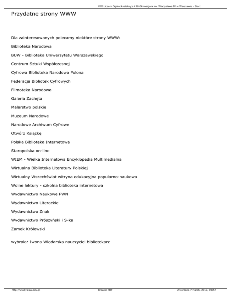 VIII Liceum Ogólnokształcące i 58 Gimnazjum im. Władysława IV w Warszawie - Start Przydatne strony WWW Dla zainteresowanych polecamy niektóre strony WWW: Biblioteka Narodowa BUW - Biblioteka Uniwersytetu Warszawskiego Centrum Sztuki Współczesnej Cyfrowa Biblioteka Narodowa Polona Federacja Bibliotek Cyfrowych Filmoteka Narodowa Galeria Zachęta Malarstwo polskie Muzeum Narodowe Narodowe Archiwum Cyfrowe Otwórz Książkę Polska Biblioteka Internetowa Staropolska on-line WIEM - Wielka Internetowa Encyklopedia Multimedialna Wirtualna Biblioteka Literatury Polskiej Wirtualny Wszechświat witryna edukacyjna popularno-naukowa Wolne lektury - szkolna biblioteka internetowa Wydawnictwo Naukowe PWN Wydawnictwo Literackie Wydawnictwo Znak Wydawnictwo Prószyński i S-ka Zamek Królewski wybrała: Iwona Włodarska nauczyciel bibliotekarz http://wladyslaw.edu.pl Kreator PDF Utworzono 7 March, 2017, 09:57