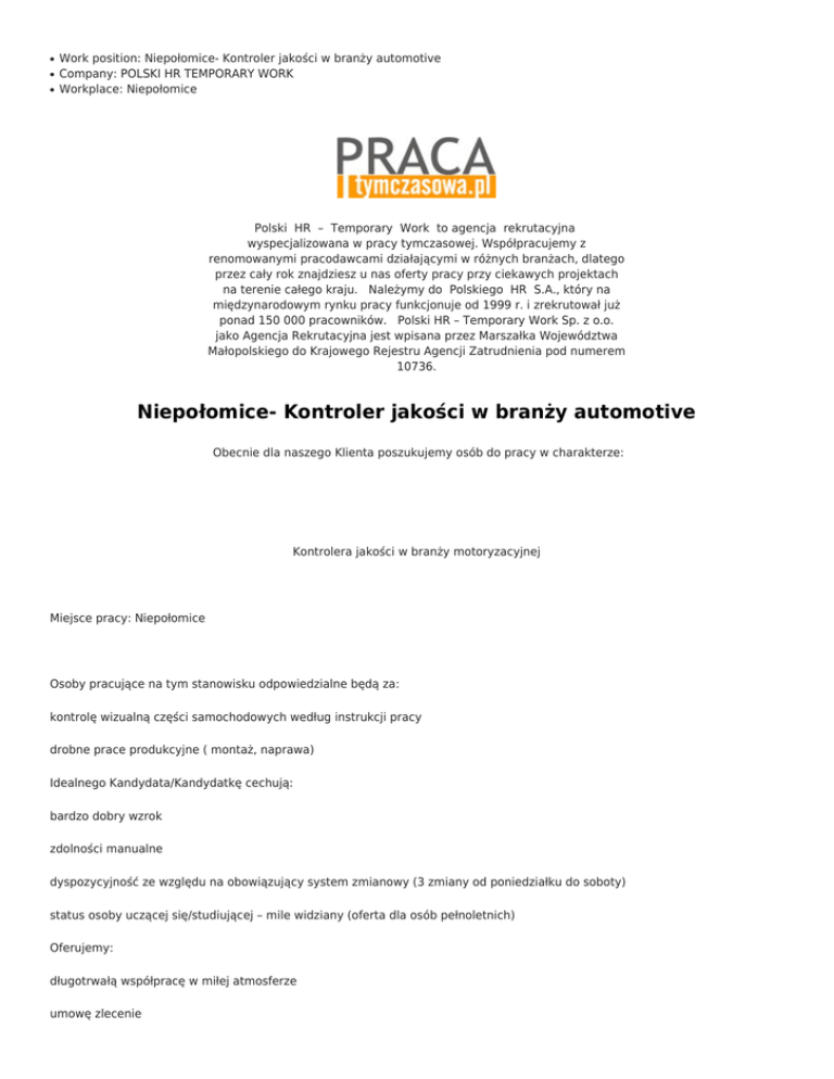 ● ● ● Work position: Niepołomice- Kontroler jakości w branży automotive Company: POLSKI HR TEMPORARY WORK Workplace: Niepołomice Polski HR – Temporary Work to agencja rekrutacyjna wyspecjalizowana w pracy tymczasowej. Współpracujemy z renomowanymi pracodawcami działającymi w różnych branżach, dlatego przez cały rok znajdziesz u nas oferty pracy przy ciekawych projektach na terenie całego kraju. Należymy do Polskiego HR S.A., który na międzynarodowym rynku pracy funkcjonuje od 1999 r. i zrekrutował już ponad 150 000 pracowników. Polski HR – Temporary Work Sp. z o.o. jako Agencja Rekrutacyjna jest wpisana przez Marszałka Województwa Małopolskiego do Krajowego Rejestru Agencji Zatrudnienia pod numerem 10736. Niepołomice- Kontroler jakości w branży automotive Obecnie dla naszego Klienta poszukujemy osób do pracy w charakterze: Kontrolera jakości w branży motoryzacyjnej Miejsce pracy: Niepołomice Osoby pracujące na tym stanowisku odpowiedzialne będą za: kontrolę wizualną części samochodowych według instrukcji pracy drobne prace produkcyjne ( montaż, naprawa) Idealnego Kandydata/Kandydatkę cechują: bardzo dobry wzrok zdolności manualne dyspozycyjność ze względu na obowiązujący system zmianowy (3 zmiany od poniedziałku do soboty) status osoby uczącej się/studiującej – mile widziany (oferta dla osób pełnoletnich) Oferujemy: długotrwałą współpracę w miłej atmosferze umowę zlecenie możliwość nabycia cennego doświadczenia zawodowego w branży motoryzacyjnej atrakcyjną stawkę dla uczniów/studentów Poszukujemy przede wszystkim Osób chętnych do dłuższej współpracy, tak więc jest to realna możliwość rozwoju zawodowego w branży motoryzacyjnej W przesyłanych dokumentach aplikacyjnych prosimy o zawarcie klauzuli: „Wyrażam zgodę na przetwarzanie moich danych osobowych zawartych w mojej ofercie pracy dla potrzeb niezbędnych do realizacji procesu rekrutacji zgodnie z Ustawą z dnia 29.08.1997 roku o Ochronie Danych Osobowych (tekst jednolity: Dz. U. Z 2002. Nr 101, poz. 926 ze zm.). Wyrażam zgodę na wysyłanie informacji pocztą elektroniczną do celów związanych z rekrutacją zgodnie z przepisami art. 10 ust. 2 ustawy z dnia 18.07.2002 r. (Dz.U. nr 144 poz. 1204) o świadczeniu usług drogą elektroniczną.” Aplikuj Dane kontaktowe: POLSKI HR TEMPORARY WORK Send Save Print Tweet