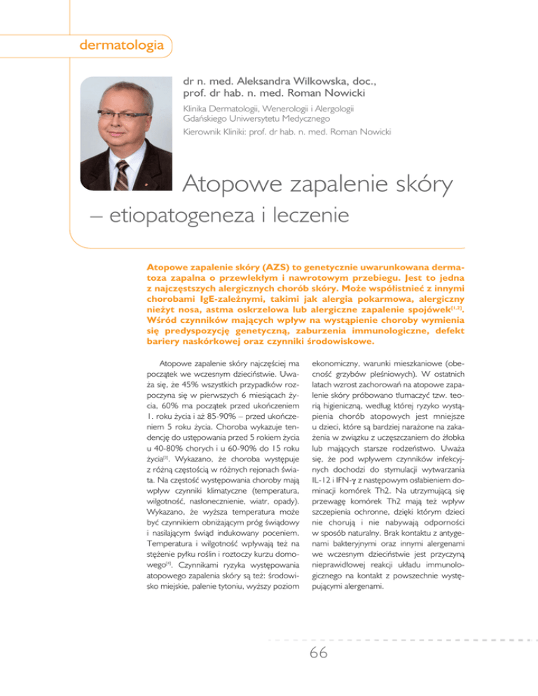 gabinet dermatologia i prawo dr n. med. Aleksandra Wilkowska, doc., prof. dr hab. n. med. Roman Nowicki Klinika Dermatologii, Wenerologii i Alergologii Gdańskiego Uniwersytetu Medycznego Kierownik Kliniki: prof. dr hab. n. med. Roman Nowicki Atopowe zapalenie skóry – etiopatogeneza i leczenie Atopowe zapalenie skóry (AZS) to genetycznie uwarunkowana dermatoza zapalna o przewlekłym i nawrotowym przebiegu. Jest to jedna z najczęstszych alergicznych chorób skóry. Może współistnieć z innymi chorobami IgE-zależnymi, takimi jak alergia pokarmowa, alergiczny nieżyt nosa, astma oskrzelowa lub alergiczne zapalenie spojówek[1,2]. Wśród czynników mających wpływ na wystąpienie choroby wymienia się predyspozycję genetyczną, zaburzenia immunologiczne, defekt bariery naskórkowej oraz czynniki środowiskowe. Atopowe zapalenie skóry najczęściej ma początek we wczesnym dzieciństwie. Uważa się, że 45% wszystkich przypadków rozpoczyna się w pierwszych 6 miesiącach życia, 60% ma początek przed ukończeniem 1. roku życia i aż 85-90% – przed ukończeniem 5 roku życia. Choroba wykazuje tendencję do ustępowania przed 5 rokiem życia u 40-80% chorych i u 60-90% do 15 roku życia[3]. Wykazano, że choroba występuje z różną częstością w różnych rejonach świata. Na częstość występowania choroby mają wpływ czynniki klimatyczne (temperatura, wilgotność, nasłonecznienie, wiatr, opady). Wykazano, że wyższa temperatura może być czynnikiem obniżającym próg świądowy i nasilającym świąd indukowany poceniem. Temperatura i wilgotność wpływają też na stężenie pyłku roślin i roztoczy kurzu domowego[4]. Czynnikami ryzyka występowania atopowego zapalenia skóry są też: środowisko miejskie, palenie tytoniu, wyższy poziom ekonomiczny, warunki mieszkaniowe (obecność grzybów pleśniowych). W ostatnich latach wzrost zachorowań na atopowe zapalenie skóry próbowano tłumaczyć tzw. teorią higieniczną, według której ryzyko wystąpienia chorób atopowych jest mniejsze u dzieci, które są bardziej narażone na zakażenia w związku z uczęszczaniem do żłobka lub mających starsze rodzeństwo. Uważa się, że pod wpływem czynników infekcyjnych dochodzi do stymulacji wytwarzania IL-12 i IFN-g z następowym osłabieniem dominacji komórek Th2. Na utrzymującą się przewagę komórek Th2 mają też wpływ szczepienia ochronne, dzięki którym dzieci nie chorują i nie nabywają odporności w sposób naturalny. Brak kontaktu z antygenami bakteryjnymi oraz innymi alergenami we wczesnym dzieciństwie jest przyczyną nieprawidłowej reakcji układu immunologicznego na kontakt z powszechnie występującymi alergenami. 66 Uwarunkowania genetyczne Atopowe zapalenie skóry jest chorobą uwarunkowaną genetycznie. O genetycznym podłożu choroby świadczy rodzinne występowanie atopowego zapalenia skóry lub innych chorób atopowych. Istnieje większa zgodność objawów u bliźniąt jednojajowych aniżeli u bliźniąt dwujajowych i rodzeństwa niebędącego bliźniakami, a także ryzyko wystąpienia atopowego zapalenia skóry u >56% dzieci w przypadku, gdy jedno z rodziców choruje na atopowe zapalnie skóry i 80%, gdy oboje rodziców choruje na tą chorobę, Ryzyko wystąpienia atopii u dzieci zdrowych rodziców wynosi tylko 515%[5]. Poznane do tej pory geny związane z atopowym zapaleniem skóry można podzielić na dwie grupy. Są to geny kodujące białka strukturalne i funkcjonalne naskórka, takie jak gen filagryny, geny kodujące białka połączeń międzykomórkowych, gen kodujący inhibitor proteaz serynowych (SPINK5/LEKTI), geny kodujące białka połączeń międzykomórkowych (klaudynę, okludynę) oraz gen chymazy mastocytów. Drugą grupę stanowią geny kodujące białka odgrywające rolę w regulacji odpowiedzi immunologicznej (wrodzonej i nabytej). Należą do nich geny czynników transkrypcyjnych STAT6 i FOX3, które regulują różnicowanie limfocytów w kierunku komórek Th2 i limfocytów regulatorowych oraz geny kodujące takie cytokiny jak IL-4, IL13, IL-18 i IL-31 i ich receptory, geny kodujące chemokiny oraz geny kodujące podjednostki a- i b-receptora o wysokim powinowactwie dla IgE[5]. Zaburzenia funkcji bariery naskórkowej Podkreśla się, że ważną rolę w etiopatogenezie atopowego zaplenia skóry odgrywają zaburzenia struktury i funkcji bariery naskórkowej. Na rolę zaburzeń bariery naskór- 67 kowej zwrócili uwagę Elias i wsp. już w 1999 roku. Według ich koncepcji określanej jako „outside – inside – outside hypothesis” zaburzenia bariery skórnej prowadzą z jednej strony do zwiększonej penetracji alergenów, z drugiej – do wzmożonej odpowiedzi immunologicznej[6]. Na defekt bariery naskórkowej mają wpływ genetycznie uwarunkowane zaburzenia dojrzewania różnicowania komórek naskórka, zaburzenia w zakresie lipidów naskórkowych oraz zaburzenia w zakresie homeostazy komórek warstwy rogowej[7]. Wykazano, że w atopowym zapaleniu skóry dochodzi do zwiększonej przeznaskórkowej utraty wody (TEWL)[8,9]. Jak wykazano, jedną z ważniejszych przyczyn prowadzących do zwiększonej TEWL jest mutacja genu filagryny. Filagryna wchodzi w skład naturalnego czynnika nawilżania (NMF), dlatego jej brak prowadzi do zmniejszenia uwodnienia warstwy rogowej i suchości skóry w atopowym zapaleniu skóry. Ponadto wykazano, że brak filagryny prowadzi do podwyższenia pH skóry, co powoduje zwiększoną aktywność proteaz serynowych, nadmierne złuszczanie oraz zahamowanie enzymów biorących udział w przemianie lipidów[10,11]. Zaburzenia immunologiczne W atopowym zapaleniu skóry obserwuje się szereg zaburzeń immunologicznych. Do najważniejszych z nich należą: nadprodukcja IgE, nadmierna aktywność komórek Langerhansa, zmniejszenie liczby limfocytów T supresorowych, zaburzenie równowagi pomiędzy komórkami Th2 i Th1 na korzyść komórek Th2, zwiększona ekspresja receptora CD23 na komórk