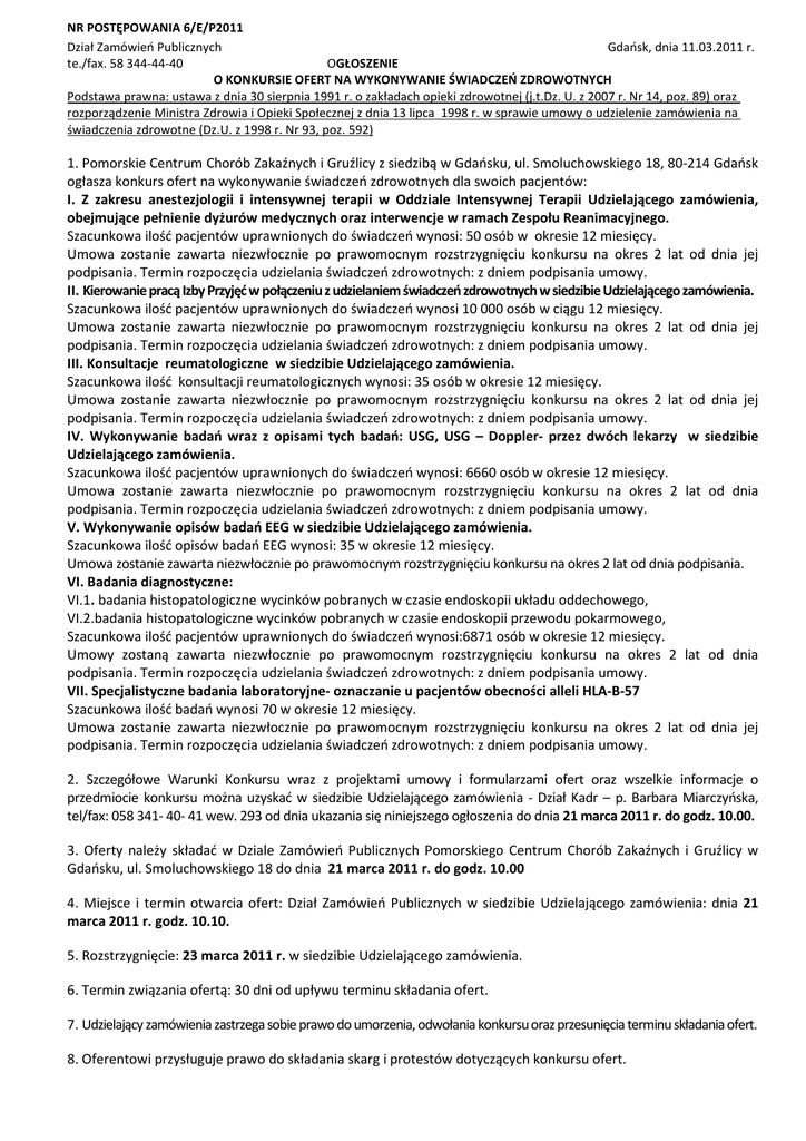 NR POSTĘPOWANIA 6/E/P2011 Dział Zamówień Publicznych Gdańsk, dnia 11.03.2011 r. te./fax. 58 344-44-40 OGŁOSZENIE O KONKURSIE OFERT NA WYKONYWANIE ŚWIADCZEŃ ZDROWOTNYCH Podstawa prawna: ustawa z dnia 30 sierpnia 1991 r. o zakładach opieki zdrowotnej (j.t.Dz. U. z 2007 r. Nr 14, poz. 89) oraz rozporządzenie Ministra Zdrowia i Opieki Społecznej z dnia 13 lipca 1998 r. w sprawie umowy o udzielenie zamówienia na świadczenia zdrowotne (Dz.U. z 1998 r. Nr 93, poz. 592) 1. Pomorskie Centrum Chorób Zakaźnych i Gruźlicy z siedzibą w Gdańsku, ul. Smoluchowskiego 18, 80-214 Gdańsk ogłasza konkurs ofert na wykonywanie świadczeń zdrowotnych dla swoich pacjentów: I. Z zakresu anestezjologii i intensywnej terapii w Oddziale Intensywnej Terapii Udzielającego zamówienia, obejmujące pełnienie dyżurów medycznych oraz interwencje w ramach Zespołu Reanimacyjnego. Szacunkowa ilość pacjentów uprawnionych do świadczeń wynosi: 50 osób w okresie 12 miesięcy. Umowa zostanie zawarta niezwłocznie po prawomocnym rozstrzygnięciu konkursu na okres 2 lat od dnia jej podpisania. Termin rozpoczęcia udzielania świadczeń zdrowotnych: z dniem podpisania umowy. II. Kierowanie pracą Izby Przyjęć w połączeniu z udzielaniem świadczeń zdrowotnych w siedzibie Udzielającego zamówienia. Szacunkowa ilość pacjentów uprawnionych do świadczeń wynosi 10 000 osób w ciągu 12 miesięcy. Umowa zostanie zawarta niezwłocznie po prawomocnym rozstrzygnięciu konkursu na okres 2 lat od dnia jej podpisania. Termin rozpoczęcia udzielania świadczeń zdrowotnych: z dniem podpisania umowy. III. Konsultacje reumatologiczne w siedzibie Udzielającego zamówienia. Szacunkowa ilość konsultacji reumatologicznych wynosi: 35 osób w okresie 12 miesięcy. Umowa zostanie zawarta niezwłocznie po prawomocnym rozstrzygnięciu konkursu na okres 2 lat od dnia jej podpisania. Termin rozpoczęcia udzielania świadczeń zdrowotnych: z dniem podpisania umowy. IV. Wykonywanie badań wraz z opisami tych badań: USG, USG – Doppler- przez dwóch lekarzy w siedzibie Udzielającego zamówienia. Szacunkowa ilość pacjentów uprawnionych do świadczeń wynosi: 6660 osób w okresie 12 miesięcy. Umowa zostanie zawarta niezwłocznie po prawomocnym rozstrzygnięciu konkursu na okres 2 lat od dnia podpisania. Termin rozpoczęcia udzielania świadczeń zdrowotnych: z dniem podpisania umowy. V. Wykonywanie opisów badań EEG w siedzibie Udzielającego zamówienia. Szacunkowa ilość opisów badań EEG wynosi: 35 w okresie 12 miesięcy. Umowa zostanie zawarta niezwłocznie po prawomocnym rozstrzygnięciu konkursu na okres 2 lat od dnia podpisania. VI. Badania diagnostyczne: VI.1. badania histopatologiczne wycinków pobranych w czasie endoskopii układu oddechowego, VI.2.badania histopatologiczne wycinków pobranych w czasie endoskopii przewodu pokarmowego, Szacunkowa ilość pacjentów uprawnionych do świadczeń wynosi:6871 osób w okresie 12 miesięcy. Umowy zostaną zawarta niezwłocznie po prawomocnym rozstrzygnięciu konkursu na okres 2 lat od dnia podpisania. Termin rozpoczęcia udzielania świadczeń zdrowotnych: z dniem podpisania umowy. VII. Specjalistyczne badania laboratoryjne- oznaczanie u pacjentów obecności alleli HLA-B-57 Szacunkowa ilość badań wynosi 70 w okresie 12 miesięcy. Umowa zostanie zawarta niezwłocznie po prawomocnym rozstrzygnięciu konkursu na okres 2 lat od dnia jej podpisania. Termin rozpoczęcia udzielania świadczeń zdrowotnych: z dniem podpisania umowy. 2. Szczegółowe Warunki Konkursu wraz z projektami umowy i formularzami ofert oraz wszelkie informacje o przedmiocie konkursu można uzyskać w siedzibie Udzielającego zamówienia - Dział Kadr – p. Barbara Miarczyńska, tel/fax: 058 341- 40- 41 wew. 293 od dnia ukazania się niniejszego ogłoszenia do dnia 21 marca 2011 r. do godz. 10.00. 3. Oferty należy składać w Dziale Zamówień Publicznych Pomorskiego Centrum Chorób Zakaźnych i Gruźlicy w Gdańsku, ul. Smoluchowskiego 18 do dnia 21 marca 2011 r. do godz. 10.00 4. Miejsce i termin otwarcia ofert: Dział Zamówień Publicznych w siedzibie Udzielającego zamówienia: dnia 21 marca 2011 r. godz. 10.10. 5. Rozstrzygnięcie: 23 marca 2011 r. w siedzibie Udzielającego zamówienia. 6. Termin związania ofertą: 30 dni od upływu terminu składania ofert. 7. Udzielający zamówienia zastrzega sobie prawo do umorzenia, odwołania konkursu oraz przesunięcia terminu składania ofert. 8. Oferentowi przysługuje prawo do składania skarg i protestów dotyczących konkursu ofert.