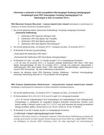 Informacja o zmianach w treści prospektów informacyjnych funduszy inwestycyjnych zarządzanych przez PKO Towarzystwo Funduszy Inwestycyjnych S.A. dokonanych w dniu 25 września 2015 r. PKO ŚWIATOWY FUNDUSZ WALUTOWY - FUNDUSZ INWESTYCYJNY OTWARTY INFORMUJE O NASTĘPUJĄCYCH ZMIANACH W TREŚCI PROSPEKTU INFORMACYJNEGO: 1. Na stronie tytułowej akapit „Oznaczenie Subfunduszy” otrzymuję następujące brzmienie: „Oznaczenie Subfunduszy: 1. 2. 3. 4. Subfundusz PKO Papierów Dłużnych USD, Subfundusz PKO Akcji Rynku Azji i Pacyfiku, Subfundusz PKO Akcji Rynku Japońskiego, Subfundusz PKO Akcji Rynków Wschodzących.” 2. Na stronie tytułowej datę „24 sierpnia 2015 r.” zastępuje się datą „25 września 2015 r.”. 3. W Rozdziale III skreśla się podrozdziały: „Podrozdział IIIA Subfundusz PKO Złota.”. „Podrozdział IIIG Subfundusz PKO Akcji Rynku Amerykańskiego.”. 4. W Rozdziale VI w pkt. 1 po ppkt 1.9. dodaje się ppkt 1.10. w następującym brzmieniu: „1.10. Do dnia 24 września 2015 r. w Funduszu działały Subfundusze PKO Złota i PKO Akcji Rynku Amerykańskiego. W dniu 25 września 2015 r. zostały one połączone odpowiednio z subfunduszami PKO Akcji Rynku Złota i PKO Akcji Rynku Amerykańskiego, wydzielonymi w ramach PKO Parasolowy - fio, jako subfundusze przejmowane. 5. załącza się aktualny statut PKO Światowy Fundusz Walutowy – funduszu inwestycyjnego otwartego stanowiący załącznik nr 2 do prospektu informacyjnego. PKO FUNDUSZ ZABEZPIECZENIA EMERYTALNEGO – SPECJALISTYCZNY FUNDUSZ INWESTYCYJNY OTWARTY INFORMUJE O NASTĘPUJĄCYCH ZMIANACH W TREŚCI PROSPEKTU INFORMACYJNEGO: 1. Na stronie tytułowej datę „24 sierpnia 2015 r.” zastępuje się datą „25 września 2015 r.”. 2. W Podrozdziałach III A, III B, III C, III D oraz III E ppkt 5.3.4. otrzymuje brzmienie: „5.3.4. W ramach Indywidualnych Kont Emerytalnych lub Indywidualnych Kont Zabezpieczenia Emerytalnego, w odniesieniu do wszystkich kategorii Jednostek Uczestnictwa Fundusz może pobrać opłaty, o których mowa w pkt 5.3.1 i 5.3.3.1 oraz, jeśli stanowią tak zasady prowadzenia danego produktu, opłatę, o której mowa w art. 34 ust. 10 lub art. 35 ust. 10 Statutu.” 3. W Rozdziale VI po pkt 4 dodaje się pkt 5 w następującym brzmieniu: „5. Informacje o danych wykorzystywanych przez Fundusz Niektóre informacje zawarte w Prospekcie związane z Benchmarkami Subfunduszy pochodzą lub zostały opracowane na bazie danych dostarczanych przez firmę MSCI Inc. („dane MSCI”). MSCI, ani działający na zlecenie MSCI dostawcy treści nie dają wyraźnych ani dorozumianych 1 gwarancji ani zapewnień oraz nie ponoszą odpowiedzialności w odniesieniu do danych MSCI użytych w niniejszym dokumencie. Dane MSCI nie mogą być powielane, ani wykorzystywane do innych celów bez pisemnej zgody MSCI. Dalsze rozpowszechnianie danych MSCI jest zabronione bez pisemnej zgody MSCI.” PKO PARASOLOWY - FUNDUSZ INWESTYCYJNY OTWARTY INFORMUJE O NASTĘPUJĄCYCH ZMIANACH W TREŚCI PROSPEKTU INFORMACYJNEGO: 1. Na stronie tytułowej datę „28 sierpnia 2015 r.” zastępuje się datą „25 września 2015 r.”. 2. W Rozdziale V pkt 2 otrzymuje następujące brzmienie: „ 2. Podmioty pośredniczące w zbywaniu i odkupywaniu przez Fundusz Jednostek Uczestnictwa,. 2.1. PKO Towarzystwo Funduszy Inwestycyjnych S.A. z siedzibą w Warszawie, ul. Chłodna 52 15, 00-872 Warszawa, tel. 801 32 32 80, (22) 358 56 00. 2.2. Powszechna Kasa Oszczędności Bank Polski S.A. z siedzibą w Warszawie, ul. Puławska 15, 02-515 Warszawa, tel. 801 302 302, (81) 535 65 65. Dystrybutor obsługuje następujące Subfundusze: PKO Akcji Plus, PKO Papierów Dłużnych Plus, PKO Surowców Globalny, PKO Technologii i Innowacji Globalny, PKO Dóbr Luksusowych Globalny, PKO Infrastruktury i Budownictwa Globalny, PKO Akcji Nowa Europa, PKO Zrównoważony, PKO Stabilnego Wzrostu, PKO Obligacji Długoterminowych, PKO Akcji Małych i Średnich Spółek, PKO Strategicznej Alokacji, PKO Rynku Pieniężnego, PKO Skarbowy, PKO Akcji Rynku Europejskiego, PKO Akcji Dywidendowych Globalny, PKO Akcji Rynku Amerykańskiego, PKO Akcji Rynku Złota, PKO Akcji Rynku Japońskiego (Subfundusz oferowany od 2 października 2015 r.), PKO Papierów Dłużnych USD (Subfundusz oferowany od 2 października 2015 r.), PKO Akcji Rynków Wschodzących (Subfundusz oferowany od 9 października 2015 r.), PKO Akcji Rynku Azji i Pacyfiku (Subfundusz oferowany od 9 października 2015 r.). 2.3. Powszechna Kasa Oszczędności Bank Polski S.A. Oddział - Dom Maklerski PKO Banku Polskiego w Warszawie, ul. Puławska 15, 02-515 Warszawa, tel. 801 304 403, (81) 535 63 63. Dystrybutor obsługuje następujące Subfundusze: PKO Akcji Plus, PKO Papierów Dłużnych Plus, PKO Surowców Globalny, PKO Technologii i Innowacji Globalny, PKO Dóbr Luksusowych Globalny, PKO Infrastruktury i Budownictwa Globalny, PKO Akcji Nowa Europa, PKO Zrównoważony, PKO Stabilnego Wzrostu, PKO Obligacji Długoterminowych, PKO Akcji Małych i Średnich Spółek, PKO Strategicznej Alokacji, PKO Rynku Pieniężnego, PKO Skarbowy, PKO Akcji Rynku Europejskiego, PKO Akcji Dywidendowych Globalny, PKO Akcji Rynku Amerykańskiego, PKO Akcji Rynku Złota, PKO Akcji Rynku Japońskiego (Subfundusz oferowany od 2 października 2015 r.), PKO Papierów Dłużnych USD (Subfundusz oferowany od 2 października 2015 r.), PKO Akcji Rynków Wschodzących (Subfundusz oferowany od 2 9 października 2015 r.), PKO Akcji Rynku Azji i Pacyfiku (Subfundusz oferowany od 9 października 2015 r.). 2.4. Bank Pocztowy S.A. z siedzibą w Bydgoszczy, ul. Jagiellońska 17, 85-959 Bydgoszcz, tel. 801 100 500, (52) 349 94 99. Dystrybutor obsługuje następujące Subfundusze: PKO Akcji Plus, PKO Papierów Dłużnych Plus, PKO Akcji Nowa Europa, PKO Zrównoważony, PKO Stabilnego Wzrostu, PKO Obligacji Długoterminowych, PKO Akcji Małych i Średnich Spółek, PKO Strategicznej Alokacji, PKO Rynku Pieniężnego, PKO Skarbowy, PK