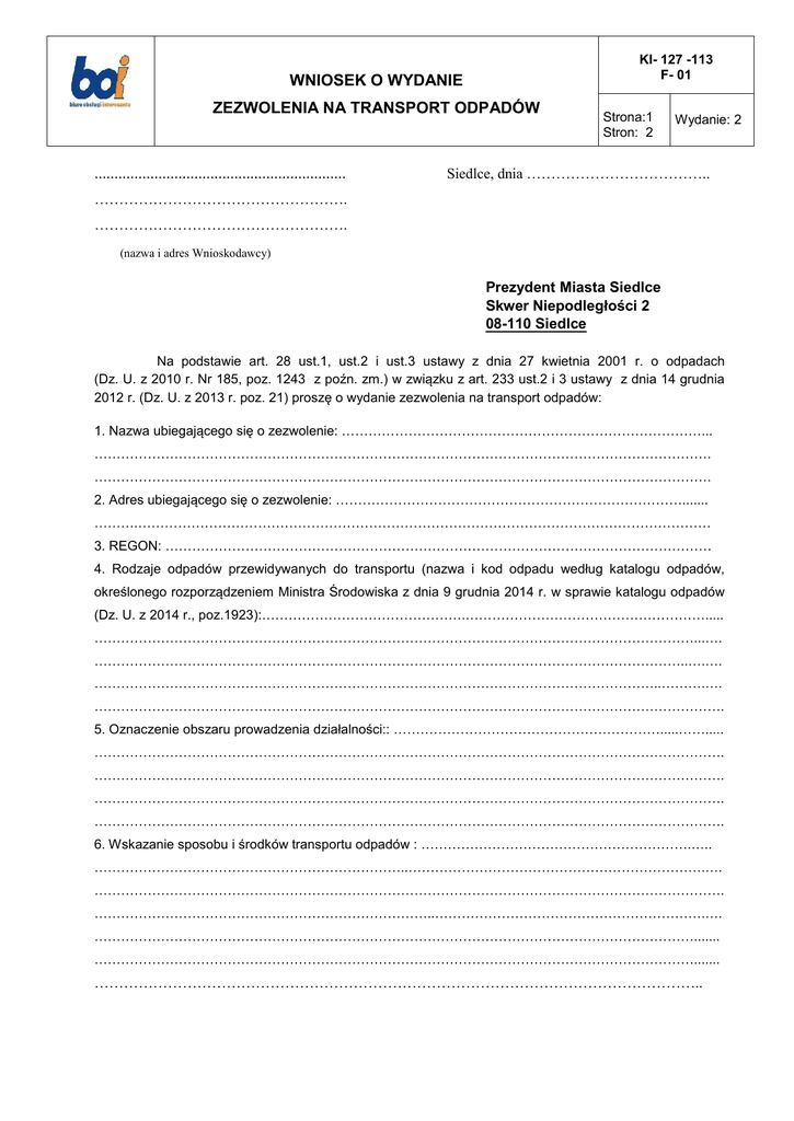 KI- 127 -113 F- 01 WNIOSEK O WYDANIE ZEZWOLENIA NA TRANSPORT ODPADÓW ……………………………………………………… Strona:1 Stron: 2 Wydanie: 2 Siedlce, dnia ……………………………….. ……………………………………………. ……………………………………………. (nazwa i adres Wnioskodawcy) Prezydent Miasta Siedlce Skwer Niepodległości 2 08-110 Siedlce Na podstawie art. 28 ust.1, ust.2 i ust.3 ustawy z dnia 27 kwietnia 2001 r. o odpadach (Dz. U. z 2010 r. Nr 185, poz. 1243 z poźn. zm.) w związku z art. 233 ust.2 i 3 ustawy z dnia 14 grudnia 2012 r. (Dz. U. z 2013 r. poz. 21) proszę o wydanie zezwolenia na transport odpadów: 1. Nazwa ubiegającego się o zezwolenie: ………………………………………………………………………... …………………………………………………………………………………………………………………………. …………………………………………………………………………………………………………………………. 2. Adres ubiegającego się o zezwolenie: ……………………………………………………………………....... ……….………………………………………………………………………………………………………………… 3. REGON: …………………………………………………………………………………………………………… 4. Rodzaje odpadów przewidywanych do transportu (nazwa i kod odpadu według katalogu odpadów, określonego rozporządzeniem Ministra Środowiska z dnia 9 grudnia 2014 r. w sprawie katalogu odpadów (Dz. U. z 2014 r., poz.1923):……………………………………….………………………………………………..... ………………………………………………………………………………………………………………………...…. ……………………………………………………………………………………………………………………..….…. ………………………………………………………………………………………………………………..……….…. ……………………………………………………………………………………………………………………………. 5. Oznaczenie obszaru prowadzenia działalności:: …………………………………………………….....……..... ……………………………………………………………………………………………………………………………. ……………………………………………………………………………………………………………………………. ……………………………………………………………………………………………………………………………. ……………………………………………………………………………………………………………………………. 6. Wskazanie sposobu i środków transportu odpadów : …………………………………………………….….. ……………………………………………………………..………………………………………………………….…. ……………………………………………………………………………………………………………………………. …………………………………………………………………..…………………………………………………….…. ………………………………………………………………………………………………………………………....... ………………………………………………………………………………………………………………………....... …………………………………………………………………………………………………………….. KI- 127 -113 F- 01 WNIOSEK O WYDANIE ZEZWOLENIA NA TRANSPORT ODPADÓW Strona:2 Stron: 2 Wydanie: 2 7.Przedstawienie możliwości technicznych i organizacyjnych pozwalających należycie wykonywać działalność w zakresie transportu odpadów: ………………………………………………………. …...............................................................................................………………………………………………… ………………………………………………………………………………………………………………………….. ………………………………………………………………………………………………………………………….. ………………………………………………………………………………………………………………………….. …………………………………………………………………..……………………………………….……………... ………………………………………………………………………………………………………………………….. …………………………………………………………………..……………………………………………………… …………………………………………………………………………………………………………………….……. 8. Przewidywany okres wykonywania działalności w zakresie transportu odpadów …………………………………………………………………..……………………………………………………... …………………………………………………………………………………………………………………………. ………………………………………………………………………………………………
