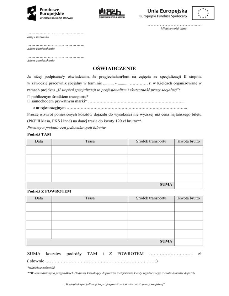 …………………………..…. Miejscowość, data …………………………………… Imię i nazwisko …………………………………… Adres zamieszkania …………………………………… Adres zamieszkania OŚWIADCZENIE Ja niżej podpisana/y oświadczam, że przyjechałam/łem na zajęcia ze specjalizacji II stopnia w zawodzie pracownik socjalny w terminie .......... - .......... …………. r. w Kielcach organizowane w ramach projektu „II stopień specjalizacji to profesjonalizm i skuteczność pracy socjalnej”: cznym środkiem transportu* o nr rejestracyjnym ………………………………………………………………………….. Proszę o zwrot poniesionych kosztów dojazdu do wysokości nie wyższej niż cena najtańszego biletu (PKP II klasa, PKS i inne) na danej trasie do kwoty 120 zł brutto**. Prosimy o podanie cen jednostkowych biletów Podróż TAM Data Środek transportu Trasa Kwota brutto SUMA Podróż Z POWROTEM Data Środek transportu Trasa Kwota brutto SUMA SUMA kosztów podróży TAM i Z POWROTEM ……………………….. ( słownie ………………………………………………………………) *właściwe zakreślić **W uzasadnionych przypadkach Podmiot kształcący dopuszcza zwiększenie kwoty wypłacanego zwrotu kosztów dojazdu „II stopień specjalizacji to profesjonalizm i skuteczność pracy socjalnej” zł Proszę o wpłacenie na konto: Bank: …………………………………………………………………………………………… Nr konta: ……………………………………………………………………………………….. Do wniosku dołączam: ……………………………….. Data i czytelny podpis Wnioskodawcy Osoba wnioskująca spełnia warunki do otrzymania refundacji kosztów dojazdu za w/w okres. Przyznano zwrot kosztów przejazdu w wysokości …………………………………………...zł Zatwierdził/a……………………………………….. Data i czytelny podpis Wykaz dokumentów wymaganych do rozliczenia kosztów dojazdu w zależności od wykorzystanego środka transportu: 1. Publiczne środki transportu: a) Oświadczenie o zwrot kosztów dojazdu b) Bilety 2. Prywatny samochód osobowy: a) Oświadczenie o zwrot kosztów dojazdu b) Informacja, bądź zaświadczenie od przewoźnika dotyczące ceny najtańszego biletu na danej trasie c) Kserokopia dowodu rejestracyjnego d) Umowa użyczenia samochodu (w przypadku korzystania z pojazdu, który nie stanowi własności Uczestnika/Uczestniczki Projektu), która powinna zawierać co najmniej następujące informacje: datę zawarcia, wskazanie stron umowy oraz informacje pozwalające jednoznacznie stwierdzić, iż przedmiot umowy jest zgodny z dowodem rejestracyjnym o którym mowa powyżej Dokumenty, o których mowa w pkt. 2 b, c, d wymagane są jako obligatoryjne jedynie do pierwszego Oświadczenia o zwrot kosztów dojazdu. W przypadku zmiany danych zawartych w Oświadczeniu o zwrot kosztów bądź którymkolwiek z załączników do niniejszego Oświadczenia Uczestnik/Uczestniczka Projektu zobowiązana/y jest do ich ponownego złożenia. „II stopień specjalizacji to profesjonalizm i skuteczność pracy socjalnej”