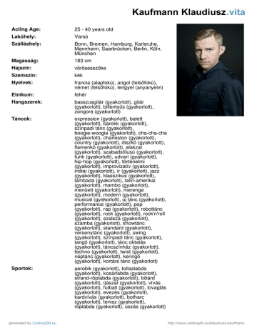 Kaufmann Klaudiusz.vita Acting Age: 25 - 40 years old Lakóhely: Varsó Szálláshely: Bonn, Bremen, Hamburg, Karlsruhe, Mannheim, Saarbrücken, Berlin, Köln, München Magasság: 183 cm Hajszín: vörösesszőke Szemszín: kék Nyelvek: francia (alapfokú), angol (felsőfokú), német (felsőfokú), lengyel (anyanyelvi) Etnikum: fehér Hangszerek: basszusgitár (gyakorlott), gitár (gyakorlott), billentyűs (gyakorlott), zongora (gyakorlott) Táncok: expression (gyakorlott), balett (gyakorlott), barokk (gyakorlott), színpadi tánc (gyakorlott), boogie-woogie (gyakorlott), cha-cha-cha (gyakorlott), charleston (gyakorlott), country (gyakorlott), diszkó (gyakorlott), flamenkó (gyakorlott), alakzat (gyakorlott), szabadstílusú (gyakorlott), funk (gyakorlott), udvari (gyakorlott), hip-hop (gyakorlott), történelmi (gyakorlott), improvizatív (gyakorlott), indiai (gyakorlott), ír (gyakorlott), jazz (gyakorlott), klasszikus (gyakorlott), lambada (gyakorlott), latin-amerikai (gyakorlott), mambo (gyakorlott), menüett (gyakorlott), merenge (gyakorlott), modern (gyakorlott), musical (gyakorlott), új tánc (gyakorlott), performance (gyakorlott), pop (gyakorlott), rap (gyakorlott), robottánc (gyakorlott), rock (gyakorlott), rock'n'roll (gyakorlott), szalsza (gyakorlott), szamba (gyakorlott), showtánc (gyakorlott), standard (gyakorlott), versenytánc (gyakorlott), swing (gyakorlott), színpadi tánc (gyakorlott), tangó (gyakorlott), tánc oktatás (gyakorlott), táncszínház (gyakorlott), techno (gyakorlott), twist (gyakorlott), néptánc (gyakorlott), keringő (gyakorlott), kortárs tánc (gyakorlott) Sportok: aerobik (gyakorlott), tollaslabda (gyakorlott), kosárlabda (gyakorlott), strand-röplabda (gyakorlott), biliárd (gyakorlott), íjászat (gyakorlott), vívás (gyakorlott), futball (gyakorlott), lovaglás (gyakorlott), evezés (gyakorlott), kardvívás (gyakorlott), botharc (gyakorlott), tenisz (gyakorlott), röplabda (gyakorlott), úszás (gyakorlott) generated by CastingDB.eu http://www.castingdb.eu/klaudiusz-kaufmann Vezetői engedély: személyautó Hangszín: bariton Kaufmann Klaudiusz.vita Tanulmányok 1997 - 1998 Ausbildung im klassischen Gesang an der Musikschule in Gliwice (németül) 1998 - 2002 Akademia Teatralna - Warszawa (Theaterakademie - Warschau) (németül) Díjak 2002 •Auszeichnung der Jury auf dem 20. Festival fuer Theaterhochschulen in Łódź (Lodz) (németül) 2001 Stipendium des Kulturministeriums (németül) 2000 •Stipendium der K.Frank-Niemczycka-Stiftung fuer einen der begabtesten Studenten der Theaterakade (németül) Filmek 2016 POlizeiruf 110. Der Preis der Freiheit (angolul) Rendező: Stephan Rick 2015 Polizeiruf 110. Grenzgaenger (angolul) Rendező: Jakob Ziemnicki 2014 Passing Bells (angolul) Rendező: Brendan Maher, IMDB: http://www.imdb.com/title/tt3893044/fullcredits?ref_=tt_ov_st_sm 2014 Na dobre i na złe (angolul) Rendező: Grzegorz Lewandowski, IMDB: http://www.imdb.com/title/tt0262975/?ref_=nm_flmg_act_1 2013 Piąty Stadion (németül) Rendező: Tomasz Konecki 2013 Lekarze (németül) Rendező: Filip Zylber, IMDB: http://www.imdb.com/title/tt2364040/?ref_=nm_flmg_act_2 generated by CastingDB.eu http://www.castingdb.eu/klaudiusz-kaufmann Kaufmann Klaudiusz.vita 2012 THE SPIES OF WARSAW (angolul) Rendező: Coky Giedroyć, IMDB: http://www.imdb.com/title/tt2343137/?ref_=nm_flmg_act_3 2012 HANS KLOSS. STAWKA WIĘKSZA NIŻ ŚMIERĆ (németül) Rendező: Patryk Vega, IMDB: http://www.imdb.com/title/tt2014266/?ref_=nm_flmg_act_4 2011 Polizeiruf 110 (Feindbild) (angolul) Rendező: Eoin Moore , IMDB: http://www.imdb.com/title/tt1751430/ 2011 Grossstadtrevier (Freifahrt) (angolul) Rendező: Jan Ruzicka, IMDB: http://www.imdb.com/title/tt1800871/ 2011 Instynkt (németül) Rendező: Patryk Vega, IMDB: http://www.imdb.com/title/tt1973421/?ref_=nm_flmg_act_5 2010 Pfarrer Braun- Kur mit Schatten (angolul) Rendező: Wolfgang F. Henschel, IMDB: http://www.imdb.com/title/tt1477821/ 2010 Joanna (angolul) Rendező: Feliks Falk, IMDB: http://www.imdb.com/title/tt1799110/ 2010 Sprawiedliwi (angolul) Rendező: Waldemar Krzystek, IMDB: http://www.imdb.com/title/tt1698748/ 2010 Hochzeitspolka (angolul) Rendező: Lars Jessen, IMDB: http://www.imdb.com/title/tt1517474/ 2010 Optymista (angolul) Rendező: Sebastian Chondrokostas 2010 Rewolwer (angolul) Rendező: Łukasz Arkuszewski 2008 Czas Honoru (angolul) Rendező: Michał Kwieciński 2008 TERAZ ALBO NIGDY (angolul) Rendező: Grzegorz Kuczeriszka 2007 M JAK MIŁOŚĆ (angolul) Rendező: Mariusz Malec 2007 Kryminalni (angolul) Rendező: Ryszard Zatorski, Piotr Wereśniak 2006 ŚMIERĆ ROTMISTRZA PILECKIEGO (németül) Rendező: Ryszard Bugajski 2006 ZŁOTOPOLSCY (németül) Rendező: Radosław Piwowarski generated by CastingDB.eu http://www.castingdb.eu/klaudiusz-kaufmann Kaufmann Klaudiusz.vita 2005 DZIKI 2- POJEDYNEK (németül) Rendező: Krzysztof Lang 2005 MATKA I DZIECKO (németül) Rendező: Stanisław Różewicz 2005 PLEBANIA (németül) Rendező: Wojciech Solarz 2005 KLAN (németül) Rendező: Paweł Karpiński 2005 EGZAMIN Z ŻYCIA (németül) Rendező: Teresa Kotlarczyk 2004 DZIKI (németül) Rendező: Grzegorz Warchoł 2003 PIĘKNA PANI SEIDENMAN (németül) Rendező: Janusz Kijowski 2002 - 2004 KABARET OLGII LIPIŃSKIEJ (németül) Rendező: Olga Lipińska 2001 BEATRIX CENCI (angolul) Rendező: Jan Englert Színház 2013 Bezimienne dzieło (németül) Intézmény: National Theater in Warszawa, Rendező: Jan Englert, Szerző: S.I. Witkiewicz 2013 Sprawa (németül) Intézmény: National Theater in Warszawa, Rendező: Jerzy Jarocki 2012 Błądząc (németül) Intézmény: Teatr LA M.ORT, Rendező: Ewelina Kaufmann, Szerző: Ewelina Kaufmann 2009 Hamletmaschine (angolul) Intézmény: Teatr LA M.ORT/Warszawa, Rendező: Ewelina Kaufmann, Szerző: Heiner Mueller 2007 ROSENCRANTZ AND GUILDENSTERN ARE DEAD (németül) Intézmény: C-Cube/Edinburgh, Rendező: Ewelina Kaufmann 2007 Acropolis/Symptoms (angolul) 