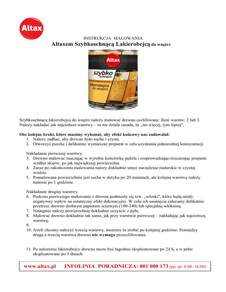 INSTRUKCJA MALOWANIA Altaxem Szybkoschnącą Lakierobejcą do wnętrz Szybkoschnącą lakierobejcą do wnętrz należy malować drewno oszlifowane. Ilość warstw: 2 lub 3. Należy nakładać jak najcieńsze warstwy – tu nie działa zasada, że „im więcej, tym lepiej”. Oto kolejne kroki, które musimy wykonać, aby efekt końcowy nas zadowalał: 1. Należy zadbać, aby drewno było suche i czyste. 2. Otworzyć puszkę i delikatnie wymieszać preparat w celu uzyskania jednorodnej konsystencji. Nakładanie pierwszej warstwy. 3. Drewno malować maczając w wyrobie końcówkę pędzla i rozprowadzając/rozcierając preparat wzdłuż słojów, po jak największej powierzchni. 4. Zaraz po zakończeniu malowania należy dokładnie umyć narzędziaa malarskie w czystej wodzie. 5. Pomalowana powierzchnia jest sucha w dotyku po 20 minutach, ale kolejną warstwę należy nanosić po 1 godzinie. Nakładanie drugiej warstwy. 6. Podczas pierwszego malowania z drewna podniosły się tzw. „włoski”, które będą miały negatywny wpływ na ostateczny efekt dekoracyjny. W celu ich usunięcia zalecamy delikatnie przetrzeć drewno drobnym papierem ściernym (180-240) lub specjalną włókniną. 7. Następnie należy powierzchnię dokładnie oczyścić z pyłu. 8. Malować drewno dokładnie tak samo, jak przy warstwie pierwszej – nakładając jak najcieńszą warstwę. 9. 10. Jeżeli chcemy nałożyć trzecią warstwę, możemy to zrobić po kolejnej godzinie. Pomiędzy drugą a trzecią warstwą drewno nie wymaga przeszlifowania. 11. Po nalożeniu lakierobejcy drewno może być łagodnie eksploatowane po 24 h, a w pełni eksploatowane po 3 dniach. www.altax.pl INFOLINIA PORADNICZA: 801 000 173 (pn.-pt. 8:00–16:00)