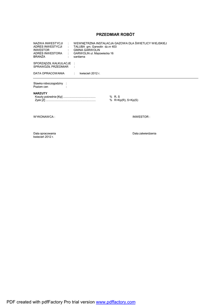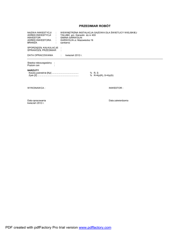 PRZEDMIAR ROBÓT NAZWA INWESTYCJI ADRES INWESTYCJI INWESTOR ADRES INWESTORA BRANŻA : : : : : WEWNĘTRZNA INSTALACJA GAZOWA DLA ŚWIETLICY WIEJSKIEJ TALUBA gm. Garwolin dz.nr 403 GMINA GARWOLIN GARWOLIN ul. Mazowiecka 16 sanitarna SPORZĄDZIŁ KALKULACJE SPRAWDZIŁ PRZEDMIAR : : DATA OPRACOWANIA : Stawka roboczogodziny Poziom cen kwiecień 2012 r. : : NARZUTY Koszty pośrednie [Kp] ......................................... Zysk [Z] ............................................................... % R, S % R+Kp(R), S+Kp(S) WYKONAWCA : INWESTOR : Data opracowania kwiecień 2012 r. Data zatwierdzenia PDF created with pdfFactory Pro trial version www.pdffactory.com KSIĄŻKA PRZEDMIARÓW Wewnętrzna instalacja gazowa dla Świetlicy Wiejskiej w Talubie Lp. Podst 1 KNNR 1 0307-02 2 KNNR 1 0318-01 3 KNNR 1 0408-02 4 KNNR 1 0210-01 5 KNNR 1 0214-05 6 KNNR 4 1411-01 Opis i wyliczenia j.m. Wykopy liniowe o szerokości 0,8-2,5 m i głębokości do 1,5 m o ścianach pio- m3 nowych w gruntach suchych kat. III-IV /7.5x0,6x1,0/ 4.5 m3 Zasypywanie wykopów o ścianach pionowych o szerokości 0.8-2.5 m i głęb.do m3 1.5 m w gr.kat. I-III 4.5 m3 Zagęszczanie wykopów kat.III ubijakami mechanicznymi m3 4.5 m3 Wykopy oraz przekopy o głęb.do 3.0 m wyk.na odkład koparkami podsiębierny-m3 mi o poj.łyżki 0.15 m3 w gr.kat. I-III /95,0x0,6x1,0/ 57 m3 Zasypanie wykopów .fund.podłużnych,punktowych,rowów,wykopów obiekto- m3 wych spycharkami z zagęszcz.mechanicznym ubijakami (gr.warstwy w stanie luźnym 25 cm) - kat.gr. III-IV z rozplantowaniem nadwyżki gruntu 57 m3 Podłoża pod kanały i obiekty z materiałów sypkich grub. 2x10 cm - podsypka i m3 nasypka /102,5x0,6x0,2/ 12.3 m3 7 S-219 0900- Montaż rurociągów z rur polietylenowych o śr.nom. 40 mm montowanych z rur m 04 w zwojach 90 m 8 S-219 0900- Montaż rurociągów z rur polietylenowych o śr.nom. 32 mm montowanych z rur m 03 w zwojach 9.5 m 9 S-219 1100- Połączenia rur polietylenowych o śr.nom. 40 mm za pomocą kształtek elektroo- zlacz. 04 porowych - trójniki 4 zlacz. 10 S-219 1100- Połączenia rur polietylenowych o śr.nom. 40 mm za pomocą kształtek elektroo- zlacz. 04 porowych - kolana 3 zlacz. 11 S-219 1100- Połączenia rur polietylenowych o śr.nom. 40 mm za pomocą kształtek elektroo- zlacz. 04 porowych - mufy 7 zlacz. 12 S-219 1100- Połączenia rur polietylenowych o śr.nom. 40 mm za pomocą kształtek elektroo- zlacz. 04 porowych - przejścia PE/stal z rurą stal. gładką 40/32 mm 6 zlacz. 13 S-219 1100- Połączenia rur polietylenowych o śr.nom. 32 mm za pomocą kształtek elektroo- zlacz. 03 porowych - mufa 1 zlacz. 14 S-219 1100- Połączenia rur polietylenowych o śr.nom. 32 mm za pomocą kształtek elektroo- zlacz. 03 porowych - przejścia PE/stal z rurą stal. gładką 32/25 mm 1 zlacz. 15 S-219 1300- Przyłącza domowe z rur PE-HD o śr.do 25 mm w rurze ochronnej z duralumi- szt. 02 nium o śr.do 50 mm - szafka Z-5 1 szt. 16 S-219 0800- Próby szczelności i wytrzymałości przyłączy domowych - montaż aparatury 01 kontrolno-pomiarowej 1 kpl. 17 S-219 0800- Próby szczelności i wytrzymałości przyłączy domowych 02 99.5 m -2- Norma 3.23 PDF created with pdfFactory Pro trial version www.pdffactory.com kpl. m Poszcz Razem 4.500 RAZEM 4.500 4.500 RAZEM 4.500 4.500 RAZEM 4.500 57.000 RAZEM 57.000 57.000 RAZEM 57.000 12.300 RAZEM 12.300 90.000 RAZEM 90.000 9.500 RAZEM 9.500 4.000 RAZEM 4.000 3.000 RAZEM 3.000 7.000 RAZEM 7.000 6.000 RAZEM 6.000 1.000 RAZEM 1.000 1.000 RAZEM 1.000 1.000 RAZEM 1.000 1.000 RAZEM 1.000 99.500 RAZEM 99.500 KSIĄŻKA PRZEDMIARÓW Wewnętrzna instalacja gazowa dla Świetlicy Wiejskiej w Talubie Lp. Podst Opis i wyliczenia j.m. 18 KNR-W 2- Oznakowanie trasy gazociągu ułożonego w ziemi taśmą lokalizacyjną żółtą ze m 19 0102-01 ścieżką metaliczną 101 m 19 KNR-W 2- Oznakowanie trasy gazociągu ułożonego w ziemi taśmą ostrzegawczą żółtą z m 19 0102-01 napisem "GAZ" 99.5 m 20 Obsługa geodezyjna przyłącza gazu m 99.5 m Poszcz Razem 101.000 RAZEM 101.000 99.500 RAZEM 99.500 99.500 RAZEM 99.500 8.000 RAZEM 8.000 8.000 RAZEM 8.000 13.500 RAZEM 13.500 11.000 RAZEM 11.000 7.000 RAZEM 7.000 5.000 RAZEM 5.000 5.000 RAZEM 5.000 5.000 RAZEM 5.000 1.000 RAZEM 1.000 1.000 RAZEM 1.000 24.500 RAZEM 24.500 6.000 RAZEM 6.000 kalk. własna 21 KNR-W 2- Rurociągi w instalacjach gazowych stalowe o połączeniach spawanych o 15 0303-04 śr.nom. 32 mm w wykopie zaizolowane antykorozyjnie analogia 8 m 22 KNR-W 2- Rurociągi w instalacjach gazowych stalowe o połączeniach spawanych o 15 0303-03 śr.nom. 25 mm w wykopie zaizolowane antykorozyjnie analogia 8 m 23 KNR-W 2- Rurociągi w instalacjach gazowych stalowe o połączeniach spawanych o 15 0303-03 śr.nom. 25 mm na ścianach w budynkach mieszkalnych 13.5 m 24 KNR-W 2- Rurociągi w instalacjach gazowych stalowe o połączeniach spawanych o 15 0303-02 śr.nom. 20 mm na ścianach w budynkach mieszkalnych 11 m 25 KNR-W 2- Kurki gazowe przelotowe o śr. 20 mm o połączeniach gwintowanych 15 0312-02 7 szt. 26 KNR-W 2- Kurki gazowe przelotowe o śr. 25 mm o połączeniach gwintowanych 15 0312-03 5 szt. 27 KNR-W 2- Śrubunki mosiężne o śr. nominalnej 25 mm 15 0412-04 analogia 5 szt. 28 KNR-W 2- Szafki naścienne na zawory odcinające Z-1 15 0142-01 analogia 5 szt. 29 KNNR 4 0307-02 30 m m m m szt. szt. szt. szt. Próba instalacji gazowej na ciśnienie dla wykonawcy i dostawcy gazu w budyn-prob. kach mieszkalnych - śr. rurociągu do 65 mm 1 prob. Montaż aktywnego systemu bezpieczeństwa instalacji gazowej składającego kpl kalk. własna się z: - zawór odcinający klapowy DN 32 w szafce - detektor gazu DEX 12 - szt 1 - moduł alarmowy MD-2 - sygnalizator akustyczno - optyczny SL-31 - szt 1 - okablowanie całości systemu ze sprawdzeniem działania i uruchomieniem 1 kpl 31 KNR 2-02 1512-01 32 KNR 2-19 0216-05 analogia Dwukrot.malowanie farbą antykorozyjną rur stalowych o śr.do 50 mm m 24.5 m Przejścia gazociągu przez ściany murowane 