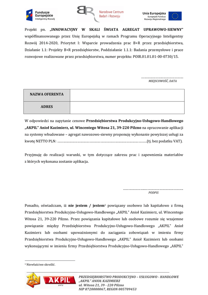 Projekt pn. „INNOWACYJNY W SKALI ŚWIATA AGREGAT UPRAWOWO-SIEWNY” współfinansowanego przez Unię Europejską w ramach Programu Operacyjnego Inteligentny Rozwój 2014-2020, Priorytet I: Wsparcie prowadzenia prac B+R przez przedsiębiorstwa, Działanie 1.1: Projekty B+R przedsiębiorstw, Poddziałanie 1.1.1: Badania przemysłowe i prace rozwojowe realizowane przez przedsiębiorstwa, numer projektu: POIR.01.01.01-00-0730/15. …………………..………………… MIEJSCOWOŚĆ, DATA NAZWA OFERENTA ADRES W odpowiedzi na zapytanie cenowe Przedsiębiorstwa Produkcyjno-Usługowo-Handlowego „AKPIL” Anioł Kazimierz, ul. Wincentego Witosa 21, 39-220 Pilzno na opracowanie aplikacji na systemy wbudowane – agregat nawozowo-siewny proponuję wykonanie powyższej usługi za kwotę NETTO PLN: …………………………………………………………………………………(tj. bez podatku VAT). Przyjmuję do realizacji warunki, w tym dotyczące zakresu prac i zapewnienia materiałów z których wykonana zostanie aplikacja. …………………..…………………………………. PODPIS Ponadto, oświadczam, iż nie jestem / jestem1 powiązany osobowo lub kapitałowo z firmą Przedsiębiorstwa Produkcyjno-Usługowo-Handlowego „AKPIL” Anioł Kazimierz, ul. Wincentego Witosa 21, 39-220 Pilzno. Przez powiązania kapitałowe lub osobowe rozumie się wzajemne powiązanie między Przedsiębiorstwa Produkcyjno-Usługowo-Handlowego „AKPIL” Anioł Kazimierz lub osobami upoważnionymi do zaciągania zobowiązań w imieniu firmy Przedsiębiorstwa Produkcyjno-Usługowo-Handlowego „AKPIL” Anioł Kazimierz lub osobami wykonującymi w imieniu firmy Przedsiębiorstwa Produkcyjno-Usługowo-Handlowego „AKPIL” 1 Niewłaściwe skreślić. PRZEDSIĘBIORSTWO PRODUKCYJNO – USŁUGOWO - HANDLOWE „AKPIL” ANIOŁ KAZIMIERZ ul. Witosa 21, 39 - 220 Pilzno NIP 8720000067, REGON 005709453 Anioł Kazimierz czynności związane z przygotowaniem i przeprowadzeniem procedury wyboru wykonawcy a Wykonawcą, polegające w szczególności na: • uczestniczeniu w spółce jako wspólnik spółki cywilnej lub spółki osobowej; • posiadaniu co najmniej 10% udziałów lub akcji, • pełnieniu funkcji członka organu nadzorczego lub zarządzającego, prokurenta, pełnomocnika, • pozostawaniu w związku małżeńskim, w stosunku pokrewieństwa lub powinowactwa w linii prostej, pokrewieństwa lub powinowactwa w linii bocznej do drugiego stopnia lub w stosunku przysposobienia, opieki lub kurateli. …………………..…………………………………. PODPIS PRZEDSIĘBIORSTWO PRODUKCYJNO – USŁUGOWO - HANDLOWE „AKPIL” ANIOŁ KAZIMIERZ ul. Witosa 21, 39 - 220 Pilzno NIP 8720000067, REGON 005709453