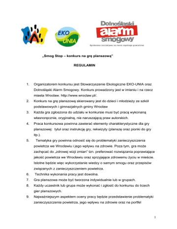 „Smog Stop – konkurs na grę planszową” REGULAMIN 1. Organizatorem konkursu jest Stowarzyszenie Ekologiczne EKO-UNIA oraz Dolnośląski Alarm Smogowy. Konkurs prowadzony jest w imieniu i na rzecz miasta Wrocław. http://www.wroclaw.pl/. 2. Konkurs na grę planszową skierowany jest do dzieci i młodzieży ze szkół podstawowych i gimnazjalnych gminy Wrocław 3. Każda gra zgłoszona do udziału w konkursie musi być pracą wykonaną własnoręcznie, oryginalną, nie naruszającą praw autorskich. 4. Praca konkursowa powinna zawierać elementy charakterystyczne dla gry planszowej: tytuł oraz instrukcję gry, rekwizyty (planszę oraz pionki do gry itp.). 5. Tematyka gry powinna odnosić się do problematyki zanieczyszczenia powietrza we Wrocławiu i jego wpływu na zdrowie. Poza tym, gra może zachęcać do „zdrowej wizji zmian” tzn. preferować rozwiązania poprawiające jakość powietrza we Wrocławiu oraz sprzyjające zdrowemu życiu w mieście. Istotne będzie więc wykorzystanie wiedzy o samym smogu oraz przepisów związanych z zanieczyszczeniem powietrza. 6. Technika wykonania pracy jest dowolna. 7. Gra planszowa może być tworzona indywidualnie lub w grupach. 8. Każdy uczestnik lub grupa może wykonać i zgłosić do konkursu do trzech gier planszowych. 9. Najważniejszym aspektem oceny pracy będzie przedstawienie problematyki zanieczyszczenia powietrza, jego wpływu na zdrowie oraz na portfel 1 obywateli jak również proponowanie rozwiązań tego problemu. Ważne będzie zatem wykazanie się nie tylko pomysłowością, ale również wiedzą dotyczącą smogu we Wrocławiu jak również przepisów prawnych w zakresie zanieczyszczenia powietrza. Ocenie podlegać będą też pomysł, staranność wykonania, estetyka pracy. 10. Praca nie powinna być podpisana. Należy podać nazwę szkoły i numer pracy, który dla uczestnika konkursu bądź grupy ustala szkoła. 11. Prace konkursowe oceniane będą w dwóch kategoriach wiekowych: • szkoła podstawowa kl. IV - VI • gimnazjum 12. Przewidziane są nagrody dla zwycięzców (osób indywidualnych bądź grup). Pula nagród wynosi 3000 zł. Poza tym nagrodami będą koszulki i maski antysmogowe. 13. Prezentacja zwycięskich prac będzie miała miejsce na stronie Dolnośląskiego Alarmu Smogowego http://dolnoslaskialarmsmogowy.pl/ oraz EKO-UNII http://eko-unia.org.pl/ 14. Do oceny konkursu zostanie powołane jury w skład którego wchodzić będą m.in. przedstawiciele Dolnośląskiego Alarmu Smogowego, Krakowskiego Alarmu Smogowego, Przedstawiciele Urzędu Miasta Wrocławia 15. Prace należy składać w siedzibie organizatora czyli Stowarzyszenia Ekologicznego EKO-UNIA ul. Białoskórnicza 26, 50-134 Wrocław do 31.10.2015 do godziny 14. Biuro EKO-UNII czynne codziennie poniedziałekpiątek 10.00-15.00 16. Termin rozstrzygnięcia i wyniki konkursu zostaną ogłoszone na stronie internetowej Dolnośląskiego Alarmu Smogowego oraz stowarzyszenia ekologicznego EKO-UNIA. Nagrodzeni uczestnicy zostaną powiadomieni telefonicznie lub mailowo. 17. Udział w Konkursie jest jednoznaczny z nieodpłatnym udzieleniem prawa na wykorzystanie prac na następujących polach eksploatacji: druku w dowolnej liczbie publikacji i w dowolnym nakładzie, używania w Internecie oraz w innych formach utrwaleń nadających się do rozpowszechniania (np. nośniki magnetyczne, elektroniczne, optyczne, CD-ROM wprowadzenie do obrotu, 2 wprowadzenie do pamięci komputera), a także prezentowania prac na wystawach oraz zgodą na ich pierwsze publiczne wykorzystanie. Wrocław, sierpień 2015 3