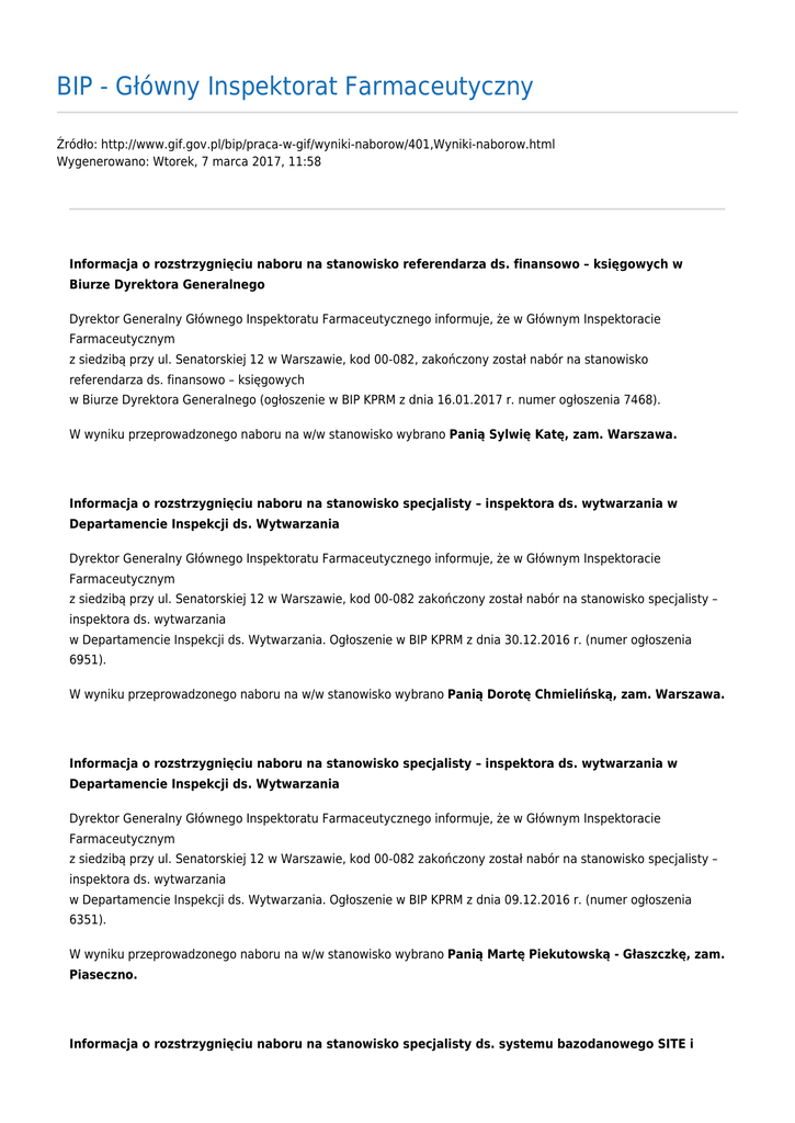 BIP - Główny Inspektorat Farmaceutyczny Źródło: http://www.gif.gov.pl/bip/praca-w-gif/wyniki-naborow/401,Wyniki-naborow.html Wygenerowano: Wtorek, 7 marca 2017, 11:58 Informacja o rozstrzygnięciu naboru na stanowisko referendarza ds. finansowo – księgowych w Biurze Dyrektora Generalnego Dyrektor Generalny Głównego Inspektoratu Farmaceutycznego informuje, że w Głównym Inspektoracie Farmaceutycznym z siedzibą przy ul. Senatorskiej 12 w Warszawie, kod 00-082, zakończony został nabór na stanowisko referendarza ds. finansowo – księgowych w Biurze Dyrektora Generalnego (ogłoszenie w BIP KPRM z dnia 16.01.2017 r. numer ogłoszenia 7468). W wyniku przeprowadzonego naboru na w/w stanowisko wybrano Panią Sylwię Katę, zam. Warszawa. Informacja o rozstrzygnięciu naboru na stanowisko specjalisty – inspektora ds. wytwarzania w Departamencie Inspekcji ds. Wytwarzania Dyrektor Generalny Głównego Inspektoratu Farmaceutycznego informuje, że w Głównym Inspektoracie Farmaceutycznym z siedzibą przy ul. Senatorskiej 12 w Warszawie, kod 00-082 zakończony został nabór na stanowisko specjalisty – inspektora ds. wytwarzania w Departamencie Inspekcji ds. Wytwarzania. Ogłoszenie w BIP KPRM z dnia 30.12.2016 r. (numer ogłoszenia 6951). W wyniku przeprowadzonego naboru na w/w stanowisko wybrano Panią Dorotę Chmielińską, zam. Warszawa. Informacja o rozstrzygnięciu naboru na stanowisko specjalisty – inspektora ds. wytwarzania w Departamencie Inspekcji ds. Wytwarzania Dyrektor Generalny Głównego Inspektoratu Farmaceutycznego informuje, że w Głównym Inspektoracie Farmaceutycznym z siedzibą przy ul. Senatorskiej 12 w Warszawie, kod 00-082 zakończony został nabór na stanowisko specjalisty – inspektora ds. wytwarzania w Departamencie Inspekcji ds. Wytwarzania. Ogłoszenie w BIP KPRM z dnia 09.12.2016 r. (numer ogłoszenia 6351). W wyniku przeprowadzonego naboru na w/w stanowisko wybrano Panią Martę Piekutowską - Głaszczkę, zam. Piaseczno. Informacja o rozstrzygnięciu naboru na stanowisko specjalisty ds. systemu bazodanowego SITE i EudraGMP dla substancji czynnych w Departamencie Inspekcji ds. Wytwarzania Dyrektor Generalny Głównego Inspektoratu Farmaceutycznego informuje, że w Głównym Inspektoracie Farmaceutycznym z siedzibą przy ul. Senatorskiej 12 w Warszawie, kod 00-082, zakończony został nabór na stanowisko specjalisty ds. systemu bazodanowego SITE i EudraGMP dla substancji czynnych w Departamencie Inspekcji ds. Wytwarzania (ogłoszenie w BIP KPRM z dnia 15.12.2016 r. numer ogłoszenia 6562). W wyniku przeprowadzonego naboru na w/w stanowisko wybrano Panią Małgorzatę Gajos, zam. Warszawa. Informacja o rozstrzygnięciu naboru na stanowisko specjalisty – inspektora ds. obrotu hurtowego w Departamencie Nadzoru Dyrektor Generalny Głównego Inspektoratu Farmaceutycznego informuje, że w Głównym Inspektoracie Farmaceutycznym z siedzibą przy ul. Senatorskiej 12 w Warszawie, kod 00-082, zakończony został nabór na stanowisko specjalisty – inspektora ds. obrotu hurtowego w Departamencie Nadzoru (ogłoszenie w BIP KPRM z dnia 21.11.2016 r. numer ogłoszenia 5697). Brak ofert kandydatów/kandydatek. Informacja o rozstrzygnięciu naboru na stanowisko starszego specjalisty ds. legislacji w Departamencie Prawnym Dyrektor Generalny Głównego Inspektoratu Farmaceutycznego informuje, że w Głównym Inspektoracie Farmaceutycznym z siedzibą przy ul. Senatorskiej 12 w Warszawie, kod 00-082, zakończony został nabór na stanowisko starszego specjalisty ds. legislacji w Departamencie Prawnym (ogłoszenie w BIP KPRM z dnia 11.10.2016 r. ogłoszenie numer 4388). W wyniku przeprowadzonego naboru na w/w stanowisko wybrano Pana Kamila Rasińskiego, zam. Warszawa. Informacja o rozstrzygnięciu naboru na stanowisko specjalisty ds. organizacji w Biurze Dyrektora Generalnego Dyrektor Generalny Głównego Inspektoratu Farmaceutycznego informuje, że w Głównym Inspektoracie Farmaceutycznym z siedzibą przy ul. Senatorskiej 12 w Warszawie, kod 00-082, zakończony został nabór na stanowisko specjalisty ds. organizacji w Biurze Dyrektora Generalnego (ogłoszenie w BIP KPRM z dnia 29.10.2016 r. numer ogłoszenia 5057). W wyniku przeprowadzonego naboru na w/w stanowisko wybrano Panią Angelikę Gagon, zam. Warszawa. Informacja o rozstrzygnięciu naboru na stanowisko specjalisty – inspektora ds. obrotu hurtowego w Departamencie Nadzoru Dyrektor Generalny Głównego Inspektoratu Farmaceutycznego informuje, że w Głównym Inspektoracie Farmaceutycznym z siedzibą przy ul. Senatorskiej 12 w Warszawie, kod 00-082, zakończony został nabór na stanowisko specjalisty – inspektora ds. obrotu hurtowego w Departamencie Nadzoru (ogłoszenie w BIP KPRM z dnia 4.10.2016 r. numer ogłoszenia 4168). Oferty kandydatów/kandydatek nie spełniały wymogów formalnych. Informacja o rozstrzygnięciu naboru na stanowisko specjalisty ds. monitorowania obrotu produktami leczniczymi w Departamencie Nadzoru Dyrektor Generalny Głównego Inspektoratu Farmaceutycznego informuje, że w Głównym Inspektoracie Farmaceutycznym z siedzibą przy ul. Senatorskiej 12 w Warszawie, kod 00-082, zakończony został nabór na stanowisko specjalisty ds. monitorowania obrotu produktami leczniczymi w Departamencie Nadzoru (ogłoszenie w BIP KPRM z dnia 16.09.2016 r. numer ogłoszenia 3621). W wyniku przeprowadzonego naboru na w/w stanowisko wybrano: 1. Pana Wojciecha Orzechowskiego, zam. Warszawa 2. Panią Agnieszkę Szafko, zam. Warszawa. Informacja o rozstrzygnięciu naboru na stanowisko specjalisty – inspektora ds. wytwarzania w Departamencie Inspekcji ds. Wytwarzania Dyrektor Generalny Głównego Inspektoratu Farmaceutycznego informuje, że w Głównym Inspektoracie Farmaceutycznym z siedzibą przy ul. Senatorskiej 12 w Warszawie, kod 00-082 zakończony został nabór na stanowisko specjalisty – inspektora ds. wytwarzania w Departamencie Inspekcji ds. Wytwarzania (ogłoszenie w BIP KPRM z dn