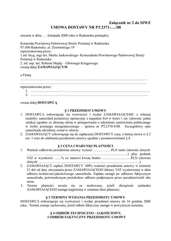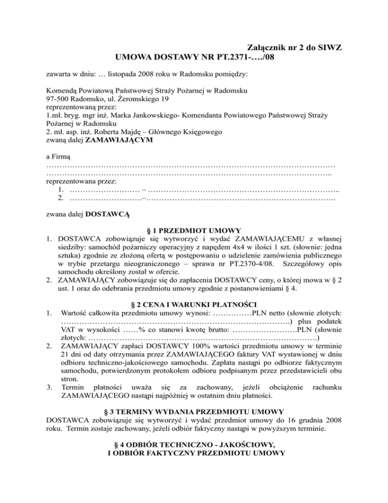 Załącznik nr 2 do SIWZ UMOWA DOSTAWY NR PT.2371-…./08 zawarta w dniu: … listopada 2008 roku w Radomsku pomiędzy: Komendą Powiatową Państwowej Straży Pożarnej w Radomsku 97-500 Radomsko, ul. Żeromskiego 19 reprezentowaną przez: 1.mł. bryg. mgr inż. Marka Jankowskiego- Komendanta Powiatowego Państwowej Straży Pożarnej w Radomsku 2. mł. asp. inż. Roberta Majdę – Głównego Księgowego zwaną dalej ZAMAWIAJĄCYM a Firmą ………………………………………………………………………………………………… ……………………………………………………………………………………………….. reprezentowana przez: 1. ……………………… – ……………………………………………………………….. 2. ……………………….–………………………………………………………………. zwana dalej DOSTAWCĄ § 1 PRZEDMIOT UMOWY 1. DOSTAWCA zobowiązuje się wytworzyć i wydać ZAMAWIAJĄCEMU z własnej siedziby: samochód pożarniczy operacyjny z napędem 4x4 w ilości 1 szt. (słownie: jedna sztuka) zgodnie ze złożoną ofertą w postępowaniu o udzielenie zamówienia publicznego w trybie przetargu nieograniczonego – sprawa nr PT.2370-4/08. Szczegółowy opis samochodu określony został w ofercie. 2. ZAMAWIAJĄCY zobowiązuje się do zapłacenia DOSTAWCY ceny, o której mowa w § 2 ust. 1 oraz do odebrania przedmiotu umowy zgodnie z postanowieniami § 4. 1. 2. 3. § 2 CENA I WARUNKI PŁATNOŚCI Wartość całkowita przedmiotu umowy wynosi: ……………PLN netto (słownie złotych: …………………………………………………………………………….) plus podatek VAT w wysokości ……% co stanowi kwotę brutto: …………………….PLN (słownie złotych: …………………………………………………………………………….) ZAMAWIAJĄCY zapłaci DOSTAWCY 100% wartości przedmiotu umowy w terminie 21 dni od daty otrzymania przez ZAMAWIAJĄCEGO faktury VAT wystawionej w dniu odbioru techniczno-jakościowego samochodu. Zapłata nastąpi po odbiorze faktycznym samochodu, potwierdzonym protokołem odbioru podpisanym przez przedstawicieli obu stron. Termin płatności uważa się za zachowany, jeżeli obciążenie rachunku ZAMAWIAJĄCEGO nastąpi najpóźniej w ostatnim dniu płatności. § 3 TERMINY WYDANIA PRZEDMIOTU UMOWY DOSTAWCA zobowiązuje się wytworzyć i wydać przedmiot umowy do 16 grudnia 2008 roku. Termin zostaje zachowany, jeżeli odbiór faktyczny nastąpi w powyższym terminie. § 4 ODBIÓR TECHNICZNO - JAKOŚCIOWY, I ODBIÓR FAKTYCZNY PRZEDMIOTU UMOWY 1. DOSTAWCA pisemnie zawiadomi ZAMAWIAJĄCEGO o terminie, od którego przedmiot umowy będzie gotowy do odbioru techniczno-jakościowego. Termin ten powinien być określony, co najmniej na 2 dni przed terminem odbioru przedmiotu umowy, o którym mowa w § 3 niniejszej umowy. ZAMAWIAJĄCY przystąpi do odbioru techniczno-jakościowego w ciągu 1 dnia od dnia otrzymania zawiadomienia. Strony dopuszczają zawiadomienie w formie faxu. /48 44 685 94 10/ 2. Odbiór techniczno - jakościowy pojazdu odbędzie się w siedzibie DOSTAWCY w terminie określonym przez ZAMAWIAJĄCEGO po otrzymaniu zawiadomienia DOSTAWCY, o którym mowa w ust. 1. 3. ZAMAWIAJĄCY odmówi odbioru przedmiotu umowy, jeśli nie będzie on odpowiadał opisowi zawartemu w złożonej ofercie. W takim przypadku DOSTAWCA zobowiązuje się do niezwłocznego dokonania zmian w samochodzie zgodnie z opisem. Ustęp ten nie narusza postanowień dotyczących kar umownych i odstąpienia od umowy. 4. W przypadku stwierdzenia podczas odbioru techniczno - jakościowego usterek, DOSTAWCA zobowiązuje się do ich niezwłocznego usunięcia lub wymiany samochodu na wolny od usterek w terminie wyznaczonym przez ZAMAWIAJĄCEGO. Ustęp ten nie narusza postanowień dotyczących kar umownych i odstąpienia od umowy. 5. Odbioru techniczno - jakościowego pojazdu dokona 2 pełnomocników ZAMAWIAJĄCEGO w obecności, co najmniej 1 pełnomocnika DOSTAWCY. 6. Odbiór faktyczny pojazdu odbędzie się w siedzibie DOSTAWCY w terminie uzgodnionym przez strony podczas odbioru techniczno -jakościowego. Odbioru faktycznego samochodu dokona 2 pełnomocników ZAMAWIAJĄCEGO w obecności, co najmniej 1 pełnomocnika DOSTAWCY. Protokół odbioru przedmiotu umowy, podpisany przez obie strony, zostanie sporządzony w 2 egzemplarzach, po 1 egzemplarzu dla każdej ze stron. 7. Szkolenie z zakresu obsługi podstawowej przedmiotu umowy, dla 2 osób (przedstawicieli ZAMAWIAJĄCEGO) odbędzie się w terminie odbioru faktycznego. § 5 DOKUMENTACJA TECHNICZNA Do samochodu DOSTAWCA zobowiązuje się dołączyć: 1. Instrukcję obsługi i konserwacji samochodu oraz wyposażenia w języku polskim. 2. Książkę gwarancyjną w języku polskim. 3. Dokumenty niezbędne do rejestracji pojazdu jako pożarniczego uprzywilejowanego w ruchu /faktura, świadectwo homologacji, karta pojazdu, pierwsze badania techniczne, opinia rzeczoznawcy itp./ - w dniu odbioru techniczno-jakościowego lub wcześniej. § 6 GWARANCJA I SERWIS 1. DOSTAWCA udziela ZAMAWIAJĄCEMU na przedmiot umowy 36 miesięcy lub 100000 km pełnej gwarancji jakości. Okres gwarancji liczy się od daty odbioru faktycznego. 2. W okresie gwarancji wszystkie naprawy przeprowadzone będą w siedzibie ZAMAWIAJĄCEGO przez autoryzowany serwis i na koszt oraz ryzyko DOSTAWCY w ciągu 72 godzin od daty otrzymania zgłoszenia usterki od ZAMAWIAJĄCEGO. Do okresu naprawy nie wlicza się dni ustawowo wolnych od pracy obowiązujących w Polsce. 3. W przypadku zaistnienia w okresie gwarancji konieczności przemieszczenia samochodu do siedziby DOSTAWCY w związku ze stwierdzeniem usterek, których nie można usunąć w siedzibie ZAMAWIAJĄCEGO, przemieszczenia pojazdu na własny koszt i ryzyko dokonuje DOSTAWCA. Przeglądy gwarancyjne będą wykonywane w siedzibie DOSTAWCY lub w Autoryzowanym Punkcie Serwisowym wsk