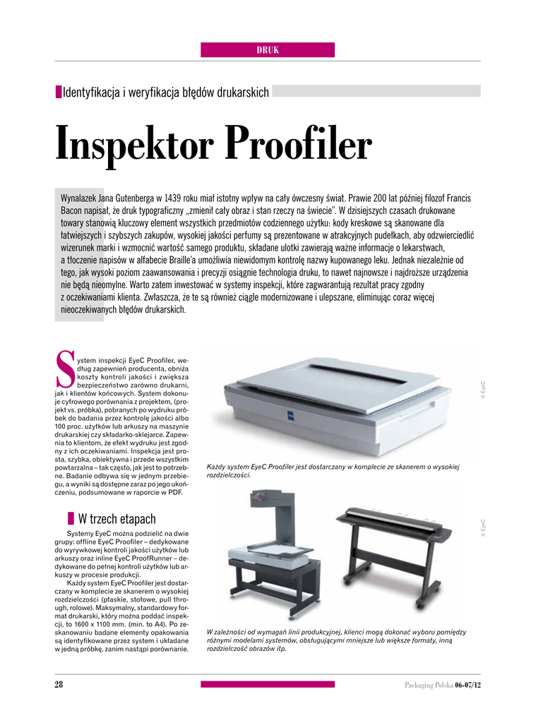 DRUK zIdentyfikacja i weryfikacja błędów drukarskich Inspektor Proofiler Wynalazek Jana Gutenberga w 1439 roku miał istotny wpływ na cały ówczesny świat. Prawie 200 lat później filozof Francis Bacon napisał, że druk typograficzny „zmienił cały obraz i stan rzeczy na świecie”. W dzisiejszych czasach drukowane towary stanowią kluczowy element wszystkich przedmiotów codziennego użytku: kody kreskowe są skanowane dla łatwiejszych i szybszych zakupów, wysokiej jakości perfumy są prezentowane w atrakcyjnych pudełkach, aby odzwierciedlić wizerunek marki i wzmocnić wartość samego produktu, składane ulotki zawierają ważne informacje o lekarstwach, a tłoczenie napisów w alfabecie Braille’a umożliwia niewidomym kontrolę nazwy kupowanego leku. Jednak niezależnie od tego, jak wysoki poziom zaawansowania i precyzji osiągnie technologia druku, to nawet najnowsze i najdroższe urządzenia nie będą nieomylne. Warto zatem inwestować w systemy inspekcji, które zagwarantują rezultat pracy zgodny z oczekiwaniami klienta. Zwłaszcza, że te są również ciągle modernizowane i ulepszane, eliminując coraz więcej nieoczekiwanych błędów drukarskich. © EyeC S ystem inspekcji EyeC Proofiler, według zapewnień producenta, obniża koszty kontroli jakości i zwiększa bezpieczeństwo zarówno drukarni, jak i klientów końcowych. System dokonuje cyfrowego porównania z projektem, (projekt vs. próbka), pobranych po wydruku próbek do badania przez kontrolę jakości albo 100 proc. użytków lub arkuszy na maszynie drukarskiej czy składarko-sklejarce. Zapewnia to klientom, że efekt wydruku jest zgodny z ich oczekiwaniami. Inspekcja jest prosta, szybka, obiektywna i przede wszystkim powtarzalna – tak często, jak jest to potrzebne. Badanie odbywa się w jednym przebiegu, a wyniki są dostępne zaraz po jego ukończeniu, podsumowane w raporcie w PDF. Każdy system EyeC Proofiler jest dostarczany w komplecie ze skanerem o wysokiej rozdzielczości. Systemy EyeC można podzielić na dwie grupy: offline EyeC Proofiler – dedykowane do wyrywkowej kontroli jakości użytków lub arkuszy oraz inline EyeC ProofRunner – dedykowane do pełnej kontroli użytków lub arkuszy w procesie produkcji. Każdy system EyeC Proofiler jest dostarczany w komplecie ze skanerem o wysokiej rozdzielczości (płaskie, stołowe, pull through, rolowe). Maksymalny, standardowy format drukarski, który można poddać inspekcji, to 1600 x 1100 mm. (min. to A4). Po zeskanowaniu badane elementy opakowania są identyfikowane przez system i układane w jedną próbkę, zanim nastąpi porównanie. 28 © EyeC z W trzech etapach W zależności od wymagań linii produkcyjnej, klienci mogą dokonać wyboru pomiędzy różnymi modelami systemów, obsługującymi mniejsze lub większe formaty, inną rozdzielczość obrazów itp. Packaging Polska 06-07/12 © EyeC © EyeC DRUK Model ProofRoller jest przystosowany do inspekcji obiektów cylindrycznych. System sygnalizuje wykrycie defektów, takich jak brakujące litery lub znaki interpunkcyjne w sposób umożliwiający szybką identyfikację zakwestionowanych elementów. EyeC Proofiler zaprojektowano do wykrywania różnic między zatwierdzonym projektem a próbkami z linii produkcyjnej. Może wykonywać inspekcje ulotek (PILs), opakowań kartonowych i etykiet. Wszystkie produkty EyeC są wytwarzane zgodnie z zaleceniami GAMP4 i spełniają wymagania techniczne określone w CFR 21 Part 11. © Fotolia Aplikacja sygnalizuje wykrycie defektów, takich jak brakujące litery lub znaki interpunkcyjne, odchylenia kolorów, kodów kreskowych, kodów Data Matrix, w sposób umożliwiający szybką identyfikację zakwestionowanych elementów. Mechanizm analizy jest w stanie rozróżnić różne typy błędów, dzięki czemu niewielkie usterki wynikające z zastosowanej techniki drukarskiej mogą być uznane za akceptowalne. Zasadniczo proces odbywa się w trzech etapach – skanowanie próbki, automatyczna inspekcja i drukowanie raportu. Najczęściej identyfikowane błędy to m.in. brakujące części liter (także w 5-punktowej czcionce), wypełnione środki liter, smugi w obszarze tekstu, braki lub odchylenia koloru czy plamki. Natomiast jeszcze na etapie przygotowań do druku można wykryć nieprawidłowości w czcionce (np. Arial zamiast Helvetiki), niezamierzone wytłuszczenie lub kursywę, brakujące znaki specjalne czy znaki diakrytyczne. Definiowalne zestawy ustawień pozwalają na precyzyjne określenie tolerancji na poszczególne rodzaje odchyleń w zależności od wymagań użytkownika lub specyfiki produktów. Systemy ProofRunner instalowane są na maszynach drukujących (Heidelberg, KBA, Gallus) lub składarko-sklejarkach oraz przewijarkach. EyeC dysponuje szeroką gamą skanerów i opcji dla nowych i już zainstalowanych maszyn, oferując inspekcję od 270 d0 1270 mm z maksymalną prędkością przesuwu do 450 m/min. Inspekcji w locie poddawane są wszystkie elementy opakowania. z Zastosowanie Precyzyjna weryfikacja i proofing są ważne w każdej branży, jednak niektóre aplikacje wymagają szczególnej inspekcji. Na pewno należą do nich opakowania leków, a zwłaszcza ulotki – zwykle z wielojęzyczną treścią drukowaną małą czcionką na obu stronach materiału o niskiej gramaturze, np. 06-07/12 Packaging Polska 29 z Kody i symbole Braille’a Moduł inspekcji pozwala sprawdzić obecność punktów i poprawność ich rozmieszczenia, zapisaną treść, zgodność ze standardem Marburg medium oraz jakość wytłoczenia. tyfikowanie i sprawdzanie kodów na badanej próbce opakowania. Ten opcjonalny moduł oprogramowania wyświetla typ kodu i jego treść, przeprowadza ocenę ISO/ ANSI dla każdego zidentyfikowanego egzemplarza oraz generuje raport. Opcja ta działa z kodami UPC/EAn, Laetus, EAN/ UCC 128, kod 128, kod 39, ITF i innymi – w tym z większością RSS i kodami dwuwymiarowymi. Natomiast w aspekcie kodu Braille’a, moduł inspekcj