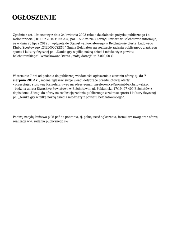 OGŁOSZENIE Zgodnie z art. 19a ustawy z dnia 24 kwietnia 2003 roku o działalności pożytku publicznego i o wolontariacie (Dz. U. z 2010 r. Nr 234, poz. 1536 ze zm.) Zarząd Powiatu w Bełchatowie informuje, że w dniu 20 lipca 2012 r. wpłynęła do Starostwa Powiatowego w Bełchatowie oferta Ludowego Klubu Sportowego „ZJEDNOCZENI” Gmina Bełchatów na realizację zadania publicznego z zakresu sportu i kultury fizycznej pn. „Nauka gry w piłkę nożną dzieci i młodzieży z powiatu bełchatowskiego”. Wnioskowana kwota „małej dotacji” to 7.000,00 zł. W terminie 7 dni od podania do publicznej wiadomości ogłoszenia o złożeniu oferty, tj. do 7 sierpnia 2012 r. , można zgłaszać swoje uwagi dotyczące przedmiotowej oferty: - przesyłając stosowny formularz uwag na adres e-mail: [email protected], - bądź na adres: Starostwo Powiatowe w Bełchatowie, ul. Pabianicka 17/19, 97-400 Bełchatów z dopiskiem: „Uwagi do oferty na realizację zadania publicznego z zakresu sportu i kultury fizycznej pn. „Nauka gry w piłkę nożną dzieci i młodzieży z powiatu bełchatowskiego”. Poniżej znajdą Państwo pliki pdf do pobrania, tj. pełną treść ogłoszenia, formularz uwag oraz ofertę realizacji ww. zadania publicznego.