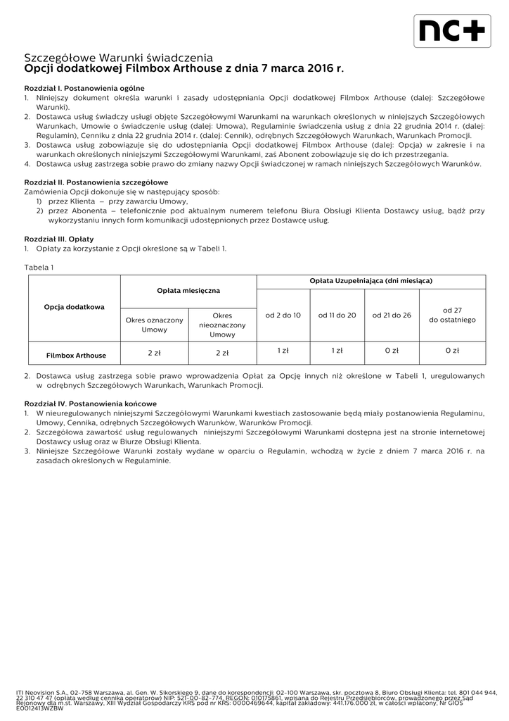Szczegółowe Warunki świadczenia Opcji dodatkowej Filmbox Arthouse z dnia 7 marca 2016 r. Rozdział I. Postanowienia ogólne 1. Niniejszy dokument określa warunki i zasady udostępniania Opcji dodatkowej Filmbox Arthouse (dalej: Szczegółowe Warunki). 2. Dostawca usług świadczy usługi objęte Szczegółowymi Warunkami na warunkach określonych w niniejszych Szczegółowych Warunkach, Umowie o świadczenie usług (dalej: Umowa), Regulaminie świadczenia usług z dnia 22 grudnia 2014 r. (dalej: Regulamin), Cenniku z dnia 22 grudnia 2014 r. (dalej: Cennik), odrębnych Szczegółowych Warunkach, Warunkach Promocji. 3. Dostawca usług zobowiązuje się do udostępniania Opcji dodatkowej Filmbox Arthouse (dalej: Opcja) w zakresie i na warunkach określonych niniejszymi Szczegółowymi Warunkami, zaś Abonent zobowiązuje się do ich przestrzegania. 4. Dostawca usług zastrzega sobie prawo do zmiany nazwy Opcji świadczonej w ramach niniejszych Szczegółowych Warunków. Rozdział II. Postanowienia szczegółowe Zamówienia Opcji dokonuje się w następujący sposób: 1) przez Klienta – przy zawarciu Umowy, 2) przez Abonenta – telefonicznie pod aktualnym numerem telefonu Biura Obsługi Klienta Dostawcy usług, bądź przy wykorzystaniu innych form komunikacji udostępnionych przez Dostawcę usług. Rozdział III. Opłaty 1. Opłaty za korzystanie z Opcji określone są w Tabeli 1. Tabela 1 Opłata Uzupełniająca (dni miesiąca) Opłata miesięczna Opcja dodatkowa Filmbox Arthouse Okres oznaczony Umowy Okres nieoznaczony Umowy od 2 do 10 od 11 do 20 od 21 do 26 od 27 do ostatniego 2 zł 2 zł 1 zł 1 zł 0 zł 0 zł 2. Dostawca usług zastrzega sobie prawo wprowadzenia Opłat za Opcję innych niż określone w Tabeli 1, uregulowanych w odrębnych Szczegółowych Warunkach, Warunkach Promocji. Rozdział IV. Postanowienia końcowe 1. W nieuregulowanych niniejszymi Szczegółowymi Warunkami kwestiach zastosowanie będą miały postanowienia Regulaminu, Umowy, Cennika, odrębnych Szczegółowych Warunków, Warunków Promocji. 2. Szczegółowa zawartość usług regulowanych niniejszymi Szczegółowymi Warunkami dostępna jest na stronie internetowej Dostawcy usług oraz w Biurze Obsługi Klienta. 3. Niniejsze Szczegółowe Warunki zostały wydane w oparciu o Regulamin, wchodzą w życie z dniem 7 marca 2016 r. na zasadach określonych w Regulaminie. ITI Neovision S.A., 02-758 Warszawa, al. Gen. W. Sikorskiego 9, dane do korespondencji: 02-100 Warszawa, skr. pocztowa 8, Biuro Obsługi Klienta: tel. 801 044 944, 22 310 47 47 (opłata według cennika operatorów) NIP: 521-00-82-774, REGON: 010175861, wpisana do Rejestru Przedsiębiorców, prowadzonego przez Sąd Rejonowy dla m.st. Warszawy, XIII Wydział Gospodarczy KRS pod nr KRS: 0000469644, kapitał zakładowy: 441.176.000 zł, w całości wpłacony, Nr GIOŚ E0012413WZBW