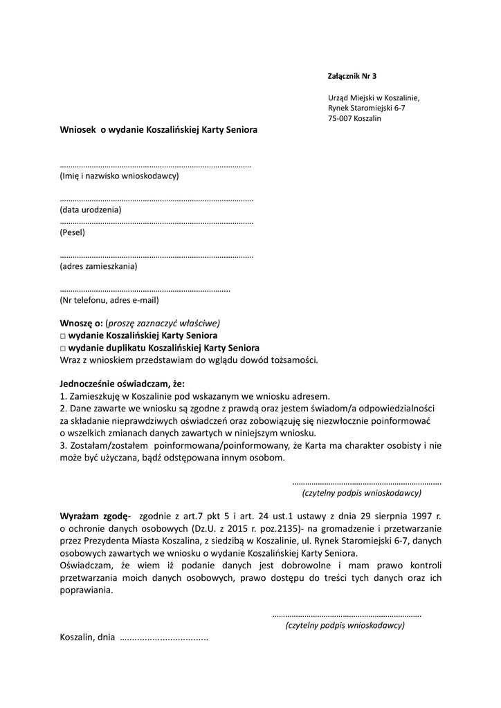 Załącznik Nr 3 Urząd Miejski w Koszalinie, Rynek Staromiejski 6-7 75-007 Koszalin Wniosek o wydanie Koszalińskiej Karty Seniora ……………………………………………………………………………… (Imię i nazwisko wnioskodawcy) ………………………………………………………………………………. (data urodzenia) ………………………………………………………………………………. (Pesel) ………………………………………………………………………………. (adres zamieszkania) …………………………………………………………………….. (Nr telefonu, adres e-mail) Wnoszę o: (proszę zaznaczyć właściwe) □ wydanie Koszalińskiej Karty Seniora □ wydanie duplikatu Koszalińskiej Karty Seniora Wraz z wnioskiem przedstawiam do wglądu dowód tożsamości. Jednocześnie oświadczam, że: 1. Zamieszkuję w Koszalinie pod wskazanym we wniosku adresem. 2. Dane zawarte we wniosku są zgodne z prawdą oraz jestem świadom/a odpowiedzialności za składanie nieprawdziwych oświadczeń oraz zobowiązuję się niezwłocznie poinformować o wszelkich zmianach danych zawartych w niniejszym wniosku. 3. Zostałam/zostałem poinformowana/poinformowany, że Karta ma charakter osobisty i nie może być użyczana, bądź odstępowana innym osobom. ……………………………………………………………. (czytelny podpis wnioskodawcy) Wyrażam zgodę- zgodnie z art.7 pkt 5 i art. 24 ust.1 ustawy z dnia 29 sierpnia 1997 r. o ochronie danych osobowych (Dz.U. z 2015 r. poz.2135)- na gromadzenie i przetwarzanie przez Prezydenta Miasta Koszalina, z siedzibą w Koszalinie, ul. Rynek Staromiejski 6-7, danych osobowych zawartych we wniosku o wydanie Koszalińskiej Karty Seniora. Oświadczam, że wiem iż podanie danych jest dobrowolne i mam prawo kontroli przetwarzania moich danych osobowych, prawo dostępu do treści tych danych oraz ich poprawiania. ……………………………………………………………. (czytelny podpis wnioskodawcy) Koszalin, dnia …................................ Koszalińską Kartę Seniora odebrałam/odebrałem ……………………………………………. (data) ………………………………………………………… (czytelny podpis wnioskodawcy) Do odbioru Karty upoważniam ………………………………………………………………………………………………. (imię i nazwisko osoby upoważnionej) ……………………………………………….. (data) …………………………………………………………….. (czytelny podpis wnioskodawcy) Adnotacje urzędowe: ……………………………………………………………………………………………………………………………………………….. ……………………………………………………………………………………………………………………………………………….. Koszalin, dnia ……………………… ……………………………………………………….. (podpis osoby upoważnionej) Pouczenie: Osoba składająca wniosek oraz osoba odbierająca Koszalińską Kartę Seniora obowiązana jest przedstawić do wglądu dokument tożsamości.