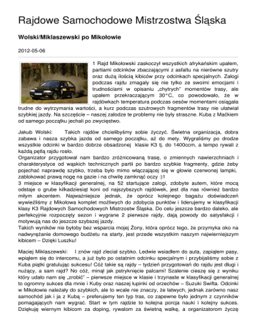 Rajdowe Samochodowe Mistrzostwa Śląska Wolski/Miklaszewski po Mikołowie 2012-05-06 1 Rajd Mikołowski zaskoczył wszystkich afrykańskim upałem, partiami odcinków zbaczającymi z asfaltu na nierówne szutry oraz dużą ilością kibiców przy odcinkach specjalnych. Załogi podczas rajdu zmagały się nie tylko ze swoimi emocjami i trudnościami w opisaniu „chytrych” momentów trasy, ale upałem przekraczającym 30°C, co powodowało, że w rajdówkach temperatura podczas oesów momentami osiągała trudne do wytrzymania wartości, a kurz podczas szutrowych fragmentów trasy nie ułatwiał szybkiej jazdy. Na szczęście – naszej załodze te problemy nie były straszne. Kuba z Maćkiem od samego początku jechali po zwycięstwo. Jakub Wolski: Takich rajdów chcielibyśmy sobie życzyć. Świetna organizacja, dobra zabawa i nasza szybka jazda od samego początku, aż do mety. Wygraliśmy po drodze wszystkie odcinki w bardzo dobrze obsadzonej klasie K3 tj. do 1400ccm, a tempo rywali z każdą pętlą rajdu rosło. Organizator przygotował nam bardzo zróżnicowaną trasę, o zmiennych nawierzchniach i charakterystyce od wąskich technicznych partii po bardzo szybkie fragmenty, gdzie żeby pojechać naprawdę szybko, trzeba było mimo włączającej się w głowie czerwonej lampki, zablokować prawą nogę na gazie i na chwilę zamknąć oczy :)1 3 miejsce w klasyfikacji generalnej, na 52 startujące załogi, zdobyte autem, które mocą odstaje o grube kilkadziesiąt koni od najszybszych rajdówek, jest dla nas również bardzo miłym akcentem. Najważniejsze jednak, że oprócz kolejnego bagażu doświadczeń wywieźliśmy z Mikołowa komplet możliwych do zdobycia punktów i liderujemy w klasyfikacji klasy K3 Rajdowych Samochodowych Mistrzostw Śląska. Do celu jeszcze bardzo daleko, ale perfekcyjnie rozpoczęty sezon i wygrane 2 pierwsze rajdy, dają powody do satysfakcji i motywują nas do jeszcze szybszej jazdy. Takich wyników nie byłoby bez wsparcia mojej Żony, która oprócz tego, że przymyka oko na nadwyrężanie domowego budżetu na starty, jest przede wszystkim naszym najwierniejszym kibicem – Dzięki Luszku! Maciej Miklaszewski: I znów rajd zleciał szybko. Ledwie wsiadłem do auta, zapiąłem pasy, wpiąłem się do intercomu, a już było po ostatnim odcinku specjalnym i przybijaliśmy sobie z Kuba piątki gratulując sukcesu! Cóż takie są rajdy – tydzień przygotowań do rajdu jest długi i nużący, a sam rajd? No cóż, minął jak pstryknięcie palcami! Szalenie cieszę się z wyniku który udało nam się „zrobić” – pierwsze miejsce w klasie i trzynaste w klasyfikacji generalnej to ogromny sukces dla mnie i Kuby oraz naszej łupinki od orzechów – Suzuki Swifta. Odcinki w Mikołowie należały do szybkich, ale to wcale nie znaczy, że łatwych, jednak zarówno nasz samochód jak i ja z Kubą – preferujemy ten typ tras, co zapewne było jednym z czynników pomagających nam wygrać. Start w tym rajdzie to kolejna porcja nauki i kolejny sukces. Dziękuję wiernym kibicom za doping, rywalom za świetną walkę, a organizatorom życzę sukcesów i powodzenia w organizacji rajdu za rok! Wielkie podziękowania należą się Marcinowi z QQ Motorsport za jak zawsze perfekcyjnie przygotowany samochód, oraz firmie Deuter S.C. Techniczne Elementy Poliuretanowe, za wsparcie techniczne. Relacja z 1 Rajdu Mikołowskiego: http://www.youtube.com/watch?v=kN9LYaCHh48 Onboardy: http://www.youtube.com/watch?v=aNXZ8hE_K54 http://www.youtube.com/watch?v=d0izIQrlIi0