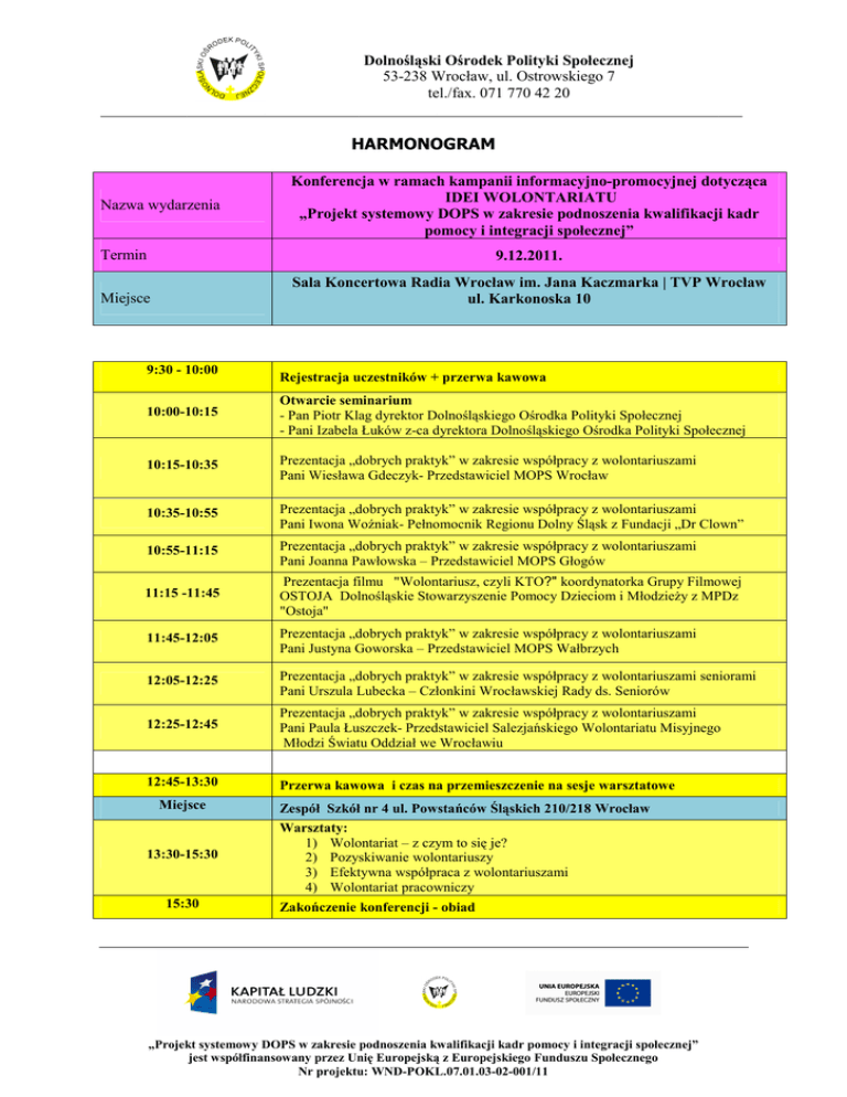 Dolnośląski Ośrodek Polityki Społecznej 53-238 Wrocław, ul. Ostrowskiego 7 tel./fax. 071 770 42 20 __________________________________________________________________________________ HARMONOGRAM Nazwa wydarzenia Konferencja w ramach kampanii informacyjno-promocyjnej dotycząca IDEI WOLONTARIATU „Projekt systemowy DOPS w zakresie podnoszenia kwalifikacji kadr pomocy i integracji społecznej” Termin 9.12.2011. Miejsce Sala Koncertowa Radia Wrocław im. Jana Kaczmarka | TVP Wrocław ul. Karkonoska 10 9:30 - 10:00 Rejestracja uczestników + przerwa kawowa 10:00-10:15 Otwarcie seminarium - Pan Piotr Klag dyrektor Dolnośląskiego Ośrodka Polityki Społecznej - Pani Izabela Łuków z-ca dyrektora Dolnośląskiego Ośrodka Polityki Społecznej 10:15-10:35 Prezentacja „dobrych praktyk” w zakresie współpracy z wolontariuszami Pani Wiesława Gdeczyk- Przedstawiciel MOPS Wrocław 10:35-10:55 Prezentacja „dobrych praktyk” w zakresie współpracy z wolontariuszami Pani Iwona Woźniak- Pełnomocnik Regionu Dolny Śląsk z Fundacji „Dr Clown” 10:55-11:15 Prezentacja „dobrych praktyk” w zakresie współpracy z wolontariuszami Pani Joanna Pawłowska – Przedstawiciel MOPS Głogów 11:15 -11:45 Prezentacja filmu "Wolontariusz, czyli KTO?" koordynatorka Grupy Filmowej OSTOJA Dolnośląskie Stowarzyszenie Pomocy Dzieciom i MłodzieŜy z MPDz "Ostoja" 11:45-12:05 Prezentacja „dobrych praktyk” w zakresie współpracy z wolontariuszami Pani Justyna Goworska – Przedstawiciel MOPS Wałbrzych 12:05-12:25 Prezentacja „dobrych praktyk” w zakresie współpracy z wolontariuszami seniorami Pani Urszula Lubecka – Członkini Wrocławskiej Rady ds. Seniorów 12:25-12:45 Prezentacja „dobrych praktyk” w zakresie współpracy z wolontariuszami Pani Paula Łuszczek- Przedstawiciel Salezjańskiego Wolontariatu Misyjnego Młodzi Światu Oddział we Wrocławiu 12:45-13:30 Przerwa kawowa i czas na przemieszczenie na sesje warsztatowe Miejsce 13:30-15:30 15:30 Zespół Szkół nr 4 ul. Powstańców Śląskich 210/218 Wrocław Warsztaty: 1) Wolontariat – z czym to się je? 2) Pozyskiwanie wolontariuszy 3) Efektywna współpraca z wolontariuszami 4) Wolontariat pracowniczy Zakończenie konferencji - obiad „Projekt systemowy DOPS w zakresie podnoszenia kwalifikacji kadr pomocy i integracji społecznej” jest współfinansowany przez Unię Europejską z Europejskiego Funduszu Społecznego Nr projektu: WND-POKL.07.01.03-02-001/11