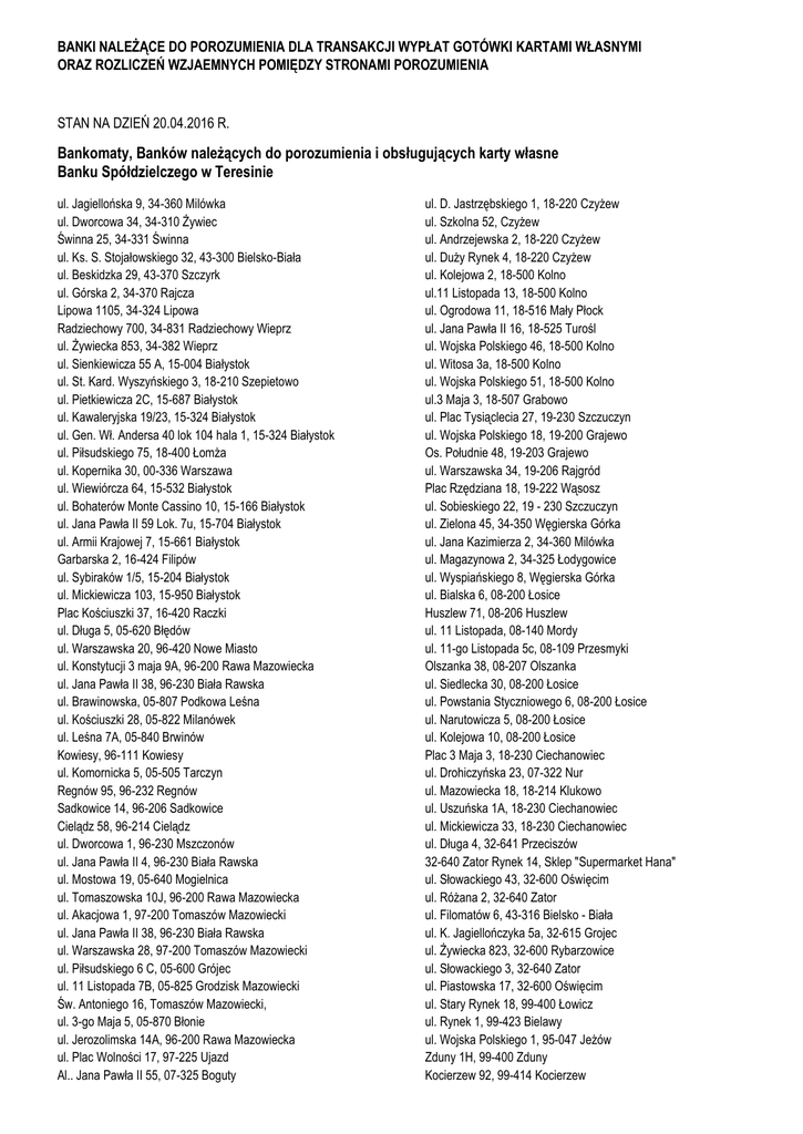 BANKI NALEŻĄCE DO POROZUMIENIA DLA TRANSAKCJI WYPŁAT GOTÓWKI KARTAMI WŁASNYMI ORAZ ROZLICZEŃ WZJAEMNYCH POMIĘDZY STRONAMI POROZUMIENIA STAN NA DZIEŃ 20.04.2016 R. Bankomaty, Banków należących do porozumienia i obsługujących karty własne Banku Spółdzielczego w Teresinie ul. Jagiellońska 9, 34-360 Milówka ul. Dworcowa 34, 34-310 Żywiec Świnna 25, 34-331 Świnna ul. Ks. S. Stojałowskiego 32, 43-300 Bielsko-Biała ul. Beskidzka 29, 43-370 Szczyrk ul. Górska 2, 34-370 Rajcza Lipowa 1105, 34-324 Lipowa Radziechowy 700, 34-831 Radziechowy Wieprz ul. Żywiecka 853, 34-382 Wieprz ul. Sienkiewicza 55 A, 15-004 Białystok ul. St. Kard. Wyszyńskiego 3, 18-210 Szepietowo ul. Pietkiewicza 2C, 15-687 Białystok ul. Kawaleryjska 19/23, 15-324 Białystok ul. Gen. Wł. Andersa 40 lok 104 hala 1, 15-324 Białystok ul. Piłsudskiego 75, 18-400 Łomża ul. Kopernika 30, 00-336 Warszawa ul. Wiewiórcza 64, 15-532 Białystok ul. Bohaterów Monte Cassino 10, 15-166 Białystok ul. Jana Pawła II 59 Lok. 7u, 15-704 Białystok ul. Armii Krajowej 7, 15-661 Białystok Garbarska 2, 16-424 Filipów ul. Sybiraków 1/5, 15-204 Białystok ul. Mickiewicza 103, 15-950 Białystok Plac Kościuszki 37, 16-420 Raczki ul. Długa 5, 05-620 Błędów ul. Warszawska 20, 96-420 Nowe Miasto ul. Konstytucji 3 maja 9A, 96-200 Rawa Mazowiecka ul. Jana Pawła II 38, 96-230 Biała Rawska ul. Brawinowska, 05-807 Podkowa Leśna ul. Kościuszki 28, 05-822 Milanówek ul. Leśna 7A, 05-840 Brwinów Kowiesy, 96-111 Kowiesy ul. Komornicka 5, 05-505 Tarczyn Regnów 95, 96-232 Regnów Sadkowice 14, 96-206 Sadkowice Cielądz 58, 96-214 Cielądz ul. Dworcowa 1, 96-230 Mszczonów ul. Jana Pawła II 4, 96-230 Biała Rawska ul. Mostowa 19, 05-640 Mogielnica ul. Tomaszowska 10J, 96-200 Rawa Mazowiecka ul. Akacjowa 1, 97-200 Tomaszów Mazowiecki ul. Jana Pawła II 38, 96-230 Biała Rawska ul. Warszawska 28, 97-200 Tomaszów Mazowiecki ul. Piłsudskiego 6 C, 05-600 Grójec ul. 11 Listopada 7B, 05-825 Grodzisk Mazowiecki Św. Antoniego 16, Tomaszów Mazowiecki, ul. 3-go Maja 5, 05-870 Błonie ul. Jerozolimska 14A, 96-200 Rawa Mazowiecka ul. Plac Wolności 17, 97-225 Ujazd Al.. Jana Pawła II 55, 07-325 Boguty ul. D. Jastrzębskiego 1, 18-220 Czyżew ul. Szkolna 52, Czyżew ul. Andrzejewska 2, 18-220 Czyżew ul. Duży Rynek 4, 18-220 Czyżew ul. Kolejowa 2, 18-500 Kolno ul.11 Listopada 13, 18-500 Kolno ul. Ogrodowa 11, 18-516 Mały Płock ul. Jana Pawła II 16, 18-525 Turośl ul. Wojska Polskiego 46, 18-500 Kolno ul. Witosa 3a, 18-500 Kolno ul. Wojska Polskiego 51, 18-500 Kolno ul.3 Maja 3, 18-507 Grabowo ul. Plac Tysiąclecia 27, 19-230 Szczuczyn ul. Wojska Polskiego 18, 19-200 Grajewo Os. Południe 48, 19-203 Grajewo ul. Warszawska 34, 19-206 Rajgród Plac Rzędziana 18, 19-222 Wąsosz ul. Sobieskiego 22, 19 - 230 Szczuczyn ul. Zielona 45, 34-350 Węgierska Górka ul. Jana Kazimierza 2, 34-360 Milówka ul. Magazynowa 2, 34-325 Łodygowice ul. Wyspiańskiego 8, Węgierska Górka ul. Bialska 6, 08-200 Łosice Huszlew 71, 08-206 Huszlew ul. 11 Listopada, 08-140 Mordy ul. 11-go Listopada 5c, 08-109 Przesmyki Olszanka 38, 08-207 Olszanka ul. Siedlecka 30, 08-200 Łosice ul. Powstania Styczniowego 6, 08-200 Łosice ul. Narutowicza 5, 08-200 Łosice ul. Kolejowa 10, 08-200 Łosice Plac 3 Maja 3, 18-230 Ciechanowiec ul. Drohiczyńska 23, 07-322 Nur ul. Mazowiecka 18, 18-214 Klukowo ul. Uszuńska 1A, 18-230 Ciechanowiec ul. Mickiewicza 33, 18-230 Ciechanowiec ul. Długa 4, 32-641 Przeciszów 32-640 Zator Rynek 14, Sklep "Supermarket Hana" ul. Słowackiego 43, 32-600 Oświęcim ul. Różana 2, 32-640 Zator ul. Filomatów 6, 43-316 Bielsko - Biała ul. K. Jagiellończyka 5a, 32-615 Grojec ul. Żywiecka 823, 32-600 Rybarzowice ul. Słowackiego 3, 32-640 Zator ul. Piastowska 17, 32-600 Oświęcim ul. Stary Rynek 18, 99-400 Łowicz ul. Rynek 1, 99-423 Bielawy ul. Wojska Polskiego 1, 95-047 Jeżów Zduny 1H, 99-400 Zduny Kocierzew 92, 99-414 Kocierzew Dmosin 11, 95-061 Dmosin ul. Targowa 2, 05-047 Lipce Reymontowskie ul. Główna 3, 99-434 Domaniewice Lubania, 96-208 Lubania Nieborów 208, 99-416 Nieborów Chąśno, 99-413 Chąśno Godzianów 162, 96-126 Godzianów Słupia 135, 96-128 Słupia ul. Starzyńskiego 10/12, 99-400 Łowicz Plac Zawiszy Czarnego 2, 99-423 Sobota ul. Warszawska 1, 99-400 Łowicz ul. Łęczycka 64, 99-400 Łowicz Złaków Kościelny 96, 99-440 Złaków Kościelny ul. Piłsudskiego 22, 08-430 Żelechów ul. Kościuszki 24, 08-400 Garwolin Al. Wyzwolenia 140, 08-400 Pilawa ul. Długa 38, 08-430 Żelechów ul. Korczaka 7, 08-400 Garwolin ul. Aleja Wyzwolenia 29, 08-440 Pilawa ul. Garwolińska 9, 08-412 Borowie ul. Reymonta, 08-470 Wilga Trojanów 66A, 08-455 Trojanów ul. Rynek 40, 08-441 Parysów Górzno 131, 08-404 Górzno ul. Rynek 7, 08-420 Miastków Kościelny ul. Stawiskowa 30, 18-421 Piątnica Pl. Kapt. Raginisa 32, 18-430 Wizna ul. Wiejska 4, 18-520 Stawiski ul. Ks. Anny 23/8, 18-400 Łomża ul. Szosza Zambrowska 1, 18-400 Łomża Aleja Legionów 60 B, 18-400 Łomża ul. M.J.Piłsudskiego 37, 23-100 Bychawa ul. Lubelska 64, 24-200 Bełżyce ul. Partyzantów 3, 23-110 Krzczonów Jabłonna 21, 23-114 Jabłonna Strzyżewice 107, 23-107 Strzyżewice Mętów 165, 20-388 Lublin 6 23-155 Zakrzew 28 ul. Pionierów 27, 11-600 Węgorzewo ul. Armii Krajowej 4, 11-600 Węgorzewo ul. Marii Konopnickiej 55, 19-520 Banie Mazurskie ul. Pocztowa 1, 11-610 Pozezdrze ul. Wojska Polskiego 18, 11-606 Budry ul. Wczasowa 1, 11-612 Kruklanki ul. Przesiedleńcza 1/3, 11-600 Węgorzewo Gilowice 792, 34-322 Gilowice ul. Wiejska 71 lok.1, 15-351 Białystok ul. Szpitalna 5, 18-200 Wysokie Mazowieckie ul. Główna 6, 18-208 Kulesze Kościelne ul. Jagiellońska 14, 18-200 Wysokie Mazowieckie ul. Białostocka 4, 18-200 Wysokie Mazowieckie ul. Białostocka 4, 18-200 Wysokie Mazowieckie Jabłonka Kościelna 22A, 18-200 Jabłonka Kościelna ul. Sieradzka 14a, 98-240 Szadek ul. Turecka 3, 98-215 Goszczanów ul. 20 Stycznia 8, 98-290 Warta ul. Turecka 35