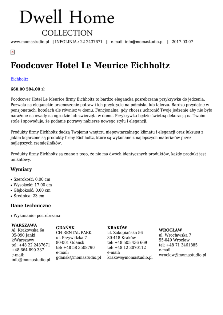 www.momastudio.pl | INFOLINIA.: 22 2437671 | e-mail: [email protected] | 2017-03-07 Foodcover Hotel Le Meurice Eichholtz Eichholtz 660.00 594.00 zł Foodcover Hotel Le Meurice firmy Eichholtz to bardzo elegancka posrebrzana przykrywka do jedzenia. Pozwala na eleganckie przenoszenie potraw i ich przykrycie na półmisku lub talerzu. Bardzo przydatne w pensjonatach, hotelach ale również w domu. Funcjonalna, gdy chcesz uchronić Twoje jedzenie aby nie było narażone na owady na ogrodzie lub zwierzęta w domu. Przykrywka będzie świetną dekoracją na Twoim stole i spowoduje, że podanie potrawy nabierze nowego stylu i elegancji. Produkty firmy Eichholtz dadzą Twojemu wnętrzu niepowtarzalnego klimatu i elegancji oraz luksusu z jakim kojarzone są produkty firmy Eichholtz, które są wykonane z najlepszych materiałów przez najlepszych rzemieślników. Produkty firmy Eichholtz są znane z tego, że nie ma dwóch identycznych produktów, każdy produkt jest unikatowy. Wymiary ● ● ● ● Szerokość: 0.00 cm Wysokość: 17.00 cm Głębokość: 0.00 cm Średnica: 23 cm Dane techniczne ● Wykonanie: posrebrzana WARSZAWA Al. Krakowska 6a 05-090 Janki k/Warszawy tel: +48 22 2437671 +48 664 890 337 e-mail: [email protected] GDAŃSK CH RENTAL PARK ul. Przywidzka 7 80-001 Gdańsk tel: +48 58 3508790 e-mail: [email protected] KRAKÓW ul. Zakopiańska 56 30-418 Kraków tel: +48 505 436 669 tel: +48 12 3070112 e-mail: [email protected] WROCŁAW ul. Wrocławska 7 55-040 Wrocław tel: +48 71 3461885 e-mail: [email protected]