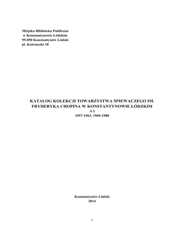 Miejska Biblioteka Publiczna w Konstantynowie Łódzkim 95-050 Konstantynów Łódzki pl. Kościuszki 10 KATALOG KOLEKCJI TOWARZYSTWA ŚPIEWACZEGO IM. FRYDERYKA CHOPINA W KONSTANTYNOWIE ŁÓDZKIM AI 1957-1963, 1969-1988 Konstantynów Łódzki 2014 1 Zawartość 1. Księga protokołów (1957-1960).........................................................................................................3 2. Księga protokołów (1960-1963).........................................................................................................3 3. Księga protokołów (1969-1973).........................................................................................................3 4. Księga protokołów (1973-1977).........................................................................................................3 5. Księga protokołów (1977-1980).........................................................................................................4 6. Księga protokołów (1981-1984).........................................................................................................4 7. Księga protokołów (1984-1988).........................................................................................................4 8. Zdjęcia................................................................................................................................................4 2 Towarzystwo Śpiewaczo-Muzyczne im. Fryderyka Chopina w Konstantynowie Łódzkim to jedna z najważniejszych i najdłużej działających instytucji. Początki datować można na pierwszą lub drugą dekadę XX wieku, gdy Konstantynów znajdował się jeszcze w zaborze carskim. Kultywując idee patriotyczne oraz propagując muzykę i obyczaje ludowe, Towarzystwo z krótkimi przerwami, działa do dnia dzisiejszego. 1. Księga protokołów (1957-1960) Opis fizyczny: Rękopis, karty zszyte (twarda oprawa), język polski, ss. (nieponumerowane) 154. Opis merytoryczny: Księga zawiera protokoły z posiedzeń Zarządu Towarzystwa z lat 1957-1960. Dotyczą one kwestii finansowych, organizacji chóru i innych bieżących spraw. 2. Księga protokołów (1960-1963) Opis fizyczny: Rękopis, karty zszyte (twarda oprawa), język polski, ss. (nieponumerowane) 150. Opis merytoryczny: Księga zawiera protokoły z posiedzeń Zarządu Towarzystwa z lat 1960-1963. Dotyczą one organizacji przyjęć okolicznościowych, kondycji finansowej Towarzystwa, jak i innych bieżących spraw. 3. Księga protokołów (1969-1973) Opis fizyczny: Rękopis, karty zszyte (twarda oprawa), język polski, ss. (nieponumerowane) 142. Opis merytoryczny: Księga zawiera protokoły z posiedzeń Zarządu Towarzystwa z lat 1969-1973. Dotyczą one kwestii przyjmowania nowych członków, organizacji chóru i imprez okolicznościowych oraz innych bieżących spraw. 4. Księga protokołów (1973-1977) Opis fizyczny: Rękopis, karty zszyte (miękka oprawa), język polski, ss. (nieponumerowane) 186. Opis merytoryczny: 3 Księga zawiera protokoły z posiedzeń Zarządu Towarzystwa z lat 1973-1977. Dotyczą one organizacji i udziału w koncertach w mieście jak i poza, wybory nowych władz Towarzystwa oraz innych, bieżących spraw. 5. Księga protokołów (1977-1980) Opis fizyczny: Rękopis, karty zszyte (miękka oprawa), język polski, ss. (nieponumerowane) 156. Opis merytoryczny: Księga zawiera protokoły z posiedzeń Zarządu Towarzystwa z lat 1977-1980. Dotyczą one organizacji różnych uroczystości okolicznościowych, występów na imprezach poza granicami miasta i spraw bieżących Towarzystwa. 6. Księga protokołów (1981-1984) Opis fizyczny: Rękopis, karty zszyte (miękka oprawa), język polski, ss. (nieponumerowane) 148. Opis merytoryczny: Księga zawiera protokoły z posiedzeń Zarządu Towarzystwa z lat 1981-1984. Dotyczą one uczestnictwa w różnych uroczystościach, kondycji finansowej Towarzystwa i innych spraw bieżących. 7. Księga protokołów (1984-1988) Opis fizyczny: Rękopis, karty zszyte (miękka oprawa), język polski, ss. (nieponumerowane) 168. Opis merytoryczny: Księga zawiera protokoły z posiedzeń Zarządu Towarzystwa z lat 1984-1988. Dotyczą one kondycji finansowej Towarzystwa, organizacji imprez okolicznościowych i innych, bieżących spraw. 8. Zdjęcia Opis merytoryczny: Zbiór (196) zdjęć członków Towarzystwa z 2004 roku. 4