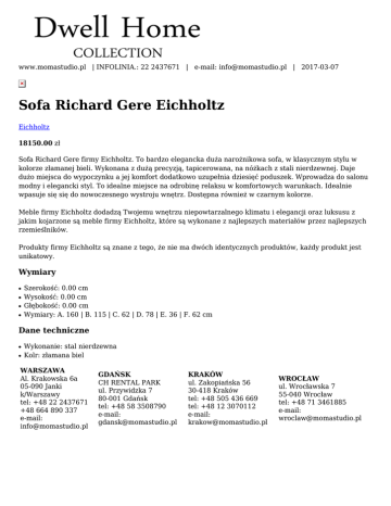 www.momastudio.pl | INFOLINIA.: 22 2437671 | e-mail: [email protected] | 2017-03-07 Sofa Richard Gere Eichholtz Eichholtz 18150.00 zł Sofa Richard Gere firmy Eichholtz. To bardzo elegancka duża narożnikowa sofa, w klasycznym stylu w kolorze złamanej bieli. Wykonana z dużą precyzją, tapicerowana, na nóżkach z stali nierdzewnej. Daje dużo miejsca do wypoczynku a jej komfort dodatkowo uzupełnia dziesięć poduszek. Wprowadza do salonu modny i elegancki styl. To idealne miejsce na odrobinę relaksu w komfortowych warunkach. Idealnie wpasuje się się do nowoczesnego wystroju wnętrz. Dostępna również w czarnym kolorze. Meble firmy Eichholtz dodadzą Twojemu wnętrzu niepowtarzalnego klimatu i elegancji oraz luksusu z jakim kojarzone są meble firmy Eichholtz, które są wykonane z najlepszych materiałów przez najlepszych rzemieślników. Produkty firmy Eichholtz są znane z tego, że nie ma dwóch identycznych produktów, każdy produkt jest unikatowy. Wymiary ● ● ● ● Szerokość: 0.00 cm Wysokość: 0.00 cm Głębokość: 0.00 cm Wymiary: A. 160 | B. 115 | C. 62 | D. 78 | E. 36 | F. 62 cm Dane techniczne ● ● Wykonanie: stal nierdzewna Kolr: złamana biel WARSZAWA Al. Krakowska 6a 05-090 Janki k/Warszawy tel: +48 22 2437671 +48 664 890 337 e-mail: [email protected] GDAŃSK CH RENTAL PARK ul. Przywidzka 7 80-001 Gdańsk tel: +48 58 3508790 e-mail: [email protected] KRAKÓW ul. Zakopiańska 56 30-418 Kraków tel: +48 505 436 669 tel: +48 12 3070112 e-mail: [email protected] WROCŁAW ul. Wrocławska 7 55-040 Wrocław tel: +48 71 3461885 e-mail: [email protected]