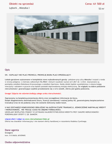 Obiekt na sprzedaż Cena: 61 500 zł Lębork , Mieszka I 53 m 2 Opis O% ‐ KUPUJĄCY NIE PŁACI PROWIZJI, PROWIZJĘ BIURA PŁACI SPRZEDAJĄCY! Lokale garażowe usytuowane w kompleksie nowo wybudowanych garaży położone przy ulicy Mieszka I (wjazd z ronda w stronę poligonu) o metrażu całkowitym 52,90m2, których wysokość wynosi od 3,8m2 do 2,4m2. Usytuowane są pomiędzy osiedlem Bolesława Krzywoustego a osiedlem Sportowa. Każdy obiekt będzie wyodrębniony z własna księgą wieczystą i udziałem w gruncie oraz będzie posiadał doprowadzoną energię elektryczną. Ze względu na dobre położenie nieruchomości gwarantujące szybkie przedostanie się z w/w osiedli, oferta jest godna polecenia. Uwaga! Zdjęcia nie odzwierciedlają całego uroku nieruchomości. Zapraszamy na bezpłatną prezentację oferty oraz szczegółowe informacje do biura. Dzięki długoletniemu doświadczeniu biura, licencji zawodowej i ważnej polisy OC, gwarantujemy bezpieczeństwo transakcji oraz że do podanej ceny nie zostanie doliczony żaden koszt. U NAS ZOSTANIESZ KOMPLEKSOWO OBSŁUŻONY NA KAŻDYM ETAPIE TRANSAKCJI, JEDNOCZEŚNIE NABYWAJĄC KREDYT I NIERUCHOMOŚĆ, NIE TRACĄC CZASU NA ZBĘDNE FORMALNOŚCI. UDZIELAMY BEZPŁATNEJ POMOCY W UZYSKANIU NAJKORZYSTNIEJSZEGO KREDYTU PRZY ZAKUPIE NIERUCHOMOŚCI PORÓWNUJEMY OFERTY Z 25 BANKÓW. więcej ofert i zdjęć na www.nieruchomosci‐lider.pl Oferta ma charakter informacyjny i nie stanowi oferty handlowej w rozumieniu Kodeksu Cywilnego. Dane agenta Grzegorz kom. 513136636, 601059692 Osoba odpowiedzialna Kochman nr licencji: 13270 Szczegóły Symbol oferty Lokalizacja Rodzaj obiektu Pow. całkowita [m2] Cena Pomieszczenia Nieruchomość LID‐BS‐7850 Lębork, Mieszka I garaz Rok budowy Dojazd Otoczenie 2016 droga utwardzona działki zabudowane 52,90 m² Alarm nie 61 500 PLN Winda nie Drzwi antywłamaniowe nie Prąd tak