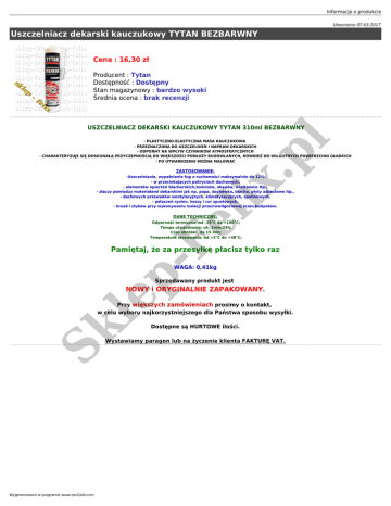 Informacje o produkcie Utworzono 07-03-2017 Uszczelniacz dekarski kauczukowy TYTAN BEZBARWNY Cena : 16,30 zł Producent : Tytan Dostępność : Dostępny Stan magazynowy : bardzo wysoki Średnia ocena : brak recenzji .p l USZCZELNIACZ DEKARSKI KAUCZUKOWY TYTAN 310ml BEZBARWNY - PLASTYCZNO-ELASTYCZNA MASA KAUCZUKOWA - PRZEZNACZONA DO USZCZELNIEŃ I NAPRAW DEKARSKICH - ODPORNY NA WPŁYW CZYNNIKÓW ATMOSFERYCZNYCH - CHARAKTERYZUJE SIĘ DOSKONAŁĄ PRZYCZEPNOŚCIĄ DO WIĘKSZOŚCI PODŁOŻY BUDOWLANYCH, RÓWNIEŻ DO WILGOTNYCH POWIERZCHNI GŁADKICH - PO UTWARDZENIU MOŻNA MALOWAĆ ZASTOSOWANIE: Fe lix -Uszczelnianie, wypełnianie fug o ruchomości maksymalnie do 12%: - w przeciekających pokryciach dachowych, - elementów opierzeń blacharskich,kominów, okapów, wiatrownic itp., - złączy pomiędzy materiałami dekarskimi jak np. papa, dachówka, blacha, płyty azbestowe itp., - dachowych przewodów wentylacyjnych, klimatyzacyjnych, spalinowych, - połączeń rynien, koszy i rur spustowych, - bruzd i styków przy wykonywaniu izolacji przeciwwilgociowej ścian budynków. DANE TECHNICZNE: Odporność termiczna: od -25°C do +100°C; Tempo utwardzania: ok. 2mm/24h; Czas obróbki: do 15 min; Temperatura stosowania: od +5°C do +40°C; Sk le p- Pamiętaj, że za przesyłkę płacisz tylko raz WAGA: 0,41kg Sprzedawany produkt jest NOWY i ORYGINALNIE ZAPAKOWANY. Przy większych zamówieniach prosimy o kontakt, w celu wyboru najkorzystniejszego dla Państwa sposobu wysyłki. Dostępne są HURTOWE ilości. Wystawiamy paragon lub na życzenie klienta FAKTURĘ VAT. Wygenerowano w programie www.oscGold.com
