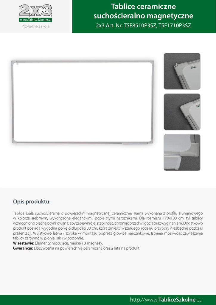 Tablice ceramiczne suchościeralno magnetyczne Przyjazna szkoła 2x3 Art. Nr: TSF8510P3SZ, TSF1710P3SZ Opis produktu: specjaliści w komunikacji wizualnej Tablica biała suchościeralna o powierzchni magnetycznej ceramicznej. Rama wykonana z profilu aluminiowego w kolorze srebrnym, wykończona eleganckimi, popielatymi narożnikami. Dla rozmiaru 170x100 cm, tył tablicy wzmocniono blachą ocynkowaną, aby zapewnić jej stabilność, chroniąc przed wilgocią oraz wyginaniem. Dodatkowo produkt posiada wygodną półkę o długości 30 cm, która zmieści wszelkiego rodzaju przybory niezbędne podczas prezentacji. Wyjątkowo łatwa i szybka w montażu poprzez głowice narożnikowe. Istnieje możliwość zawieszenia tablicy zarówno w pionie, jak i w poziomie. W zestawie: Elementy mocujące, marker i 3 magnesy. Gwarancja: Dożywotnia na powierzchnię ceramiczną oraz 2 lata na produkt. http://www.TabliceSzkolne.eu Specyfikacja techniczna: 2x3 Art. Nr Tablice ceramiczne suchościeralno magnetyczne TSF8510P3SZ Powierzchnia Wymiary tablicy (A x B) Wzmocnienie Waga TSF1710P3SZ suchościeralna ceramiczna 100 x 85 cm 170 x 100 cm nie tak 8,10 kg 16,50 kg Rama aluminium Półka tak ( dł. 30 cm ) Montaż w pionie lub poziomie tak Sposób montażu montaż przez głowice narożnikowe plastikowe w kolorze popielatym Gwarancja dożywotnia na powierzchnię ceramiczną oraz 2 lata na produkt B Narożniki A 2x3 S.A. 73-231 Krzęcin, ul. Słoneczna 3, Polska [i]: 801 23 00 23 [t]: +48 95 765 3848 [f]: +48 95 765 3850 [e]: [email protected] [w]: www.2x3.eu