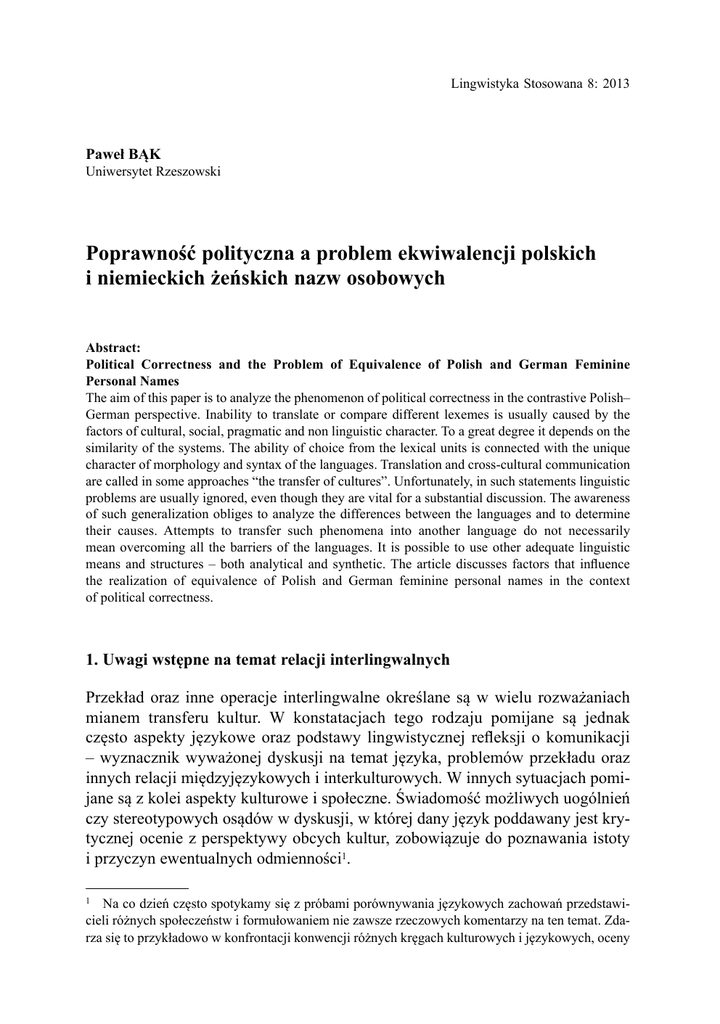 Lingwistyka Stosowana 8: 2013 Paweł BĄK Uniwersytet Rzeszowski Poprawność polityczna a problem ekwiwalencji polskich i niemieckich żeńskich nazw osobowych Abstract: Political Correctness and the Problem of Equivalence of Polish and German Feminine Personal Names The aim of this paper is to analyze the phenomenon of political correctness in the contrastive Polish– German perspective. Inability to translate or compare different lexemes is usually caused by the factors of cultural, social, pragmatic and non linguistic character. To a great degree it depends on the similarity of the systems. The ability of choice from the lexical units is connected with the unique character of morphology and syntax of the languages. Translation and cross-cultural communication are called in some approaches “the transfer of cultures”. Unfortunately, in such statements linguistic problems are usually ignored, even though they are vital for a substantial discussion. The awareness of such generalization obliges to analyze the differences between the languages and to determine their causes. Attempts to transfer such phenomena into another language do not necessarily mean overcoming all the barriers of the languages. It is possible to use other adequate linguistic means and structures – both analytical and synthetic. The article discusses factors that influence the realization of equivalence of Polish and German feminine personal names in the context of political correctness. 1. Uwagi wstępne na temat relacji interlingwalnych Przekład oraz inne operacje interlingwalne określane są w wielu rozważaniach mianem transferu kultur. W konstatacjach tego rodzaju pomijane są jednak często aspekty językowe oraz podstawy lingwistycznej refleksji o komunikacji – wyznacznik wyważonej dyskusji na temat języka, problemów przekładu oraz innych relacji międzyjęzykowych i interkulturowych. W innych sytuacjach pomijane są z kolei aspekty kulturowe i społeczne. Świadomość możliwych uogólnień czy stereotypowych osądów w dyskusji, w której dany język poddawany jest krytycznej ocenie z perspektywy obcych kultur, zobowiązuje do poznawania istoty i przyczyn ewentualnych odmienności1. 1 Na co dzień często spotykamy się z próbami porównywania językowych zachowań przedstawicieli różnych społeczeństw i formułowaniem nie zawsze rzeczowych komentarzy na ten temat. Zdarza się to przykładowo w konfrontacji konwencji różnych kręgach kulturowych i językowych, oceny 28 PAWEŁ BĄK Na przykładzie relacji między językami niemieckim i polskim w krótkich rozważaniach poruszę wybrane problemy dotyczące realizacji ekwiwalencji żeńskich nazw osobowych w obydwu językach w kontekście poprawności politycznej. Są to, dokładniej rzecz ujmując, czynniki, które mają wpływ na uwzględnianie kategorii rodzaju gramatycznego. Moim zdaniem aspekty te nadal domagają się dyskusji. Za punkt wyjścia i perspektywę spojrzenia obieram język niemiecki. Rozważania te traktuję jednak jako asumpt do refleksji w szerszym kontekście, w którym możliwe jest bardziej wyczerpujące omówienie tej obszernej problematyki na podstawie materiału językowego i wyników badań metodą ankiety. 2. Ekwiwalencja – kategoria leksykalna i gramatyczna Pojęcie ekwiwalencji to kategoria pochodząca m.in. z obszaru językoznawstwa kontrastywnego, translatoryki, przekładoznawstwa. Omówione zostało dotychczas w licznych rozważaniach, definiowane i klasyfikowane jest w odniesieniu do wielu aspektów w relacji przekładu i konfrontacji różnorakich zjawisk językowych. Pozwolę sobie wspomnieć jedynie o ekwiwalencji rozumianej jako relacja równości (przez przedstawicieli Lipskiej Szkoły, takich jak: Gert Jäger, Otto Kade, Albrecht Neubert (O. Kade 1963, G. Jäger, A. Neubert 1982), jako relacja równowartościowości (przez Fritza Paepckego (F. Paepcke 1986b)) czy jako relacja wymienności jednostek językowych w dwu językach – w rozumieniu Horsta Turka (H. Turk 1989). W swych rozważaniach mam na myśli możliwość pojawiania się stosownych form językowych w dwóch językach w porównywalnych ze sobą kontekstach. Odpowiada to mniej więcej koncepcji ekwiwalencji autorstwa Eugenio Coseriu, który w tym kontekście mówi: Pytaniem jakie musi sobie postawić tłumacz nie jest po prostu ‘Jak nazywa się tę samą rzecz w języku B?’, lecz raczej ‘Jak mówi się to samo w języku B w takiej samej sytuacji i w takich samych warunkach użycia języka? (E. Coseriu 1997, cyt. za: U. Dąmbska-Prokop 2000: 70). Ekwiwalencja jednostek leksykalnych w dwóch językach oparta jest na pewnym wspólnym mianowniku dotyczącym np. denotacji, konotacji, stylu, funkcji, formy czy wymiaru pragmatycznego, tzn. wyrażenia mogą być rozpatrywane jako ekwiwalentne pod pewnym i bardzo rzadko – bądź nigdy – pod każdym możliwym względem. W rozważaniach poświęconych ekwiwalencji nazw osobowych2 sferę leksykalną można by traktować – np. w porównaniu do aspektów morfologii etykiety, komentowania grzeczności werbalnej i niewerbalnej itp. Lingwistyka dostarcza merytorycznych argumentów także do dyskusji na temat relacji interkulturowych. 2 W omawianym przypadku dotyczy nazw zawodu, określeń statusu osoby, m.in. sprawowanej funkcji, piastowanego stanowiska, posiadanego tytułu czy stopnia naukowego. POPRAWNOŚĆ POLITYCZNA A PROBLEM EKWIWALENCJI... 29 – jako kwestie „bardziej merytoryczne”, dotyczą tu bowiem nazywania profesji, zawodu czy statusu społecznego. W tym miejscu nasuwa się pytanie o konieczność czy w ogóle możliwość uwzględniania kategorii rodzaju gramatycznego w dyskusji na temat ekwiwalencji. Wobec współczesnych wyzwań obecności człowieka w dyskursach uważam jednak uwzględnienie tej kategorii za jak najbardziej uzasadnione, zwłaszcza że w centrum uwagi pozostaje tu ona jako cecha konkretnych wypowiedzi, tj. właściwość wyrażeń, które zaistniały w parol