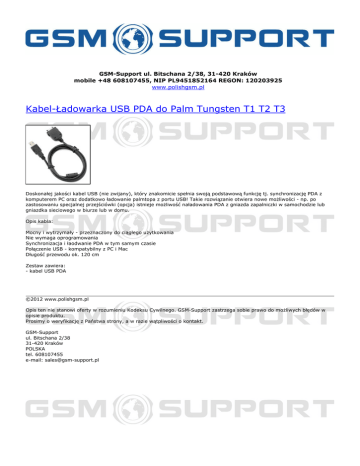 GSM-Support ul. Bitschana 2/38, 31-420 Kraków mobile +48 608107455, NIP PL9451852164 REGON: 120203925 www.polishgsm.pl Kabel-Ładowarka USB PDA do Palm Tungsten T1 T2 T3 Doskonałej jakości kabel USB (nie zwijany), który znakomicie spełnia swoją podstawową funkcję tj. synchronizację PDA z komputerem PC oraz dodatkowo ładowanie palmtopa z portu USB! Takie rozwiązanie otwiera nowe możliwości - np. po zastosowaniu specjalnej przejściówki (opcja) istnieje możliwość naładowania PDA z gniazda zapalniczki w samochodzie lub gniazdka sieciowego w biurze lub w domu. Opis kabla: Mocny i wytrzymały - przeznaczony do ciągłego użytkowania Nie wymaga oprogramowania Synchronizacja i łaodwanie PDA w tym samym czasie Połączenie USB - kompatybilny z PC i Mac Długość przewodu ok. 120 cm Zestaw zawiera: - kabel USB PDA ©2012 www.polishgsm.pl Opis ten nie stanowi oferty w rozumieniu Kodeksu Cywilnego. GSM-Support zastrzega sobie prawo do możliwych błędów w opisie produktu. Prosimy o weryfikację z Państwa strony, a w razie wątpliwości o kontakt. GSM-Support ul. Bitschana 2/38 31-420 Kraków POLSKA tel. 608107455 e-mail: [email protected] Powered by TCPDF (www.tcpdf.org)