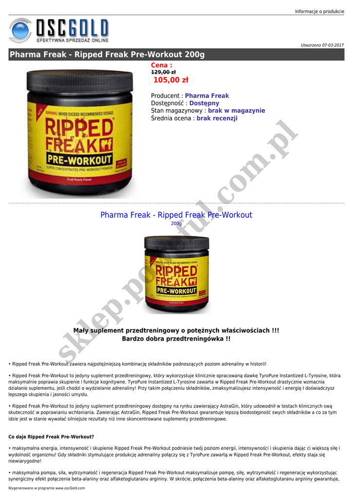 Informacje o produkcie Utworzono 07-03-2017 Pharma Freak - Ripped Freak Pre-Workout 200g Cena : 129,00 zł 105,00 zł .c om .p l Producent : Pharma Freak Dostępność : Dostępny Stan magazynowy : brak w magazynie Średnia ocena : brak recenzji ul Pharma Freak - Ripped Freak Pre-Workout sk le p. po w ef 200g Mały suplement przedtreningowy o potężnych właściwościach !!! Bardzo dobra przedtreningówka !! • Ripped Freak Pre-Workout zawiera najpotężniejszą kombinację składników podnoszących poziom adrenaliny w historii! • Ripped Freak Pre-Workout to jedyny suplement przedtreningowy, który wykorzystuje klinicznie opracowaną dawkę TyroPure Instantized L-Tyrosine, która maksymalnie poprawia skupienie i funkcje kognitywne. TyroPure Instantized L-Tyrosine zawarta w Ripped Freak Pre-Workout drastycznie wzmacnia działanie suplementu, jeśli chodzi o wydzielanie adrenaliny! Przy takim połączeniu składników, zmaksymalizujesz intensywność i energię I doświadczysz lepszego skupienia i jasności umysłu. • Ripped Freak Pre-Workout to jedyny suplement przedtreningowy dostępny na rynku zawierający AstraGin, który udowodnił w testach klinicznych swą skuteczność w poprawianiu wchłaniania. Zawierając AstraGin, Ripped Freak Pre-Workout gwarantuje lepszą biodostępność swych składników a co za tym idzie jest w stanie wywołać silniejsze rezultaty niż inne skoncentrowane suplementy przedtreningowe. Co daje Ripped Freak Pre-Workout? • maksymalna energia, intensywność i skupienie Ripped Freak Pre-Workout podniesie twój poziom energii, intensywności i skupienia dając ci większą siłę i wydolność organizmu! Gdy składniki stymulujące produkcję adrenaliny połączy się z TyroPure zawartą w Ripped Freak Pre-Workout, efekty staja się niewiarygodne! • maksymalna pompa, siła, wytrzymałość i regeneracja Ripped Freak Pre-Workout maksymalizuje pompę, siłę, wytrzymałość i regenerację wykorzystując synergiczny efekt połączenia beta-alaniny oraz alfaketoglutaranu argininy. W skrócie, połączenia beta-alaniny oraz alfaketoglutaranu argininy gwarantuje, Wygenerowano w programie www.oscGold.com że twoje mięśnie będą nastawione na maksymalną pompę, wydajność, wzrost i regenerację! • maksymalna biodostępność skoncentrowanych składników Ripped Freak Pre-Workout zapewnia lepsze wchłanianie i biodostępność swych skłądników niż jakikolwiek inny suplement dostępny na rynku dzięki wykorzystaniu AstraGin - substancji poprawiającej wchłanianie o klinicznie udokumentowanej skuteczności. Mówiąc wprost, AstraGin wzmacnia efekty działania innych składnikówRipped Freak Pre-Workout . Skład: Formuła Ripped Freak 5,024 mg Tyrozyna Beta-alanina Kofeina bezwodna Alfa ketoglutaran argininy Wyciąg z liści oliwnych (zawierający oleuropeiny) Traganek błoniasty Dawkowanie: Przykładowe recenzje Freaka : - Freak jest zajebisty - to jest to !! jakie treningi !! /Wojtek R./ .c om .p l Zmieszaj 1 – 2 miarki z 250 do 500 ml zimnej wody i wypij na 30 do 45 minut przed treningiem. Ze względy na ekstremalną siłę, zaleca się oszacowanie tolerancji organizmu na suplement poprzez rozpoczęcie dawkowania od 1 lub 1½ miarki przed przejściem do pełnej dawki 2 miarek. RIPPED FREAK PRE-WORKOUT jest tak silny, że dla wielu osób 1 lub 1½ miarki może się okazać być wystarczające do wywołania maksymalnych efektów. - Biore Freaka tylko przy ciężkich treningach, lub tylko kiedy mam ochote na pobicie moich maxymalnych obciażen /Patryk R./ sk le p. po w ef ul - Dla mnie jeden z najlepszych - 2 dawki trzymią mnie 9 godzin !! Zmniejszylem do 1 dawki - treningi sa dalej dobre, a sajdów wtedy nie ma /MS/